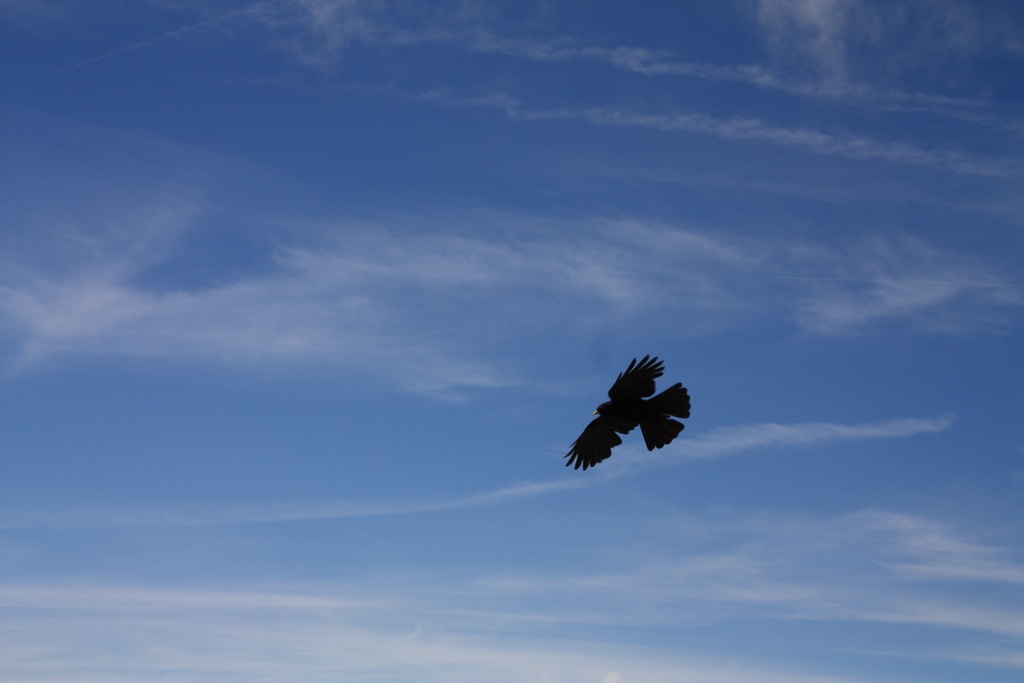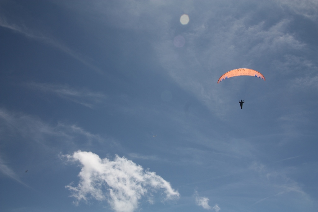 Bei einer kleinen Stärkung auf der Terrasse des Alten Berggasthofs beobachten wir neben den Dohlen auch noch einen Paraglider, der das Geschehen von noch etwas höher oben genießt.