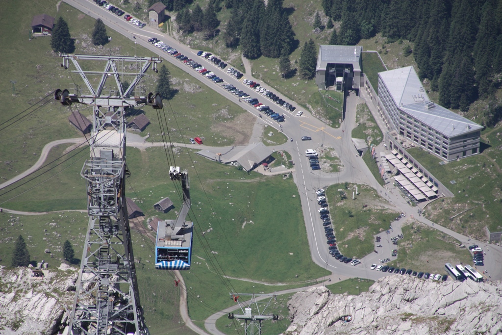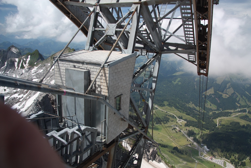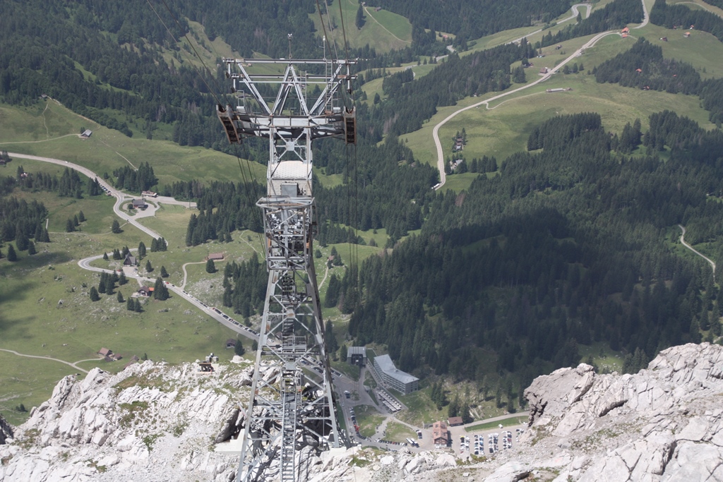 Die Aussicht bei der Fahrt ins Tal bleibt ebenfalls beeindruckend mit Blick auf die Almen unterhalb des Felsmassivs. Die Seilbahn wird durch einen einzigen Mast gestützt, an diesem hält die Gondel und der Gondelführer lässt eine Bergsteigerin zusteigen, die in einem Kabäuschen im Mast gewartet hat.