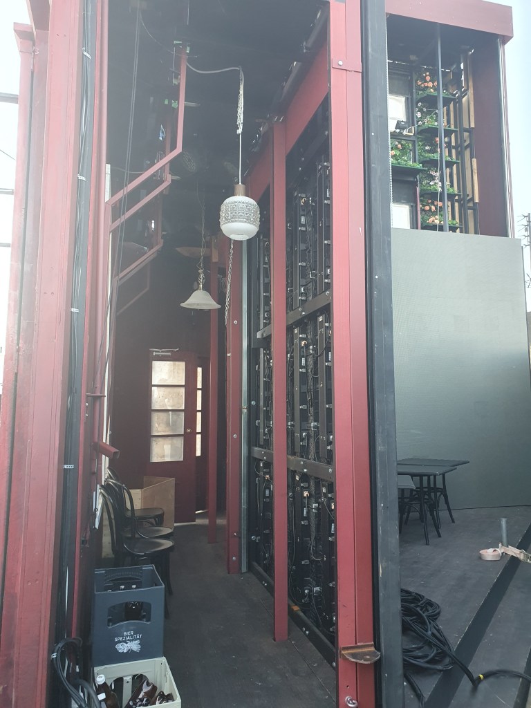 Dann ging es wegen der anhaltenden Hitze in den Schatten der Kulissen, die links, rechts und im hinteren Bereich der 3600 qm großen Bühne sozusagen zwischengeparkt sind. Beeindruckend ist das Gewicht der Kulissenteile mit mehreren Tonnen, die von den Bühnenarbeitern und mindestens einer Bühnenarbeiterin manuell auf Rollen exakt auf ihren im Stück zugeteilten Platz geschoben werden.