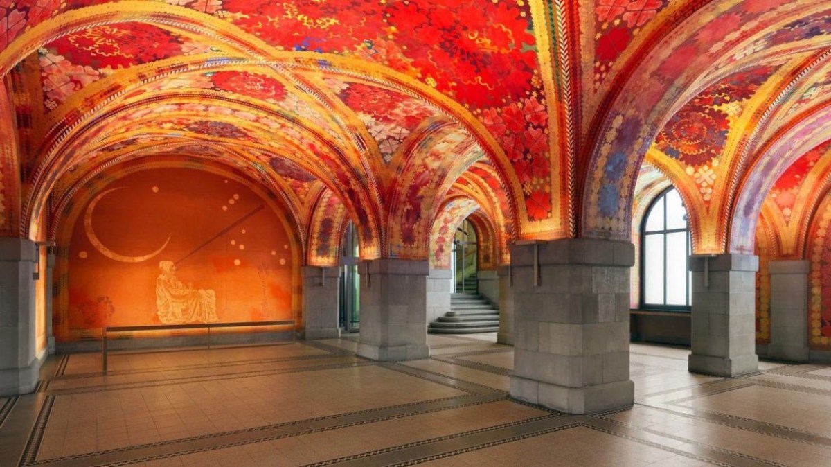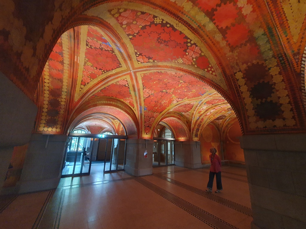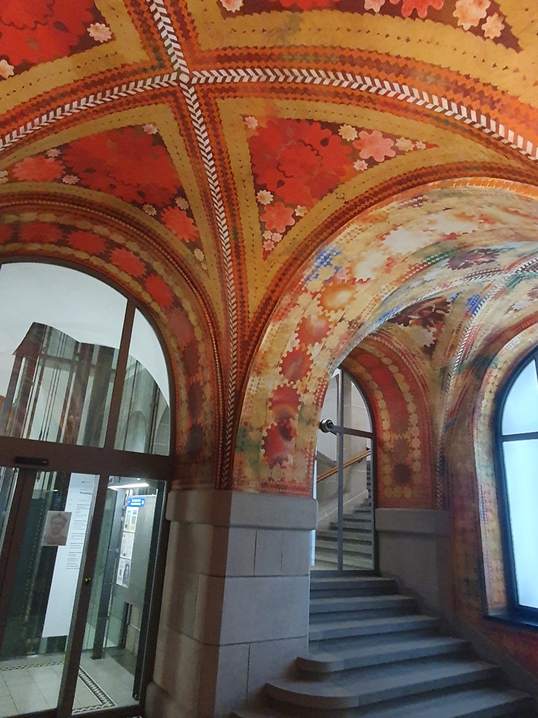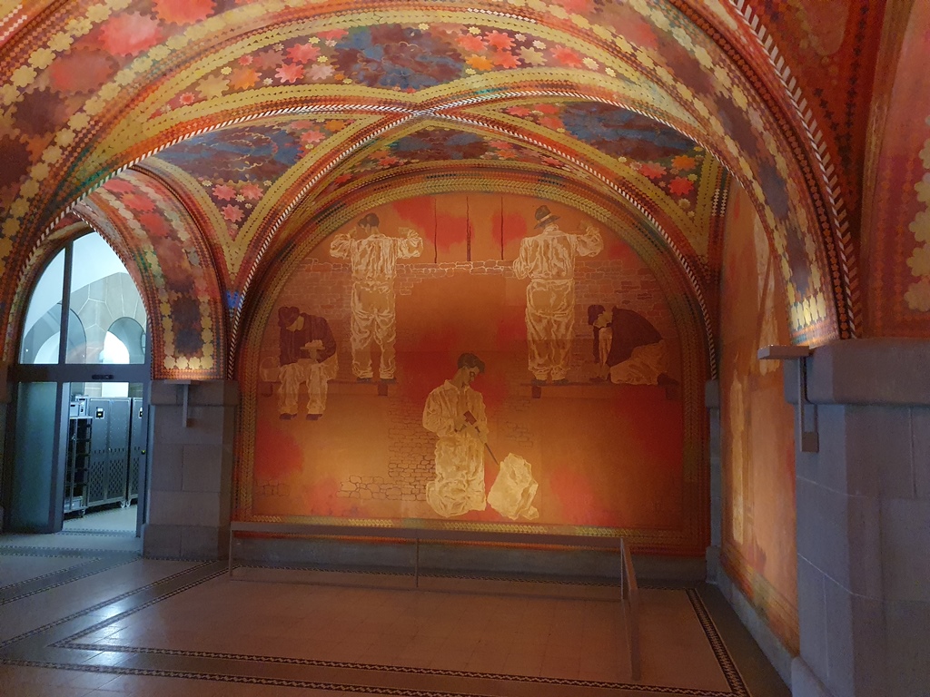 Nach der Renovierung 2019 und 2020 erstrahlen die Fresken wieder im originalen Glanz und locken tausende Besucher pro Jahr aus der ganzen Welt in die Eingangshalle der Polizeiwache.