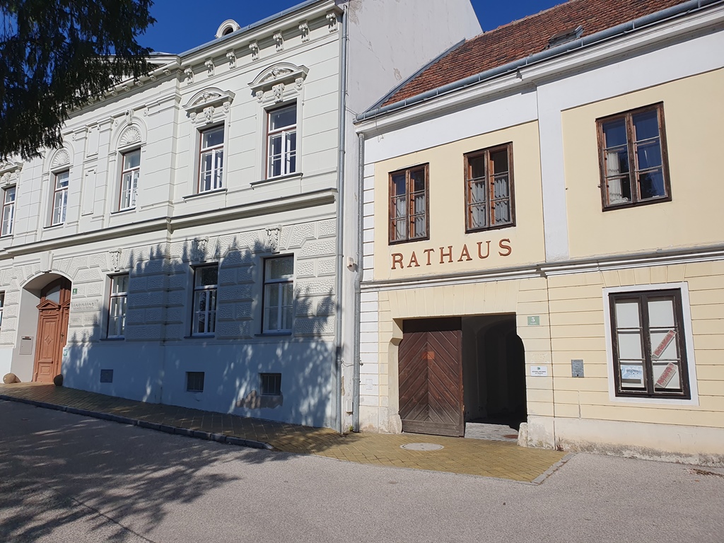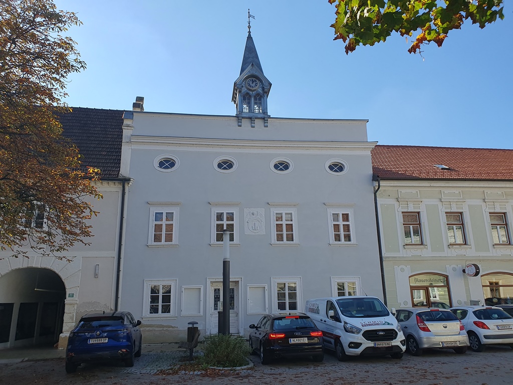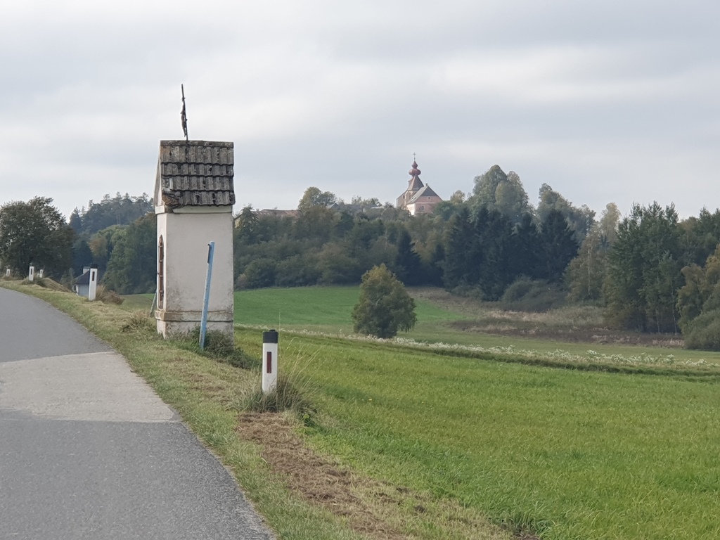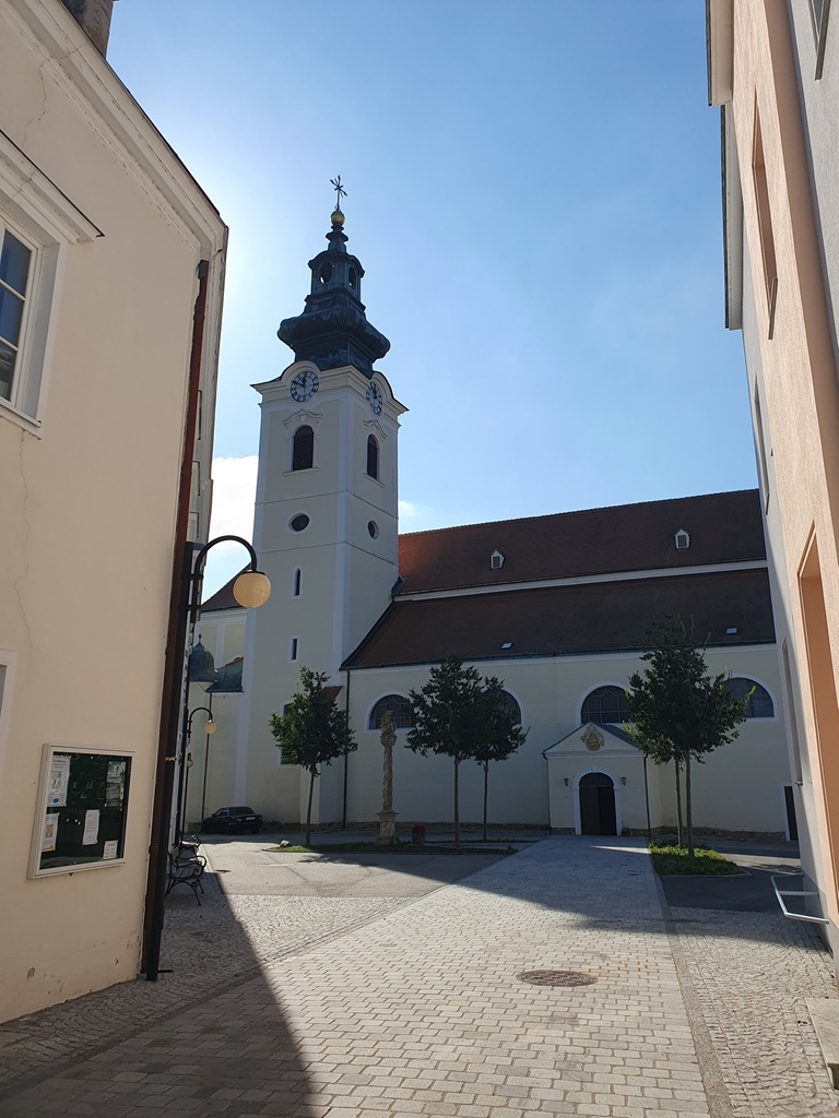 Da ich den Weinbauort Kirchberg am Wagram noch nie besucht habe, sticht mir umso mehr der Hügel, wo die Wallfahrtskirche Maria Trost über dem Ort thront, ins Auge und mache daher meine erste richtige Pause. Ich marschiere vom Marktplatz mit vielen wunderschönen Bürgerhäusern aus der Übergangszeit von der Renaissance zum Barock und wo auch gerade der wöchentliche Naschmarkt zu Ende geht, zur Kirche hinauf.