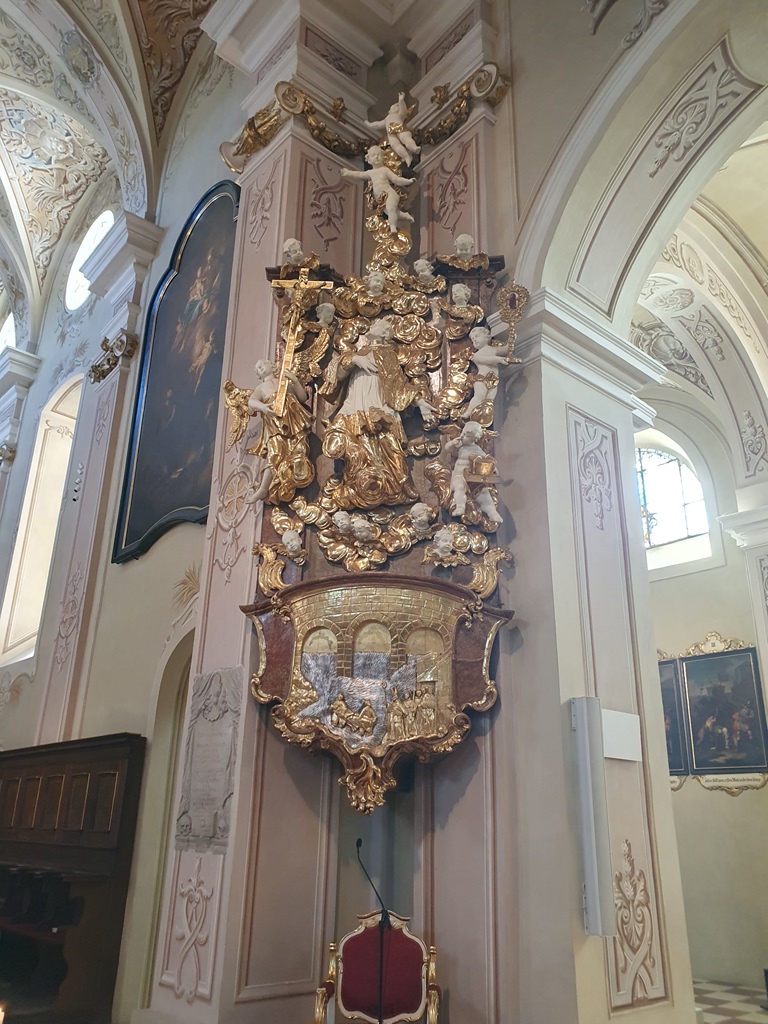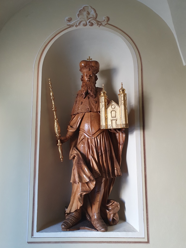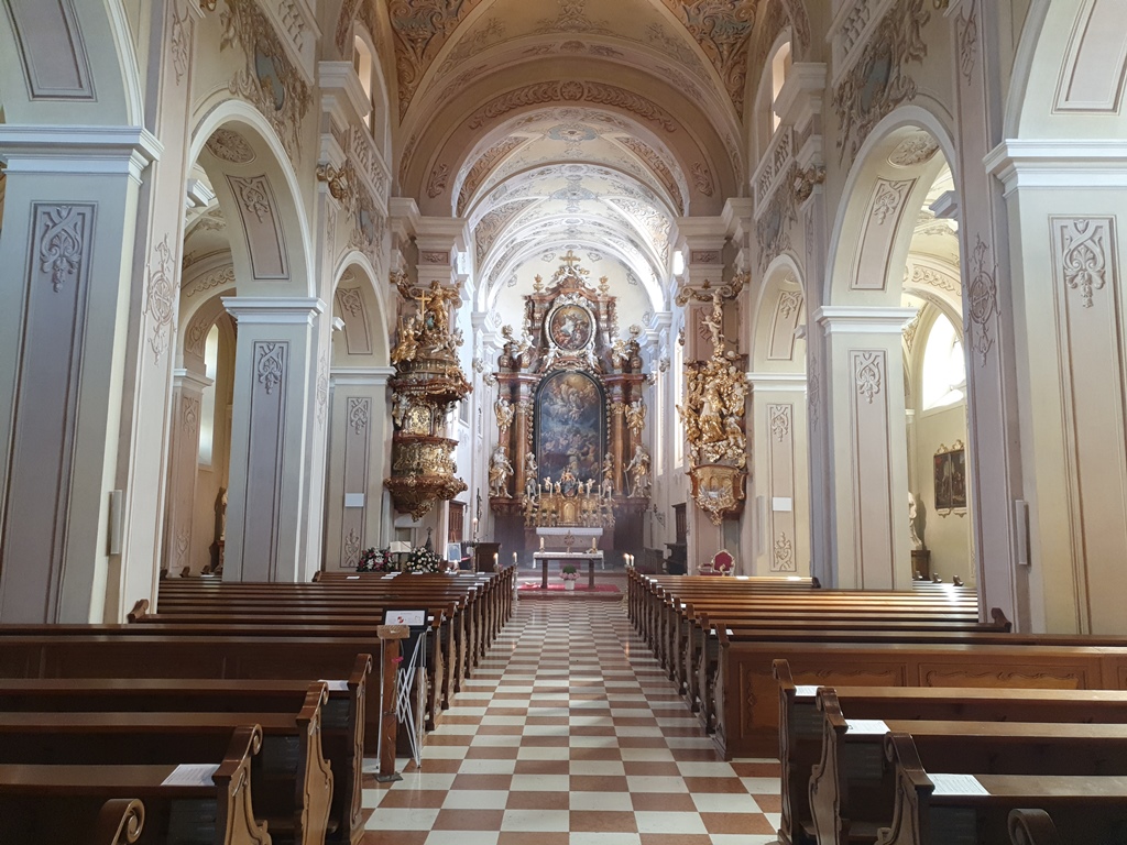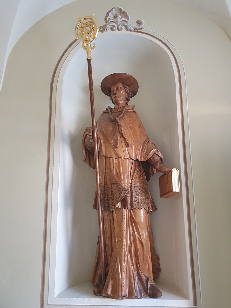 Der Innenraum der ursprünglich gotischen Kirche wurde von der Künstlerfamilie Carlone Anfang des 18. Jahrhunderts barockisiert. Beim nördlichen Kircheneingang fallen zwei herrliche jeweils aus einem Stück Lindenholz geschnitzte Barockfiguren auf. Es sind der hl. Leopold mit seiner Stiftung Klosterneuburg auf dem Arm und gegenüber der hl. Karl Borromäus. Beide Statuen wirken auf mich gar nicht barock überladen, sondern beinahe schlicht und modern.