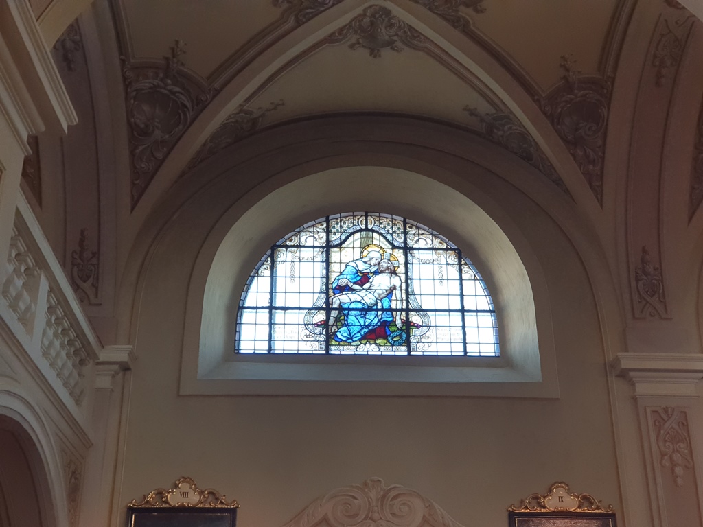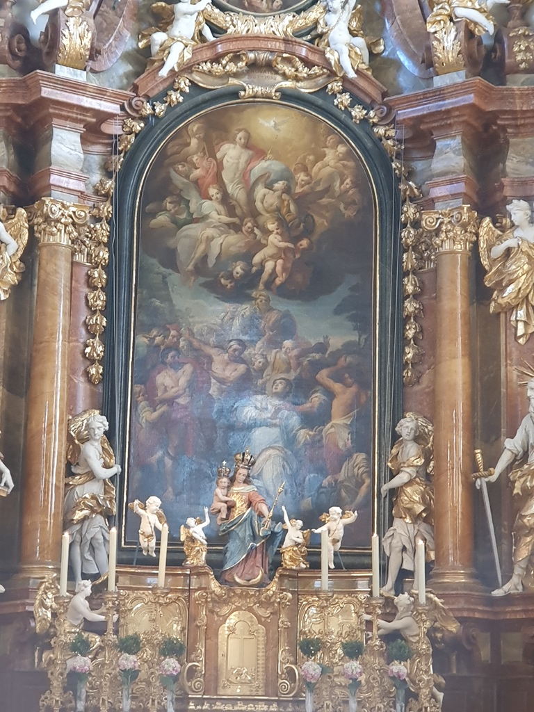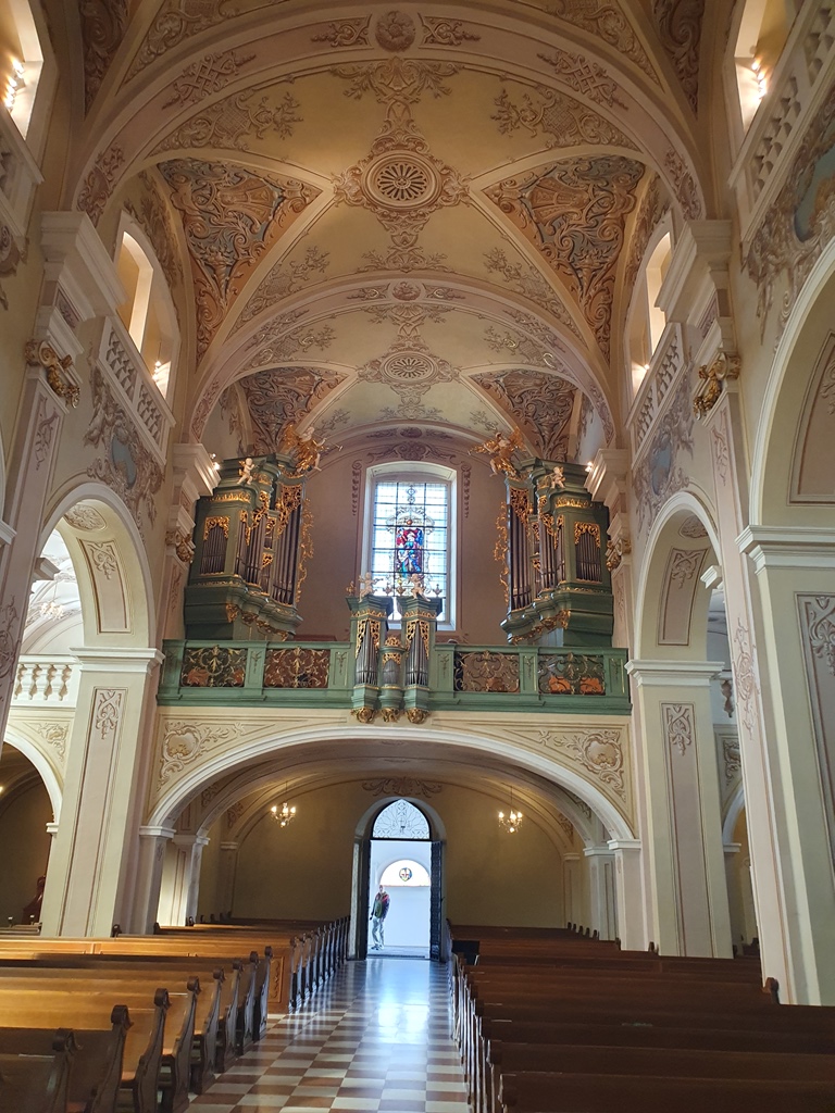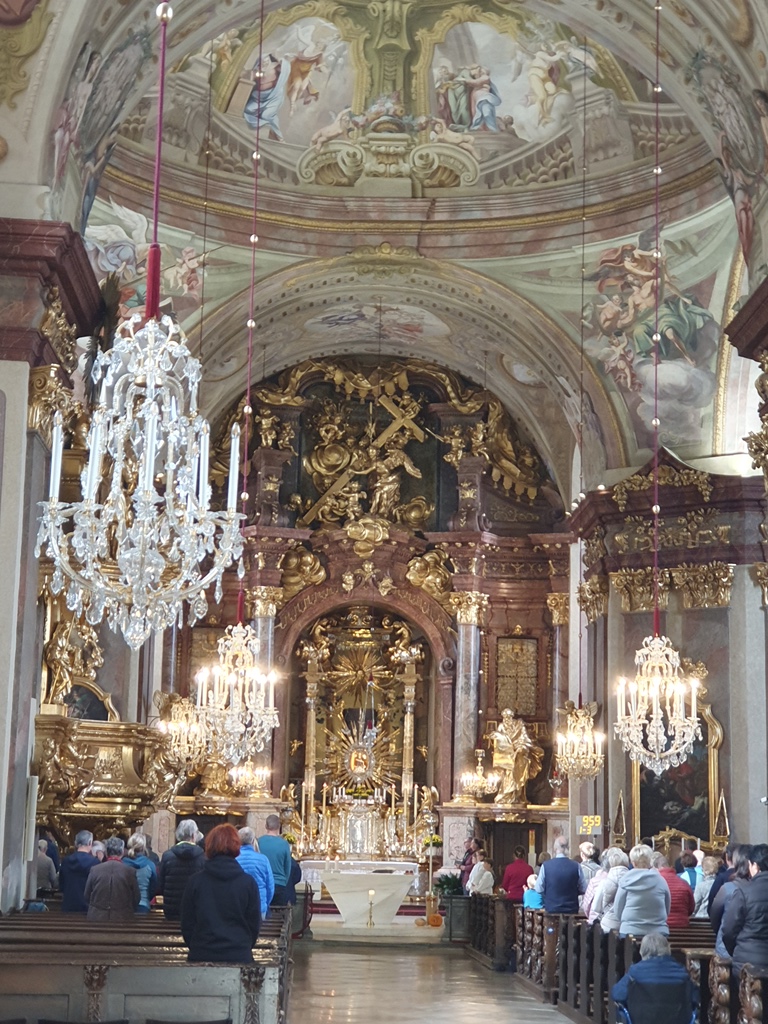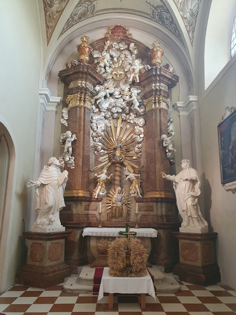 Der Innenraum der ursprünglich gotischen Kirche wurde von der Künstlerfamilie Carlone Anfang des 18. Jahrhunderts barockisiert. Beim nördlichen Kircheneingang fallen zwei herrliche jeweils aus einem Stück Lindenholz geschnitzte Barockfiguren auf. Es sind der hl. Leopold mit seiner Stiftung Klosterneuburg auf dem Arm und gegenüber der hl. Karl Borromäus. Beide Statuen wirken auf mich gar nicht barock überladen, sondern beinahe schlicht und modern.