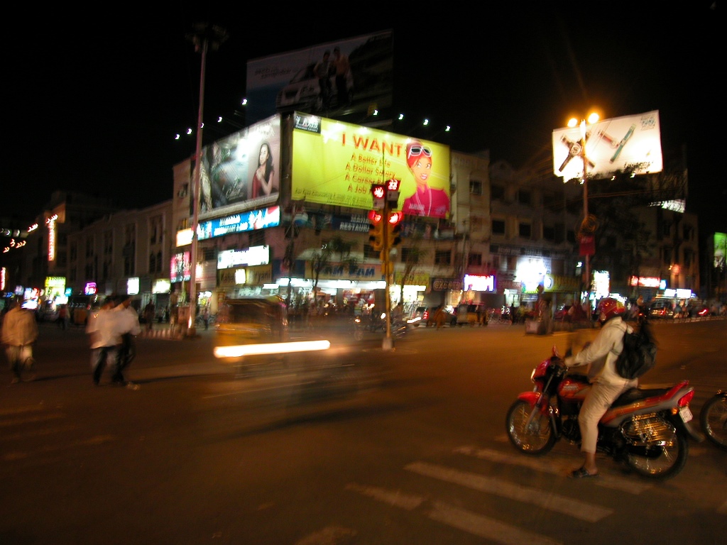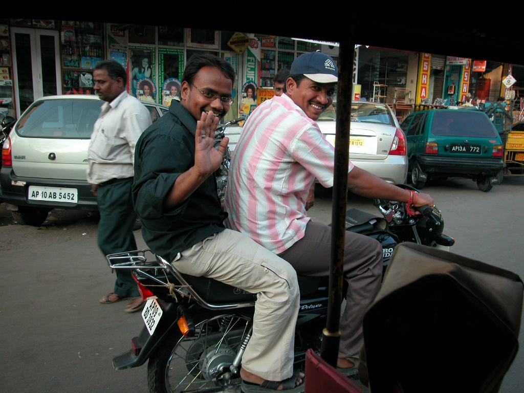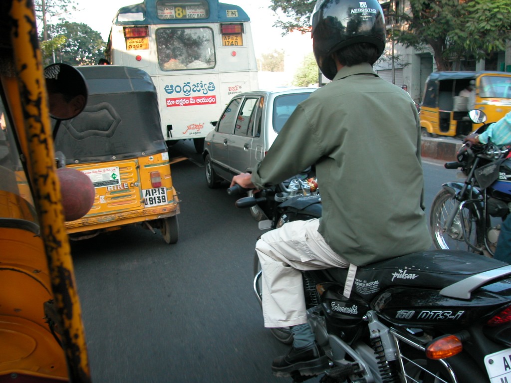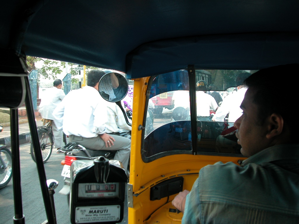 Mein Kollege hilft mir ein Taxi zu finden und so sitze ich auf einmal in einem der gelben Dreiradrikschas, die Preisverhandlungen sind lustig, zuerst will er 120 Rupien, dann versteht er erst den Hotelnamen und will auf einmal 180 Rp, er meint das wäre weiter. Ich glaube aber, der denkt sich, wer in diesem Hotel wohnt, kann auch mehr zahlen. Wir einigen uns auf 150 Rp und es geht los. Nun bin ich hautnah dabei, noch mehr mittendrin, ich habe das Gefühl mein Fahrer fährt den Fußgängern beinahe über die Zehen, zum vorderen Fahrzeug wird prinzipiell bis auf wenige Zentimeter aufgeschlossen. In der Zwischenzeit bin ich aber schon abgehärtet und kralle mich nur mehr ganz selten fest, wenn ich z.B. glaube, dass jetzt gleich der Fahrradfahrer nebenan fliegt, weil wir bei ihm eingehängt haben.