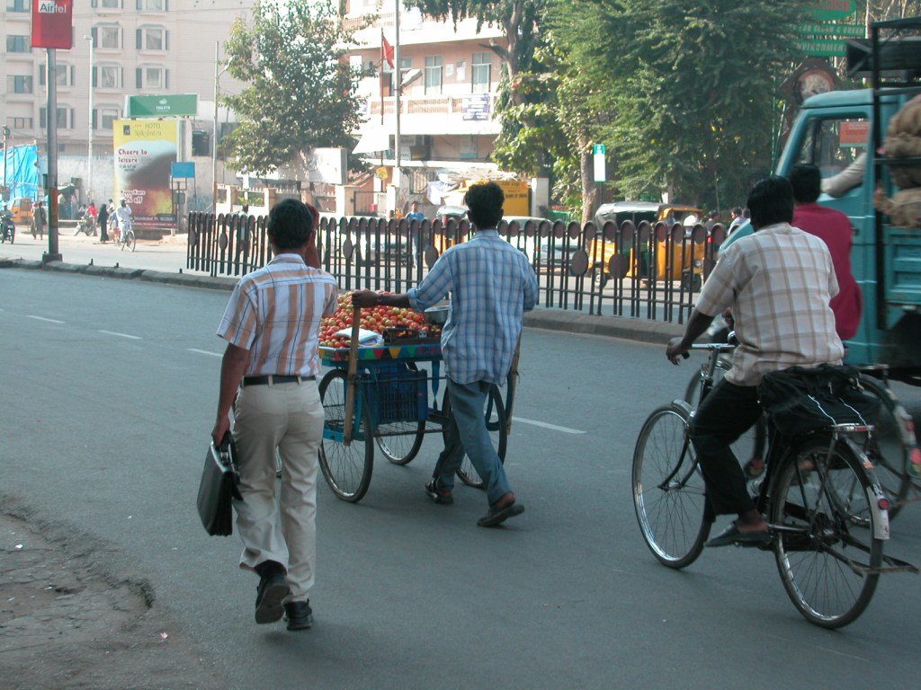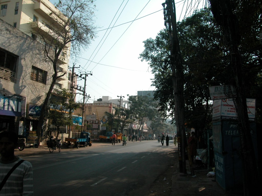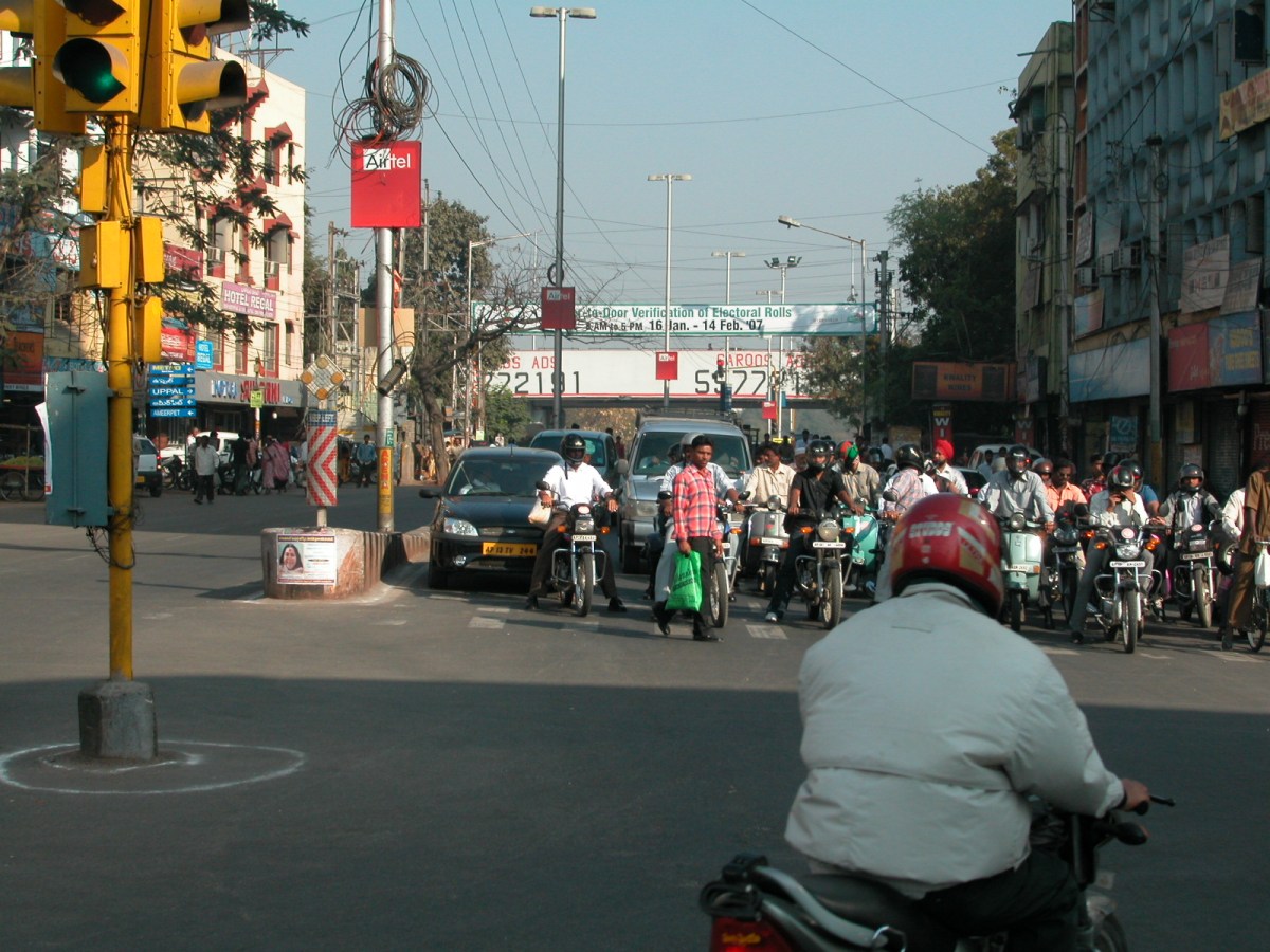 Die Ausfahrt vom Siemens-Parkplatz geht leicht bergab und mündet in einer der größeren Straßen von Hyderabad und wir müssen gleich auf die andere Richtungsfahrbahn, und das über 5 Spuren ohne daß der fließende Verkehr stoppt. Wie durch ein Wunder kommen wir ebenfalls ohne stehen zu bleiben durch.