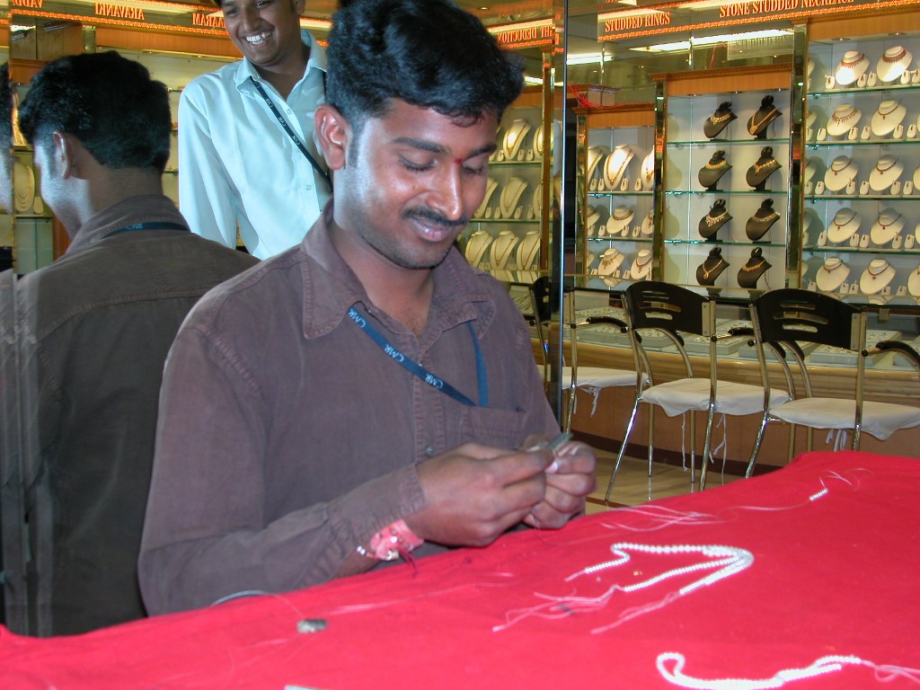 Nachdem Sightseeing nicht geht, schaue ich mir das Shoppingcenter für Perlen, Juwelen und Kleidung in unserem Haus an. Ich finde für meine Damen sicher etwas dort. Gleich werde ich höflich von allen Seiten gefragt, was ich suche. Nachdem ich erkläre, nur einmal schauen zu wollen, lässt man mich aber in Ruhe. Es gibt Stoffe, Saris (die besten kommen aus Italien!) und natürlich Schmuck. Hyderabad ist für seine Perlenverarbeitung bekannt, ich suche ein bisschen und habe schon bald etwas für meine Girls gefunden. Die Perlen sind aus China, die Silber- und Goldfassungen dazu werden hier in Hyderabad gemacht. Ich bin sicher, es wird ihnen gefallen.
