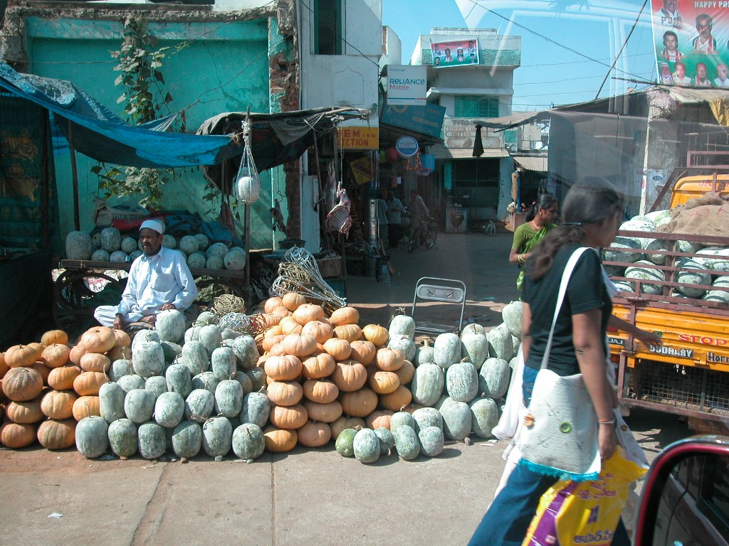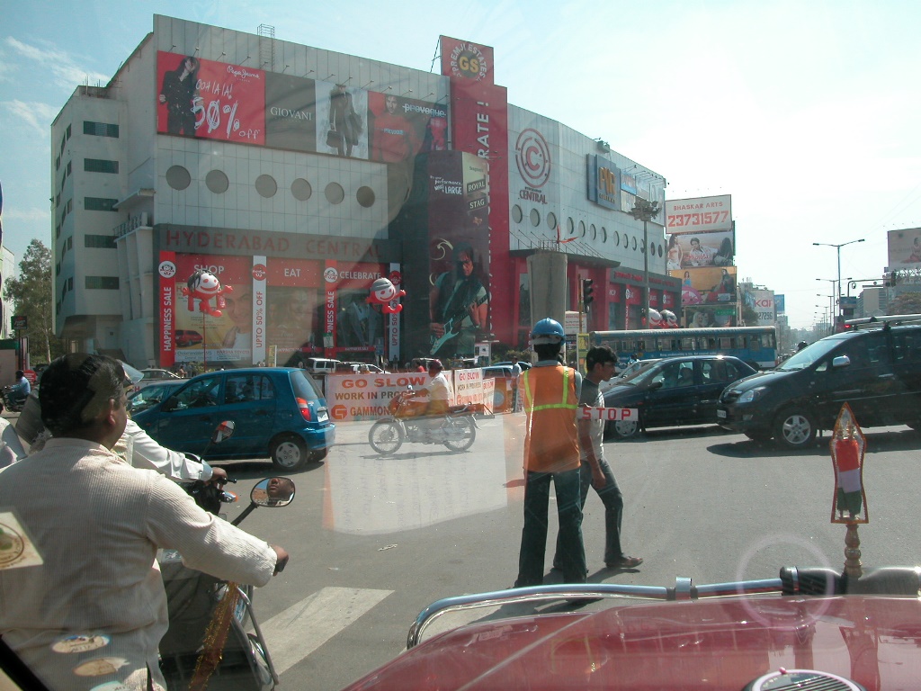 Um ½ 11 war es dann so weit, ein großer Geländewagen mit ganz kleinem Fahrer steht bereit und wir machen uns auf den Weg. Als ich ihm als erste Sehenswürdigkeit den Metro Cash&Cary vorschlage ist er zwar verwundert, aber wir machen uns gemeinsam auf die Suche. Nach einigem Herumfragen und einer falschen Runde im Kreisverkehr finden wir die richtige Strasse, es geht stadtauswärts. Auf einmal ist fast mehr Verkehr als in der Rushhour unter der Woche. Mein Fahrer erklärt mir, dass viele Menschen aus Hyderabad am Sonntag hier herausfahren (das ist auch die Ausfahrtsstraße Richtung Bombay), da sie einkaufen wollen. Die Marktstände tauchen schon auf und der Verkehr wird immer chaotischer, dass sich sogar mein Fahrer manchmal wundert. Wir schlängeln uns im Schritttempo durch Fußgänger, Busse, Lastwagen und Mopeds durch, bis wir das Hinweisschild zum Metro sehen.