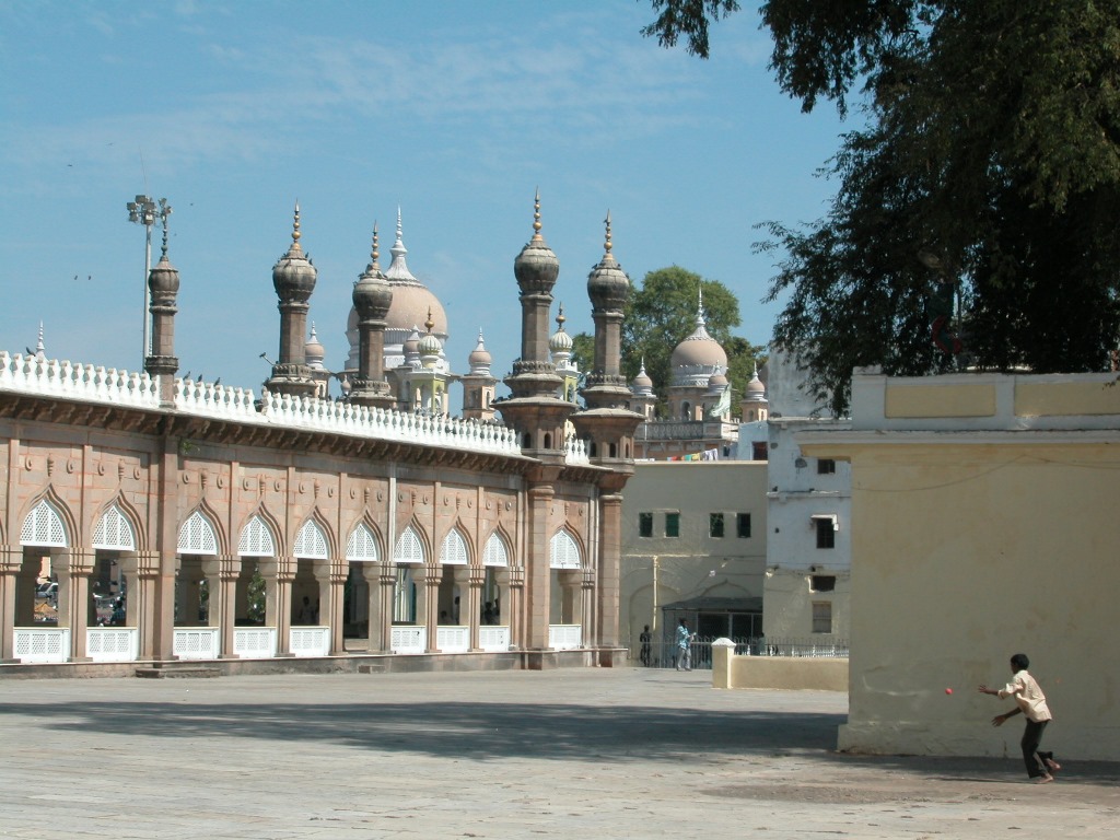 Wir fahren dann weiter Richtung Charminar, dort möchte ich noch zum Laad Bazar und der Mecca Masjid, der größten Moschee von Hyderabad. Mein Fahrer schlängelt sich durch die Gassen, es ist wieder total beeindruckend dort hin zu kommen. Er sucht einen Parkplatz im angrenzenden Krankenhausgelände und ich mache mich auf den Weg in den Bazar. Sofort stürzen sich die Händler, das sind Jugendliche und Kinder, auf mich, ich bin total umringt. Sie zeigen mir jede Menge Bangles (Arm- und Halsbänder aus Perlen und Glas), ich kaufe zwei Armbänder für meine Girls, und jetzt geht’s erst richtig los. Im Endeffekt gehe ich dann mit weiteren 6 Armbändern und am Ende 6 Ketten Richtung Moschee. Steht ja auch im Reiseführer, dass man sicher mehr kauft als man eigentlich will.
