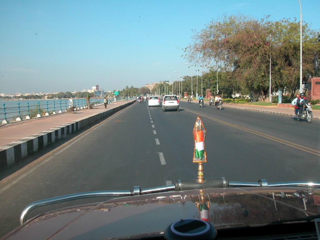 Am Rückweg fahren wir den üblichen Weg Richtung Hotel, mein Fahrer erklärt mir, warum die Straße entlang des Sees Tank Bund Road heißt. Er zeigt mir einen Panzer (Tank) der auf einem Sockel neben der Straße steht. Vor rund 15 Jahren gab es Krieg zwischen Indien und Pakistan, der verrostete pakistanische Panzer soll als Mahnmahl daran erinnern.