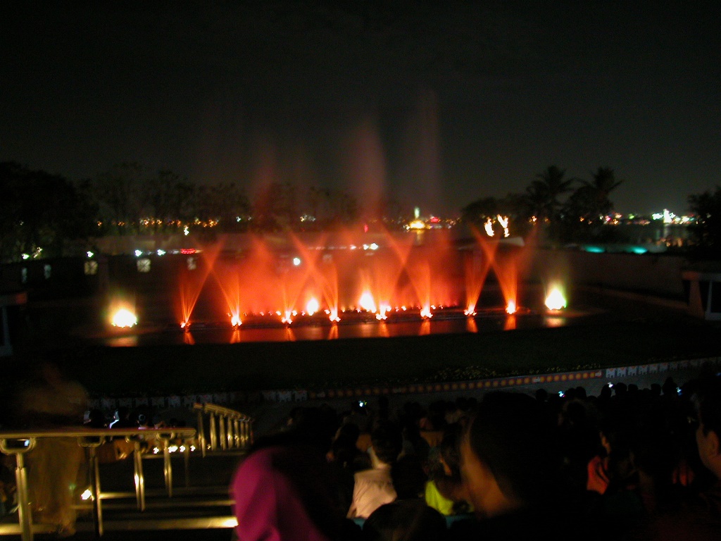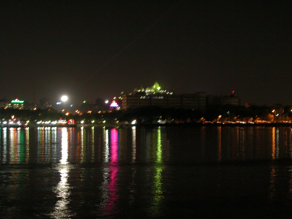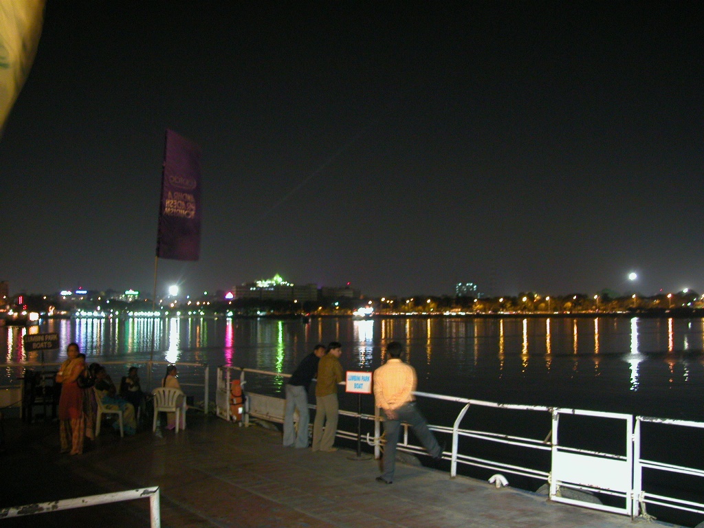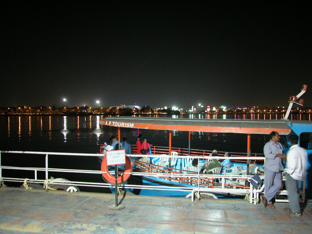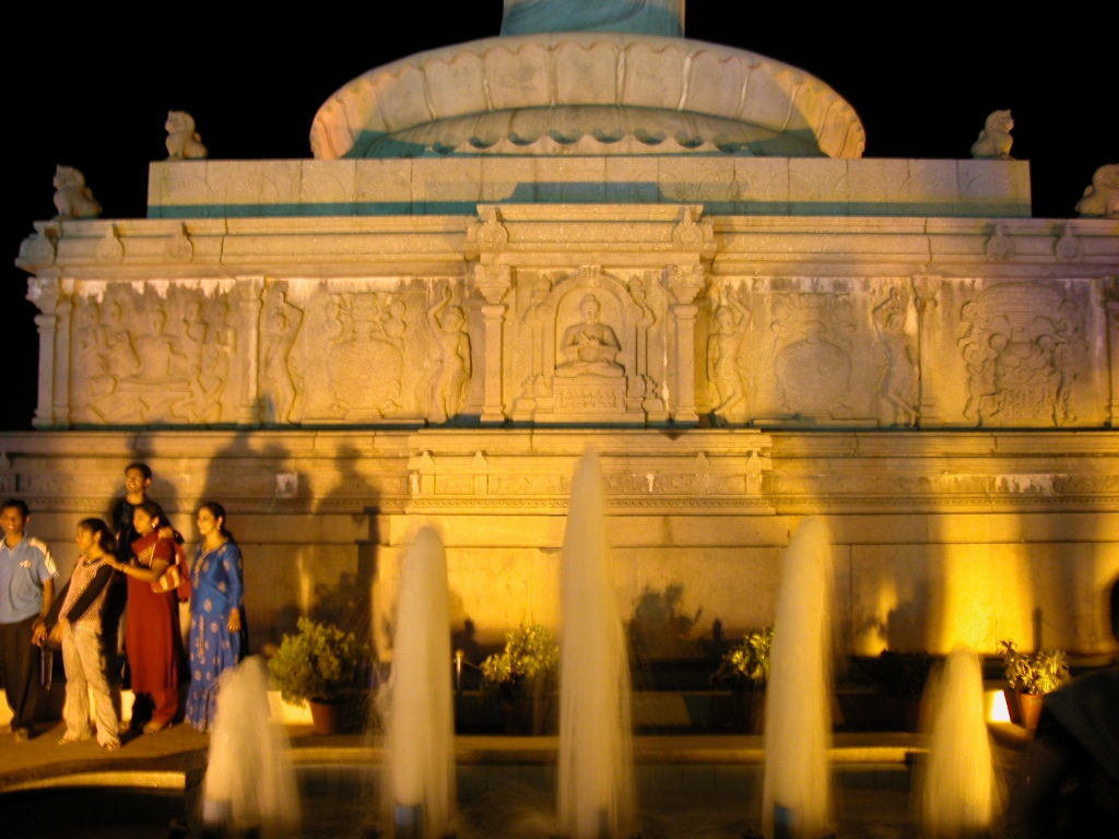 Schnell meine Unterlagen loswerden und Hände waschen, dann wieder hinaus, einen 3-Wheeler anhalten und wieder zurück Richtung Hussain Sagar. Jetzt zahle ich 60 Rp, vorher habe ich 80 gezahlt für fast die gleiche Strecke, aber gar so übertreibe ich es auch nicht beim Handeln. Als ich dort beim Vergnügungspark Lumbini ankomme, wo auch die Boote anlegen sollen, sehe ich, dass in einer halben Stunde eine Lasershow beginnt. Karte um 30 Rp., gleicher Preis wie die Einheimischen, und Eintritt in den Vergnügungspark 5 Rp. gekauft. Es ist eine riesengroße Arena für sicher 2000 Leute, die sich schön langsam füllt. Als es dann mit zwei grünen Laserstrahlen zu „Also sprach Zarathustra“ anfängt, dachte ich noch, dass ich mir das sparen hätte können.