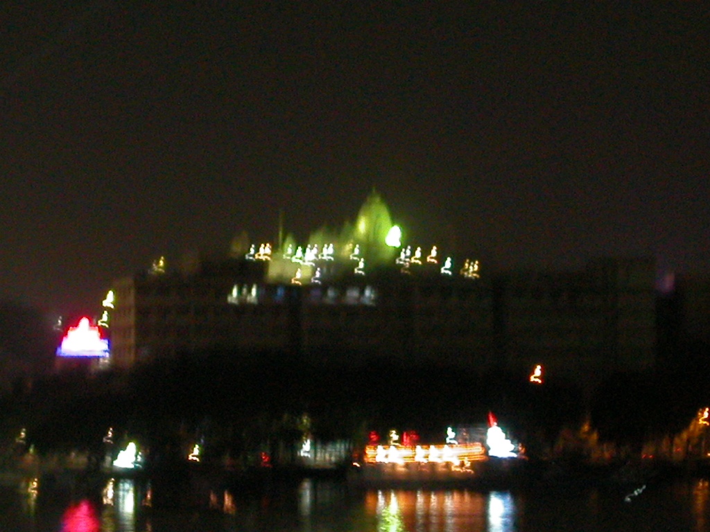 Das Wasser stinkt ziemlich und ist bräunlich, ich kann mir nicht vorstellen, dass der See einmal als Trinkwasserreservoir angelegt wurde. Wir tuckern langsam hinaus, das dürfte ein interessanter Punkt sein, ältere Ehepaare sind genauso dabei wie eine Clique von ca. 17-jährigen Jugendlichen. Je näher wir kommen, desto imposanter sieht die Riesenbuddhastatue mit ihrer Beleuchtung in der Nacht aus. Unser Boot legt auf der Rückseite der kleinen Insel an, ich lasse die Eindrücke auf mich wirken und gehe langsam um ihn herum. Vorne kommt gleich ein Fotograf auf mich zu, er möchte ein Foto von mir gemeinsam mit dem Budhha (oder umgekehrt?) machen. Um 40 Rp bin ich dabei und gespannt wie er das macht, er meint, das dauere nur 2 Minuten. Da sehe ich am Rand des Platzes, unter einem Schirm hat er einen digitalen Fotoprinter aufgebaut und druckt die Fotos sofort aus. Meines ist zwar nicht überragend, aber zeigt der Nachwelt, dass ich wirklich da war.