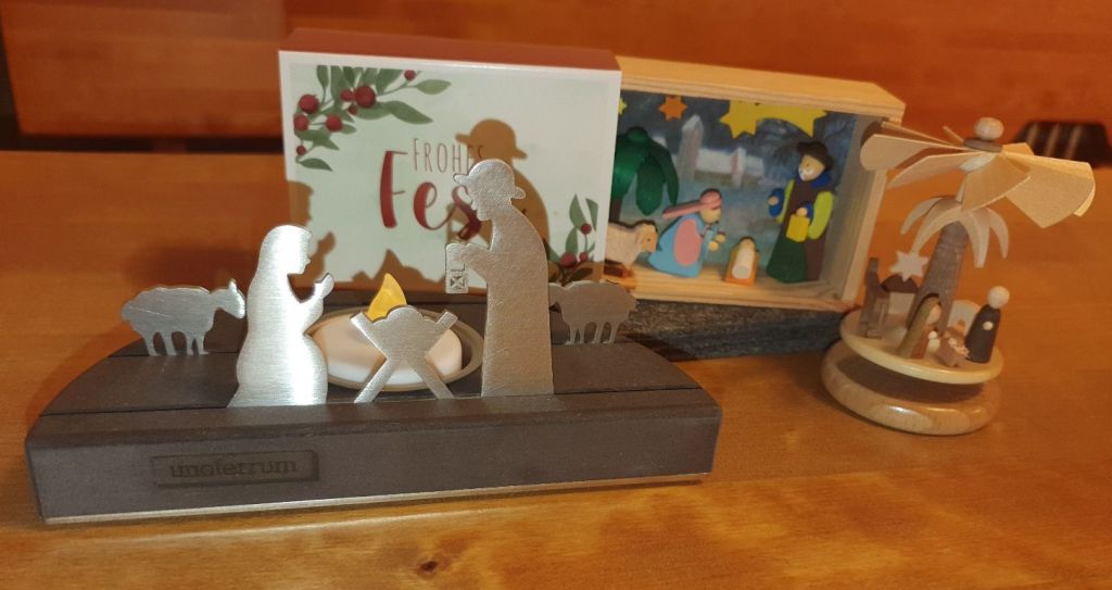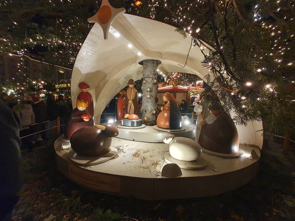 Am Striezelmarkt kauft man natürlich einen Dresdner Stollen, den es in verschiedensten Arten gibt. Wir haben ihn (die Version mit Mandeln ohne Rosinen) schon aufgegessen, darum gibt es kein eigenes Foto davon. Von den Krippen für unsere Sammlung gibt es aber eines.