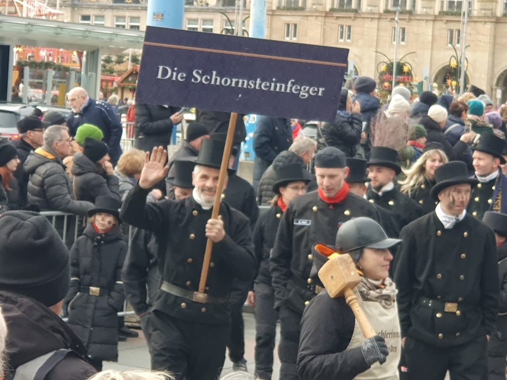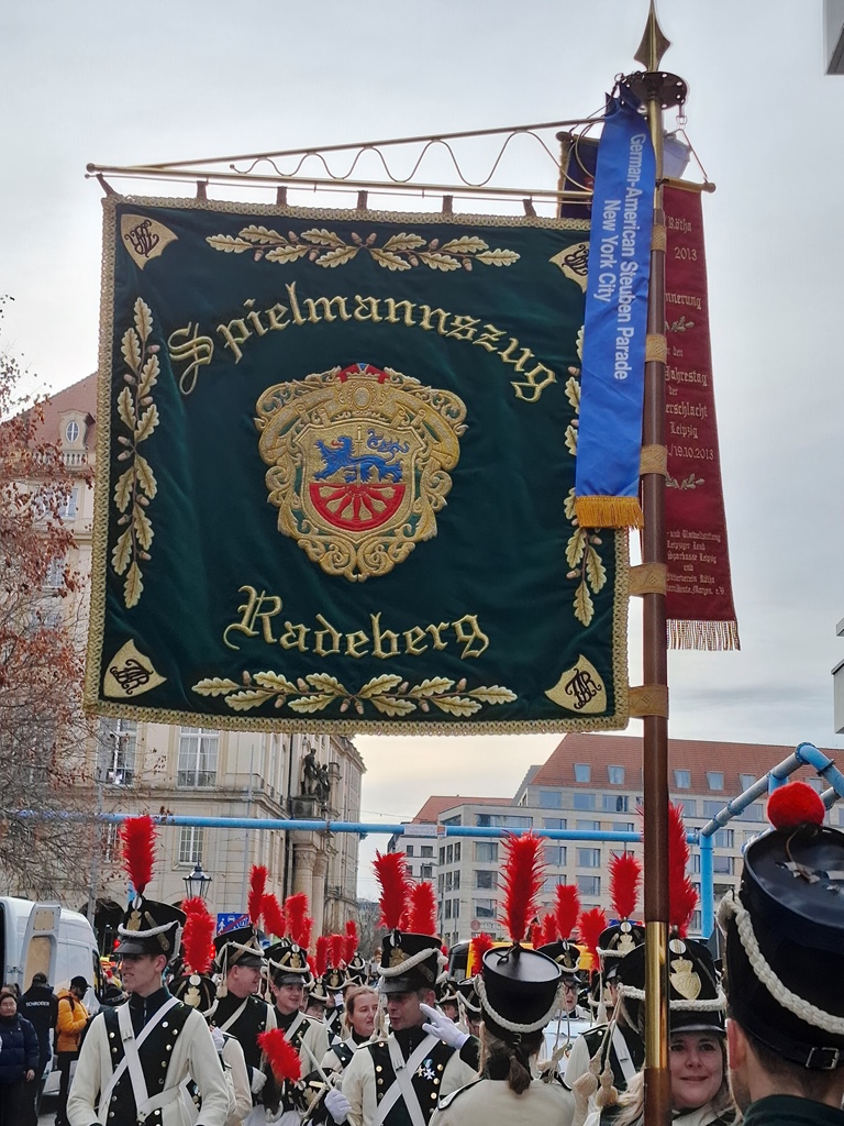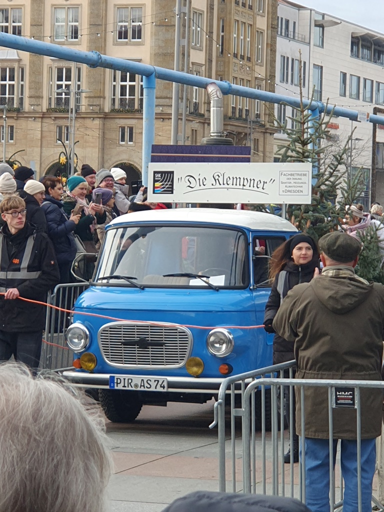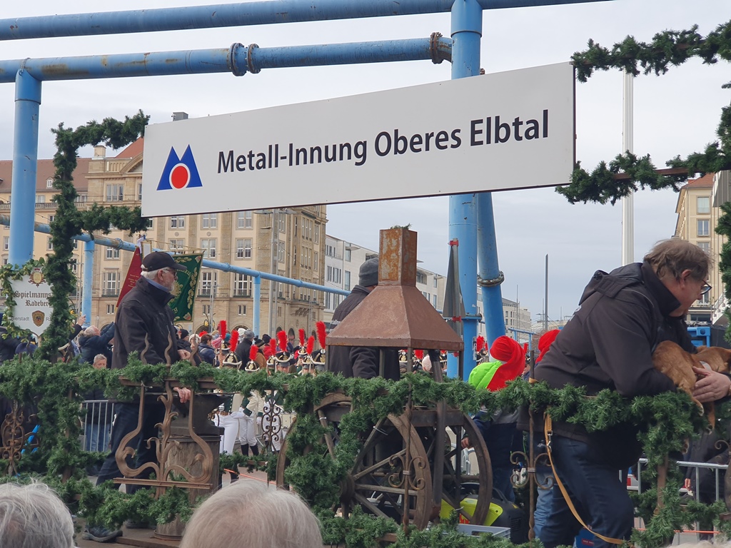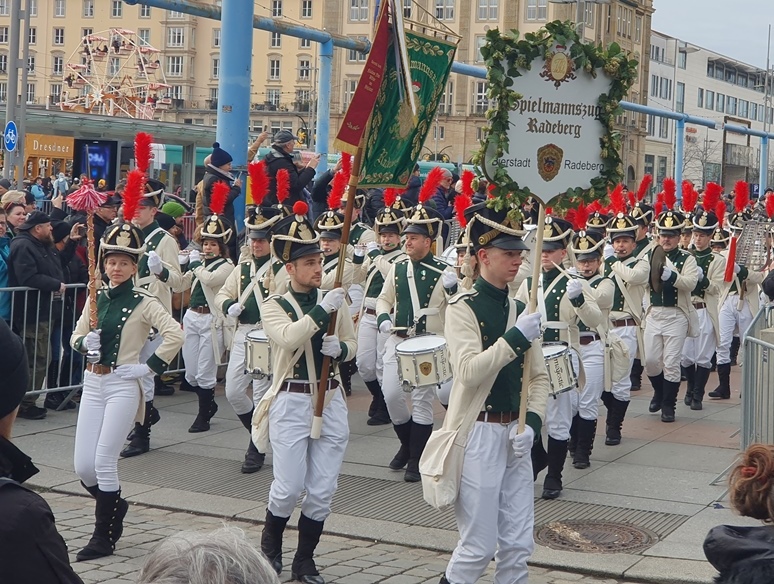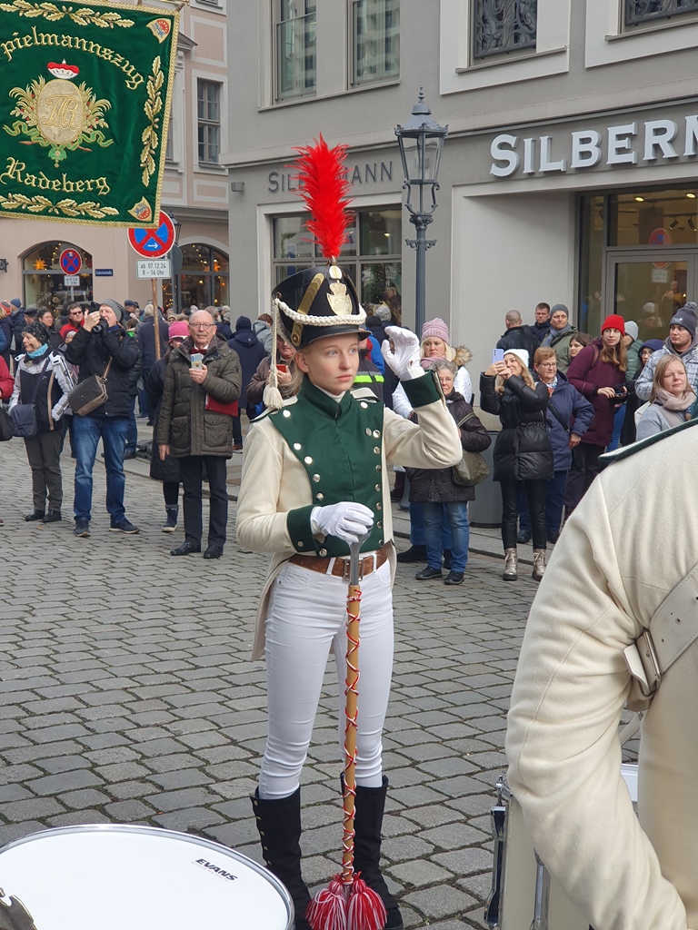 In Begleitung des Radeberger Spielmannszuges und aller Zünfte oder Berufsgruppen Dresdens wurde der riesige Christstollen zur Bühne gebracht und in kleine Stücke geschnitten und verkauft. Leider haben wir dieses Event fast verpasst und gerade noch den Auszug Richtung Neumarkt erwischt, daher gibt es keine Fotos des Riesenstollens.