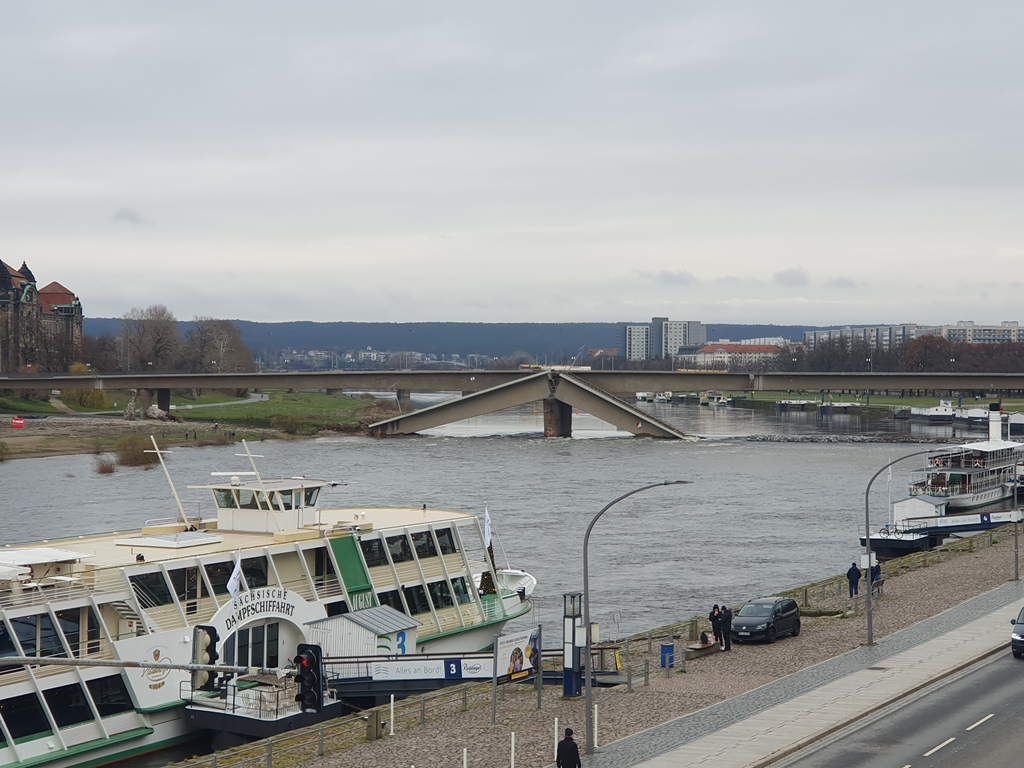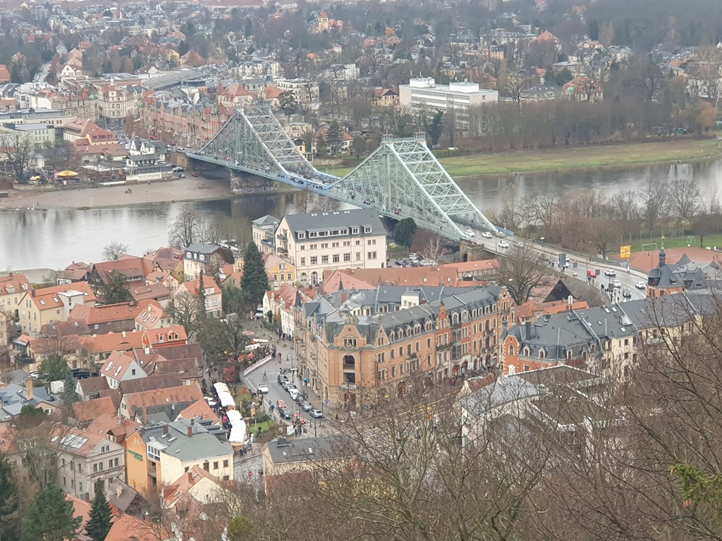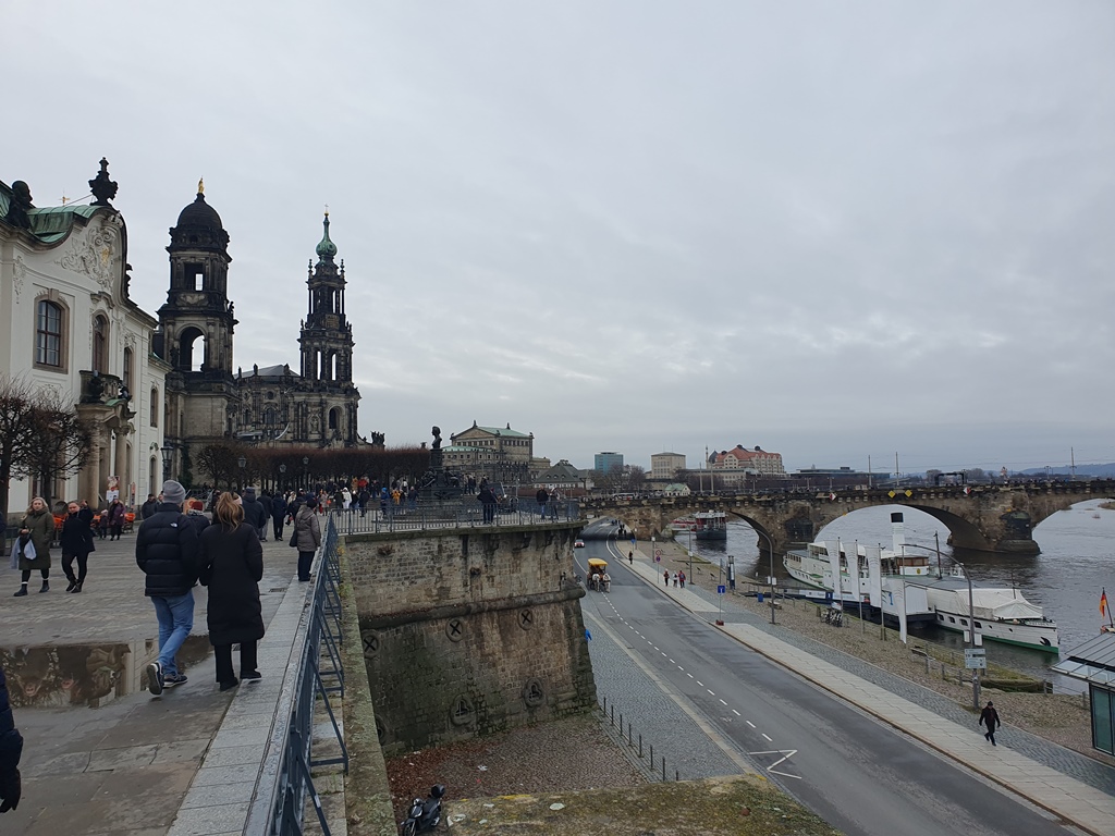 Wir haben es auch gleich genutzt, um mit einer Portion heißer Maroni in der Hand von der Brühlschen Terasse den Blick links auf die Augustus-Brücke, rechts auf die im September 2024 eingestürzte Carola-Brücke und über die Elbe zu genießen.