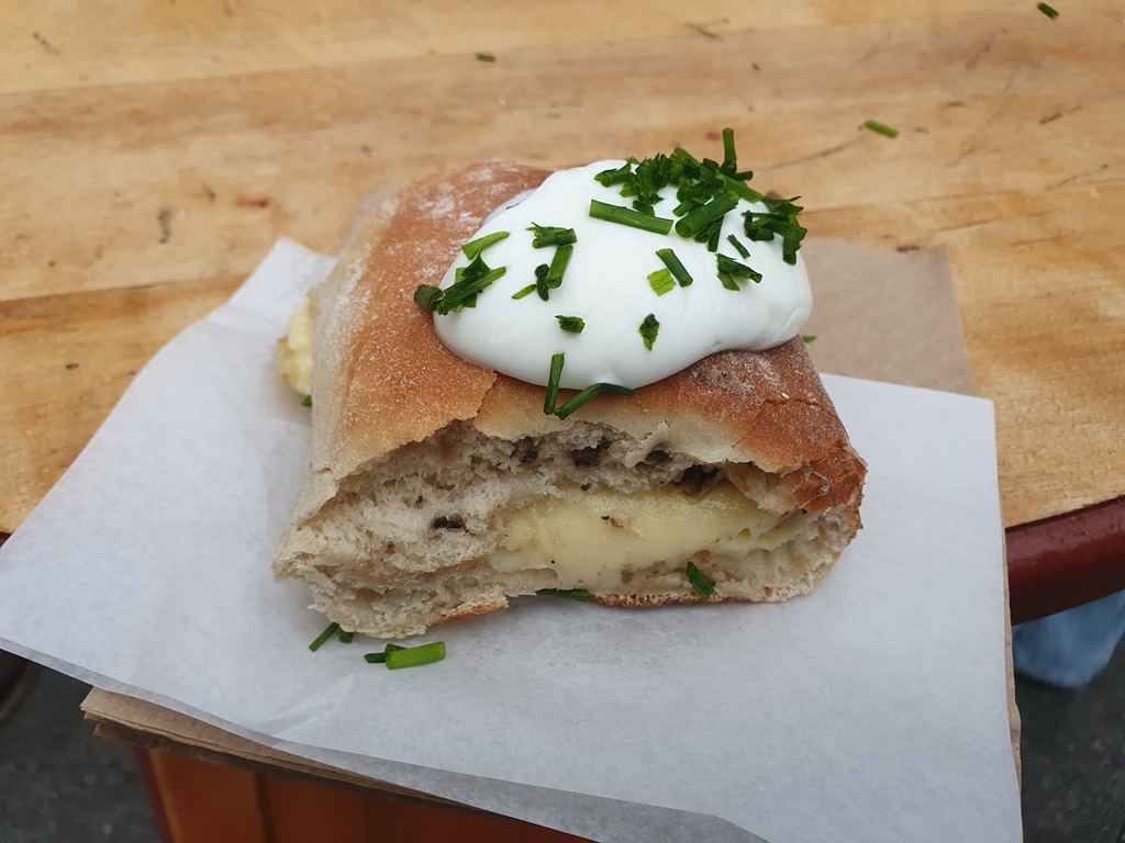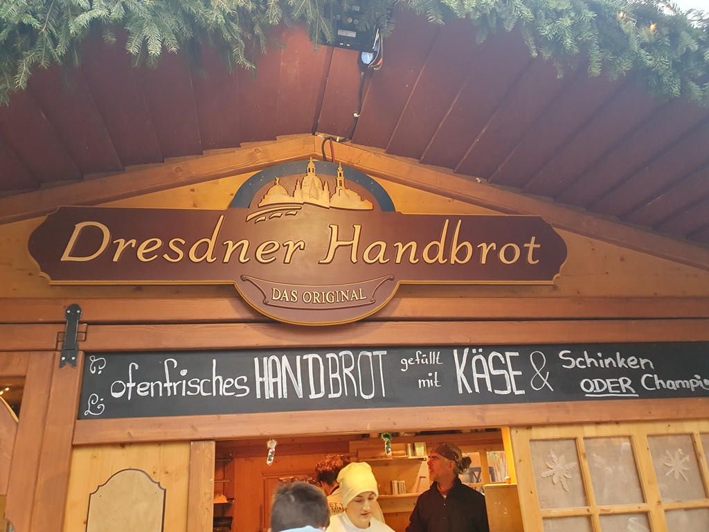 Die Stände sind alle extrem liebevoll geschmückt, wobei natürlich die Themen Holzkunst aus dem Erzgebirge und Dresdner Stollen überwiegen. Neben viel Kunsthandwerk kommen natürlich die leiblichen Genüsse auch nicht zu kurz, sächsischer Glühwein, Rostbratwurst, Dresdner Stollen und Quarkkeulchen (dafür findet ihr auch das Rezept unten) wollen verkostet werden. Wir haben uns aber als Unterlage für Punsch und Glühwein an das ebenfalls einzigartige Dresdner Handbrot gehalten. Das ist ein Brotteig mit eingebackenem Käse entweder mit Schinken oder Champignons und mit Suchtfaktor, was sich manchmal auch an längeren Schlangen vor dem Stand niederschlägt.