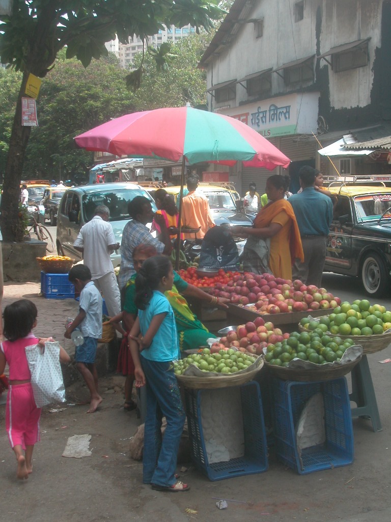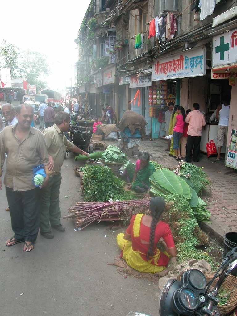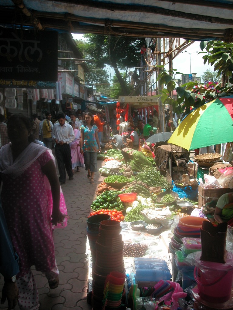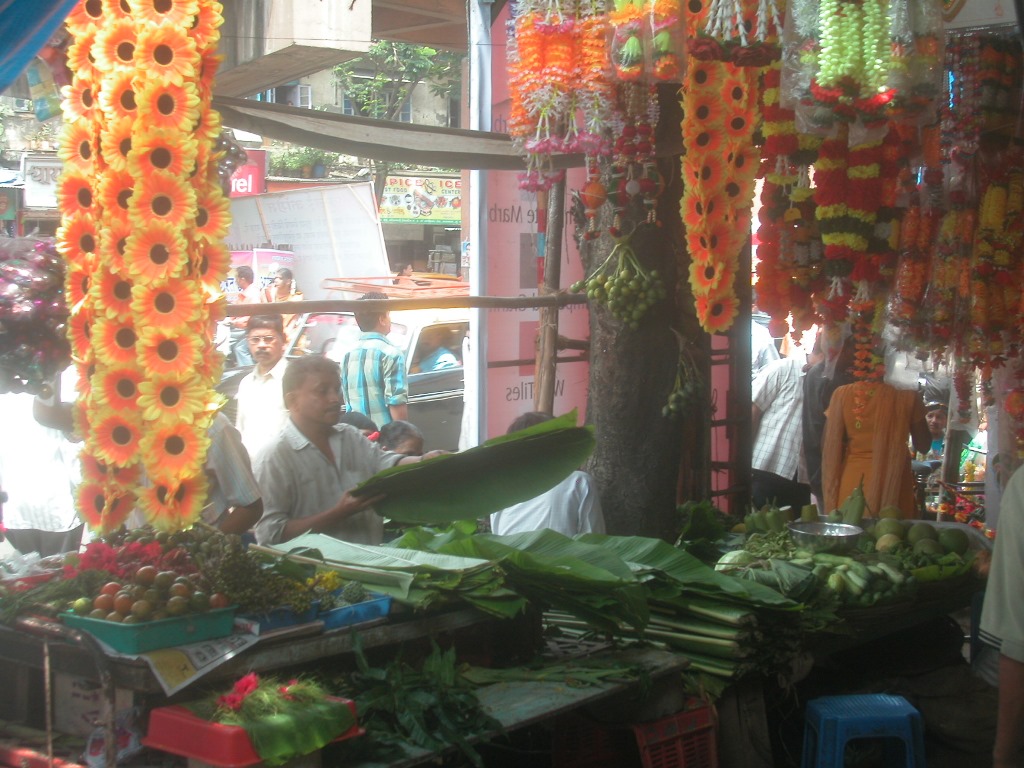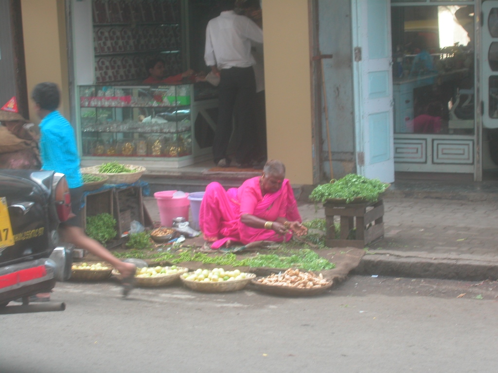 Ich stürze mich ins Geschehen und lasse mich von der Menschenmenge treiben, da taucht schon der erste „Tempeleingang“, der nur fürs Festival errichtet wurde, auf. Ich gehe durch und mache mich auf die Suche nach Ganesh. Am Ende der Gasse ist dann der Tempel und eine lange Menschenschlange steht schon davor. Einige Inder laden mich ein von hinten bis zur Statue zu gehen, aber die Gottheit ist noch hinter einem Vorhang verhüllt und man erklärt mir, dass er erst in einer Stunde weggezogen wird. Das ist mir dann doch zu lange und ich gehe wieder raus. Bei einem der vielen Shops kaufe ich dann auch ein paar Ganesh Souvenirs für zuhause. Auf der Straße gehe ich wieder mit der Masse mit und biege dann in eine Seitengasse ein und gehe zur dahinter liegenden Straße. Überall wird Gemüse und Obst verkauft, es ist eine unbeschreibliche Farbenpracht. Der Trommellärm und das Pfeifen sind ohrenbetäubend und übertönen sogar das Hupen und den Verkehrslärm.