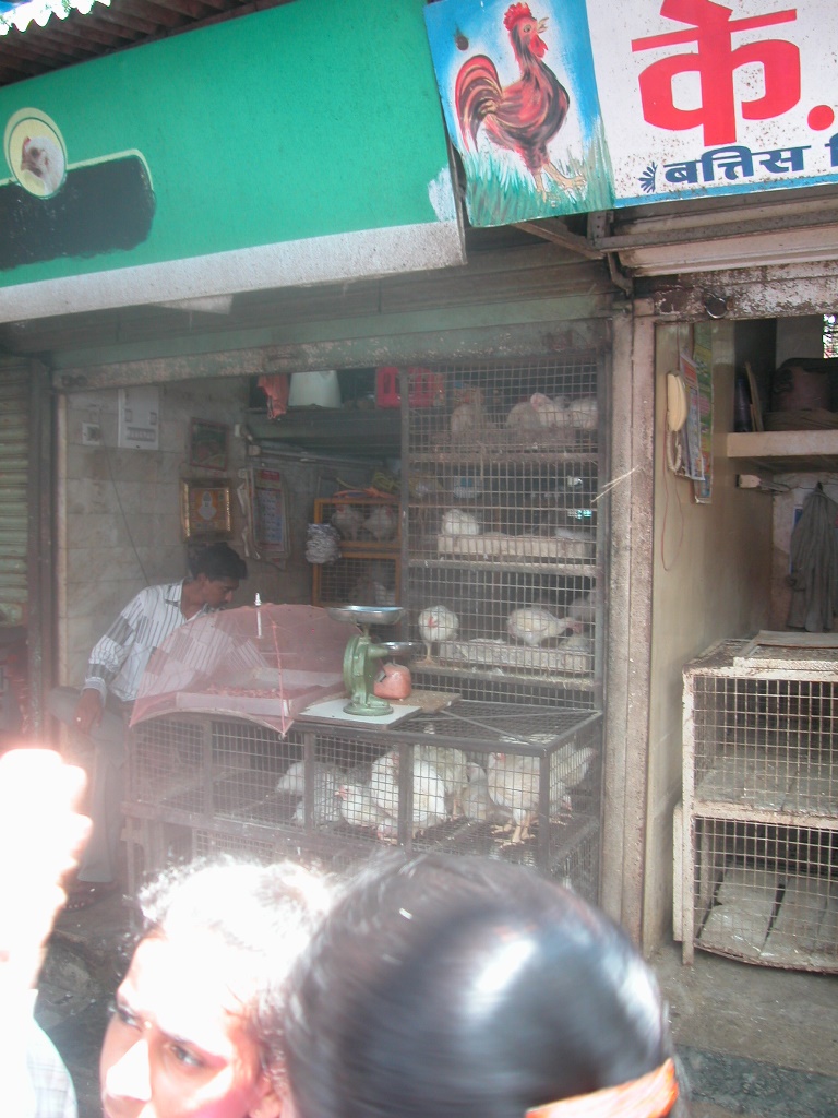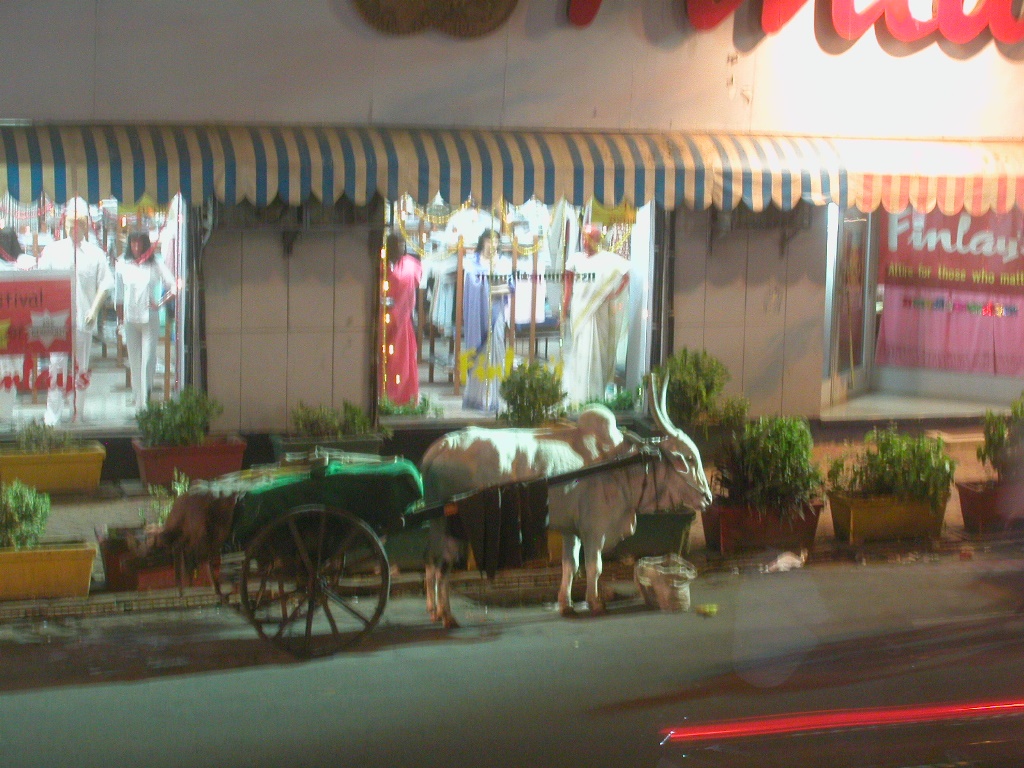 Dann mache ich mich auf der Suche nach einem Restaurant, was aber gar nicht so einfach ist. Ich marschiere einige Straßen entlang und treffe wieder einmal auf einen Ochsenkarren, die man hier immer noch manchmal sieht. Es sind auch, so scheint es zumindest, alle männlichen Moslems auf der Straße. Sie schlendern in ihren weißen Gewändern herum oder sitzen in den Kaffeehäusern, es ist ja schon dunkel, sie dürfen jetzt essen und trinken. Endlich, am Eingang zu einer Marktgasse sehe ich ein Restaurant, das mir vertrauenserweckend vorkommt. Das Chicken Korma schmeckt dann auch lecker. Anschließend gehe ich noch durch die Marktgasse und lasse die Gerüche von Obst, Gemüse und Kräutern auf mich wirken. Zurück würde ich mit dem Bus nicht finden, daher nehme ich mir dann doch ein Taxi.