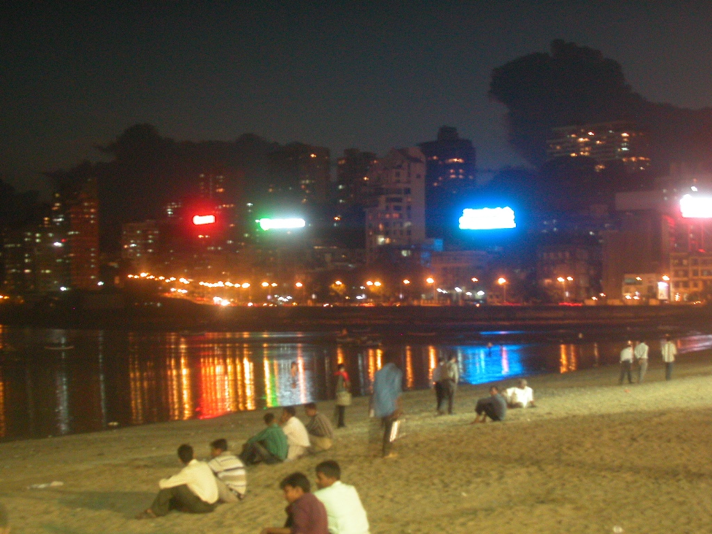 Ich fülle in der Shoppingmall meine Getränkevorräte auf und lasse mir dann an der Rezeption erklären, wie ich nach Chowpatty Beach komme. Sie schlagen mir vor, mit dem Bus zu fahren, da der um diese Zeit schneller als das Taxi sei. Also fahre ich das erste Mal mit dem Bus, diese sind gar nicht so schlecht, und überfüllt ist er auch nicht. Bei der Endstation erklärt mir der Schaffner noch, wie ich weitergehen soll, um an die Bucht zu kommen. Der Ausblick ist imposant, auch in der Dunkelheit sieht man über die kleine Bucht im Arabischen Meer mit den Hochhäusern und den Leuchtreklamen obendrauf im Hintergrund. Es sind noch viele Menschen hier, sie liegen im Sand oder spazieren am Wasser entlang. Ich gehe zwar auch durch den überraschend sauberen Sand, aber gar so nahe muss ich nicht hin und keine 10 Pferde würden mich da hineinbringen. Dabei erinnere ich mich, dass ich noch vor 2 Wochen in Piräus am Hafen war.