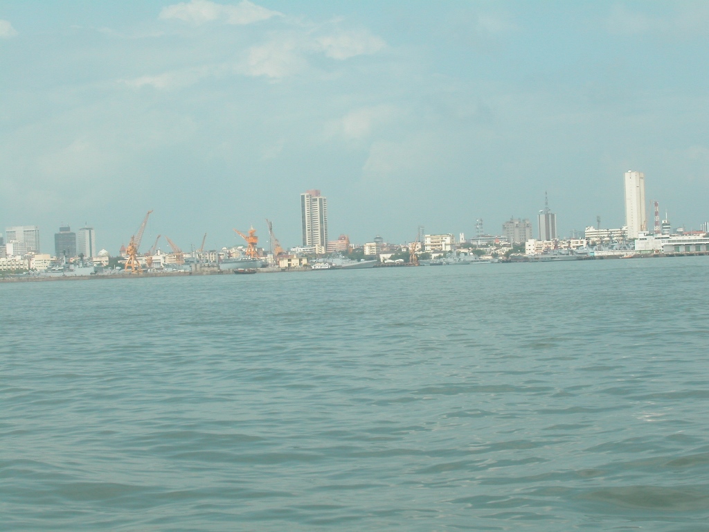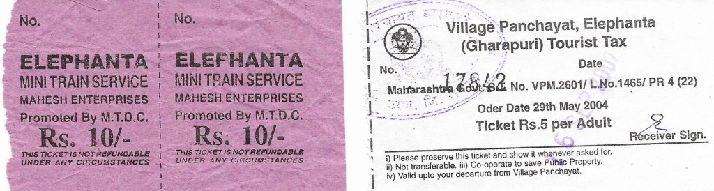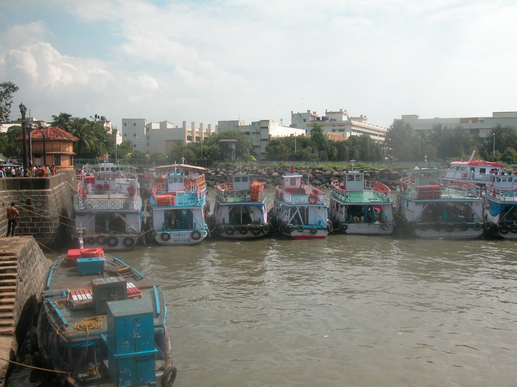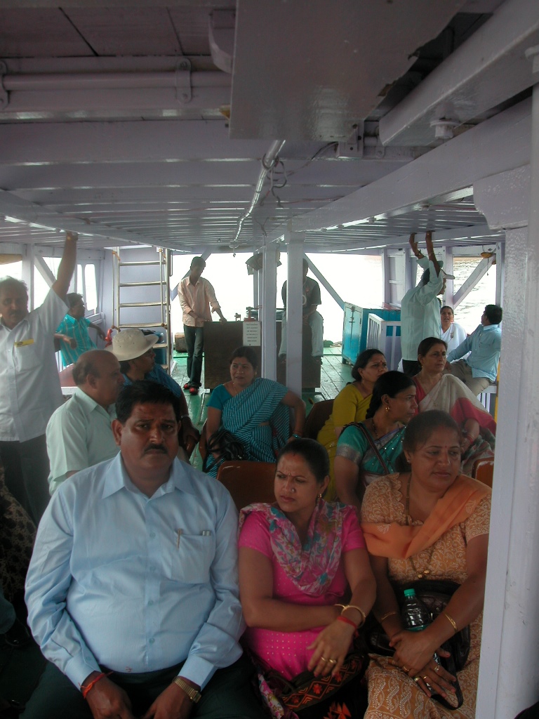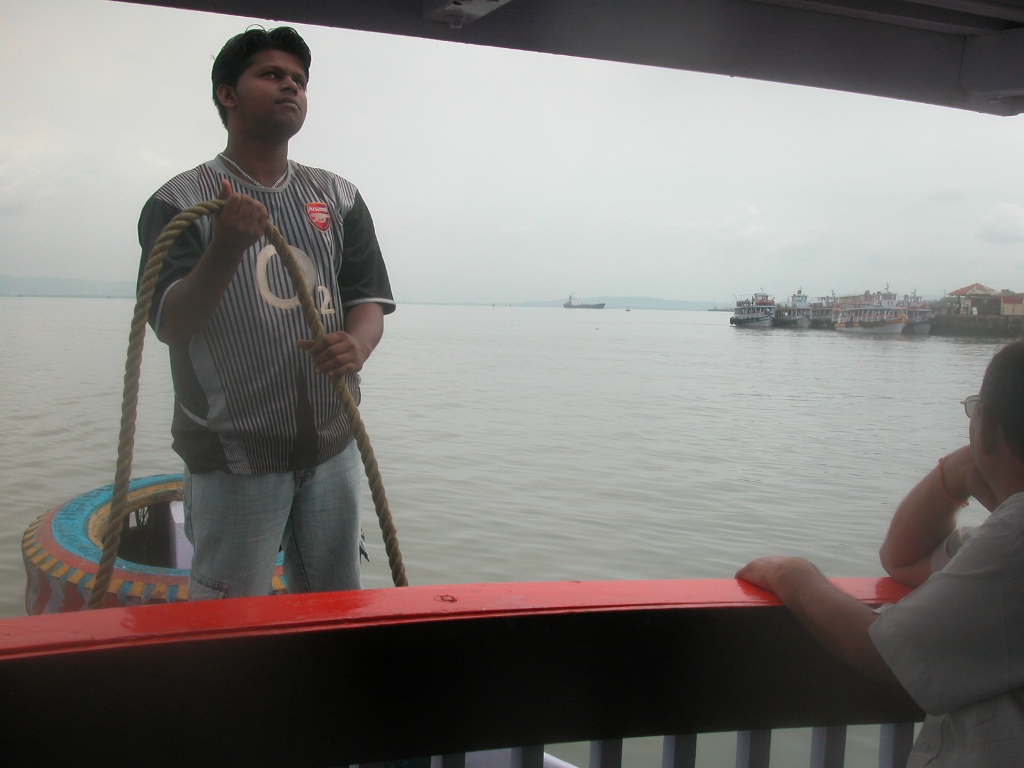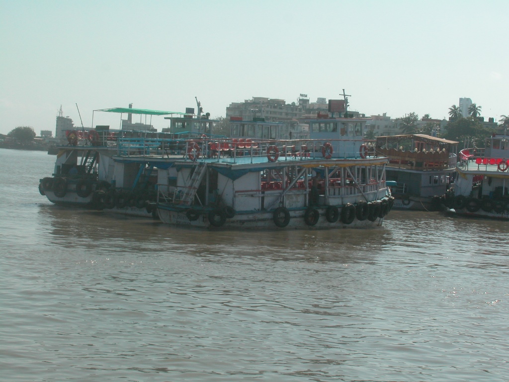 Sofort nach der Ankunft werde ich von „Guides“ überfallen, die mir ihre Dienste anbieten oder den Führer zu weit überhöhten Preisen verkaufen wollen. Sie erklären, dass auf der Insel alles noch teurer ist (was laut Reiseführer nicht stimmt) und man so quasi ohne sie verloren sei. Ich schaffe es trotzdem, sie alle abzuwimmeln und mein Ticket für das Boot zu bekommen. Es wartet schon, direkt unterhalb des „Gateway to India“. Kaltes Wasser in Flaschen gibt’s auch direkt vorm Einsteigen, das ist sicher notwendig. Nachdem ich gerade heute meine Kappe vergessen habe, lasse ich mich zum Kauf eines Hutes überreden, über den ich dann später noch recht froh bin.