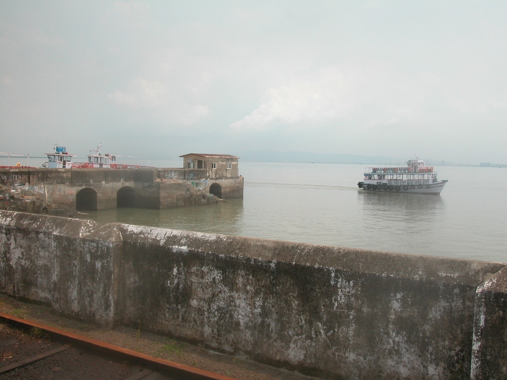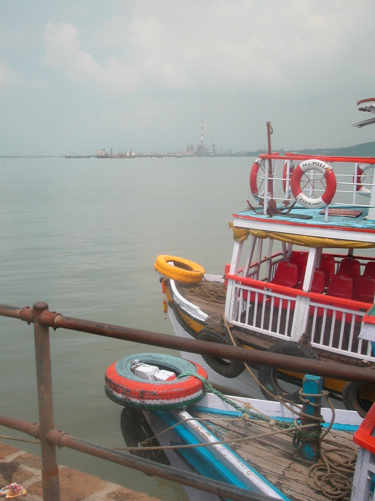 Die Fahrt dauert rund eine Stunde und führt an vielen Supertankern und Schiffen für den Öltransport und an Raffinerien vorbei. Beim Aussteigen geht’s über ein bereits angelegtes Boot drüber und wir werden sofort wieder von Indern, die ihre Dienste anbieten und sich als Führer betätigen wollen, vereinnahmt. Man muss resolut auftreten, sonst hat man keine Ruhe. Um 10 Rupies gibt’s ein Ticket für den Minizug über die doch recht lange Mole wer weiß wie weit. Der erste Zug ist überfüllt, ich warte mit einigen Touristen auf den nächsten, das dauert gar nicht lange, nach gut 5 Minuten sitzen wir auch drin. Am Ende der Mole geht’s um eine Kurve und dann noch rund 100 Meter weiter bis zur Endstation, das wäre zu Fuß auch kein Problem gewesen.