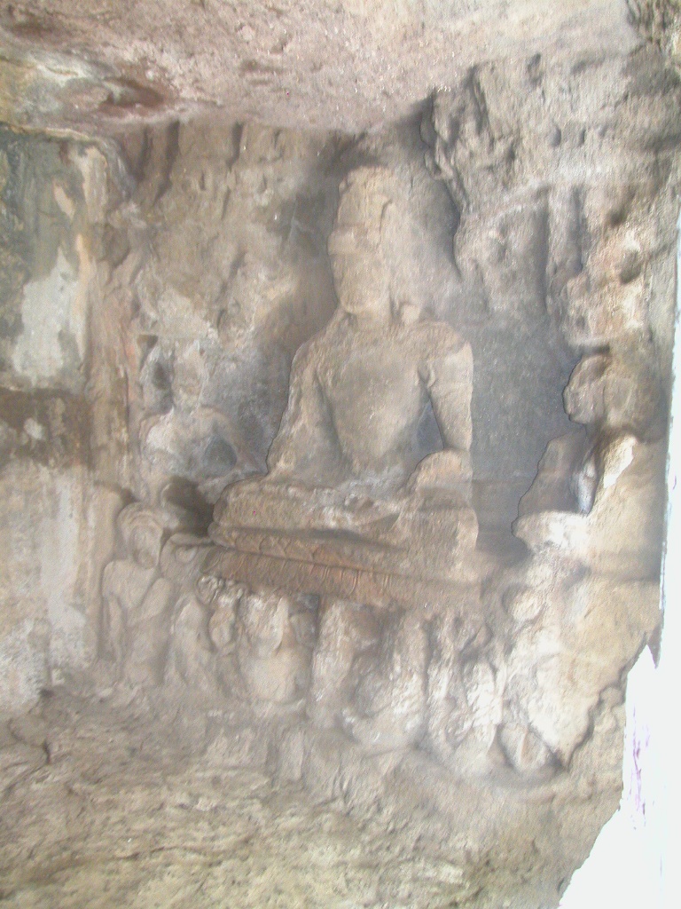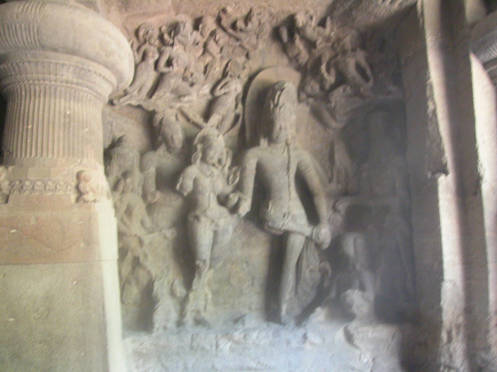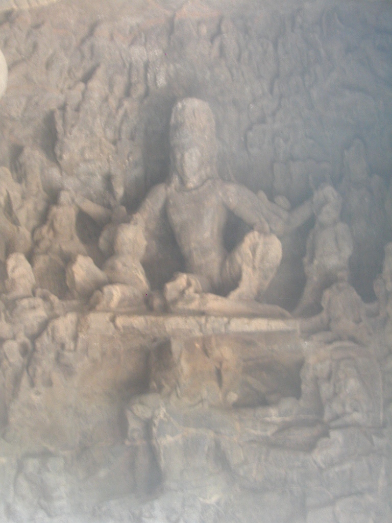 Ein paar Meter weiter ist der erste und größte Shiva-Tempel, eine Säulenhalle, die im 7. Jahrhundert nach Chr. in den Felsen hinein gehauen wurde. Imposant sind die Götterstatuen an den Wänden, die zwar schon alle in eher schlechtem Zustand, aber trotzdem beeindruckend sind und zu den bedeutendsten Werken hinduistischer Bildhauerei überhaupt und so auch zum UNESCO-Kulturerbe gehören. Bei den älteren Indern sind das nicht nur antike Steine, sondern sie werden wirklich verehrt, sie ziehen die Schuhe aus, beten und singen auch und schmücken die Schreine mit Blumen.