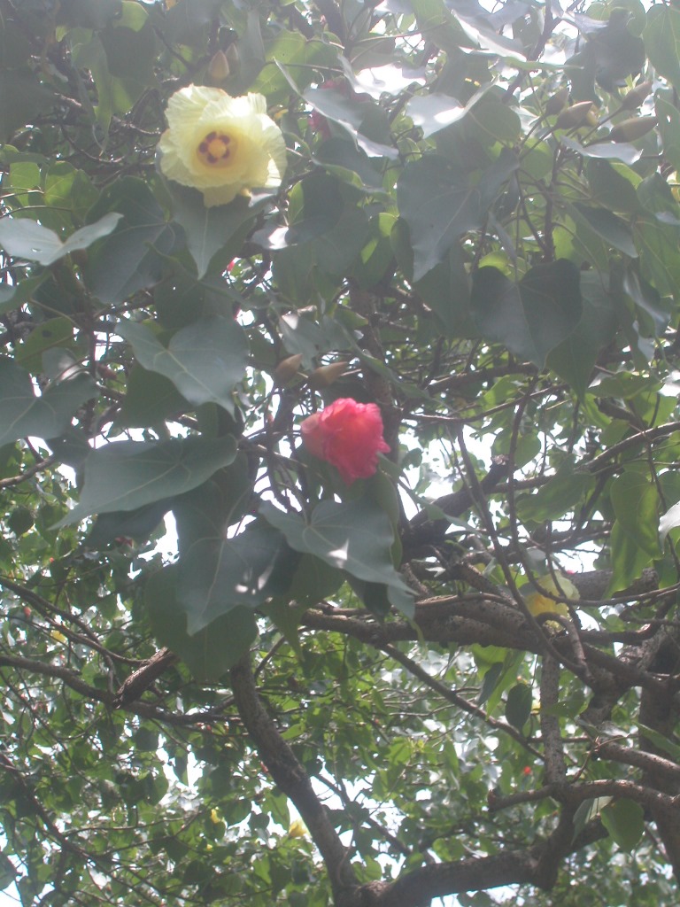 Vorbei an weiteren Höhlentempeln und bunt blühenden Bäumen geht es den Hügel der Insel hinauf, dann ist der schöne breite Weg zu Ende. Ein Wegweiser zeigt zum „Cannon Hill“, der von hier in ein paar Minuten erreichbar sein soll. Bin gespannt, warum der so heißt, aber nachdem auch hier Kriege geführt wurden, kann ich es mir denken. Der Weg führt wieder steil durch den Wald bergauf, ohne schützendes Blätterdach wäre die Hitze noch unerträglicher. Dann sehe ich neben dem Weg die erste Heilige Kuh in „freier Wildbahn“, nachher sehe und höre ich noch einige. Wie ich mir gedacht habe, gibt’s hier zwei riesige Kanonen mit Unterstand, der Ausblick hinunter aufs Meer ist aber noch viel interessanter.