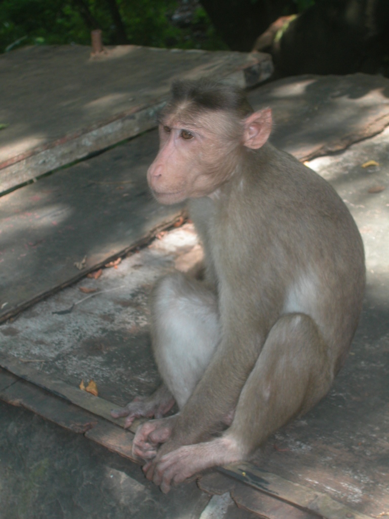 Dort heißt es dann 10 Rupies Eintritt zu bezahlen, ich wundere mich noch, dass der Reiseführer einen Extraeintritt für Ausländer nennt, da ist keine Rede davon. Dann geht’s auch schon den Berg hinauf, wer möchte, kann sich von 4 Indern mit einer „Sänfte“, einem Holzsessel, der an 2 Stangen gebunden ist, hinauftragen lassen, kostet 300 Rupies hin/retour. Das kommt mir aber dann doch zu dekadent vor. Links und rechts sind wieder die Standeln mit den Glücksbringern und Andenken, ich schwindle mich durch, ohne zu viel zu schauen, ich mache das erst am Rückweg. Eine eher dicke ältere Engländerin lässt sich hinauftragen, die 4 Träger sind mit ihrer Last unter dauernden „Away“-Rufen ziemlich rasch unterwegs, sie sind sicher froh, wenn sie ihre Last wieder los sind. Hier sind auch die ersten Affen zu sehen, die auf einer Tafel als die eigentlichen Herren der Insel bezeichnet werden. Sie sind recht putzig und ein willkommenes Fotomotiv für alle Touristen. Die Hitze ist extrem, doch dann sind die Stufen endlich zu Ende und der Eingang zu den Kultstätten ist da. Hier stimmt’s dann, wieder Eintritt zahlen, 10 Rupies für Inder, 250 Rupies für Ausländer, die EU mit ihrer Gleichbehandlung ist da weit weg und der Reiseführer hat doch recht.