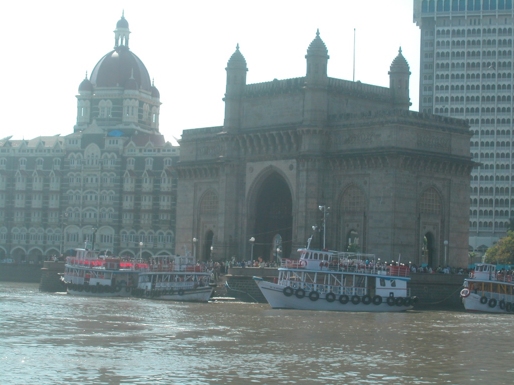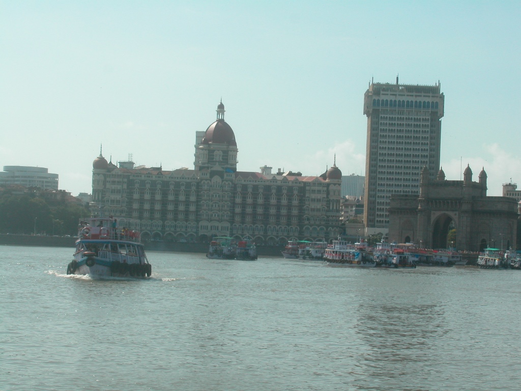 Die Boote fahren vom „Gateway to India“ ab. Das ist eine Art Bogen der 1924 nur für den Besuch des englischen Königs George V. im Hafen gebaut wurde und imposant aussieht. Direkt dahinter steht das Nobelhotel „Taj Mahal Palace & Tower“, links das historische Gebäude und rechts der Hochhausneubau.