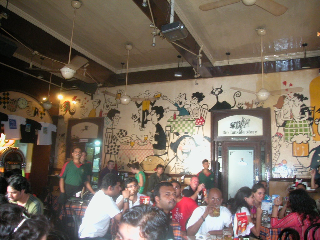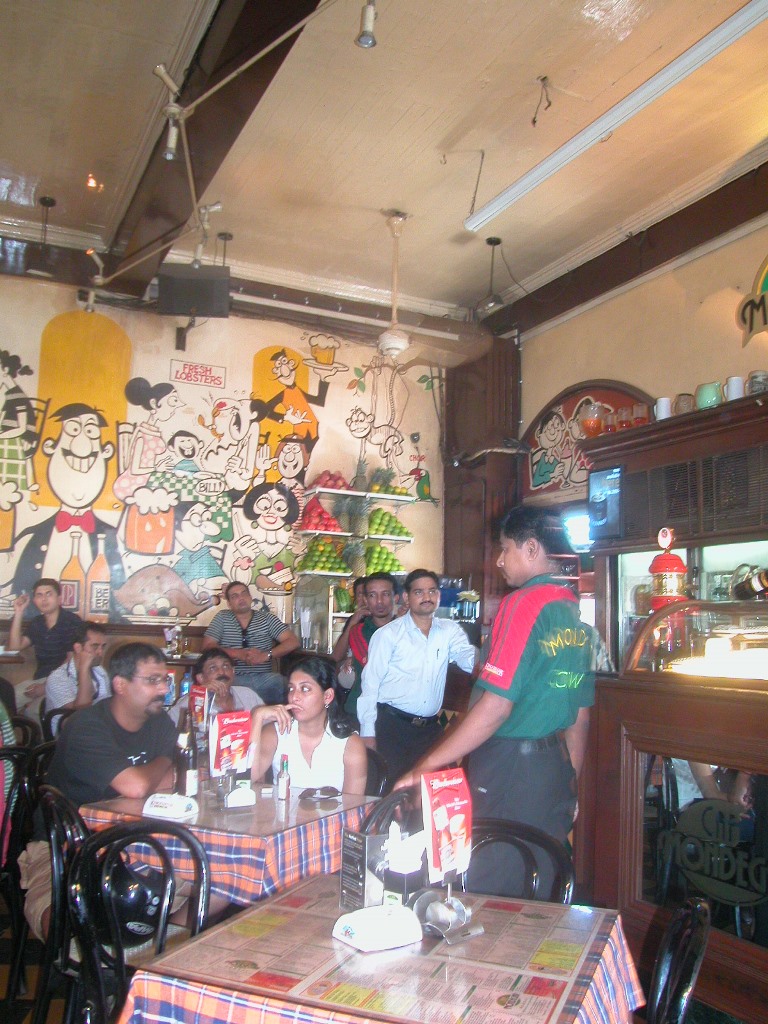 Bei der nächsten Kreuzung entdecke ich das Cafe Mondegar, das laut Reiseführer Kult ist. Da ist wirklich nicht zuviel versprochen, die Karikaturen eines Künstlers aus Goa und die Einrichtung sind wirklich cool. Das KingFisher-Bier ist kalt und der Chickenburger ist auch lecker. Im TV läuft gerade ein Kricket-Spiel, das ist der Nationalsport der Inder, darum ist auch der Tisch unter dem Fernseher frei!