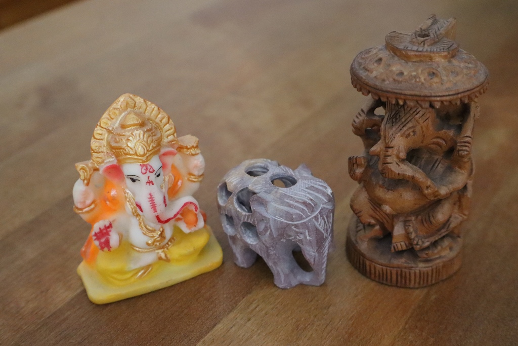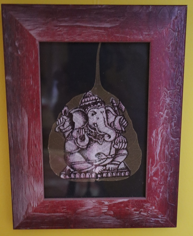 Auf dem Weg die Stufen hinunter muss ich natürlich auch einige Sachen kaufen, da kommt man nicht daran vorbei. Zuerst ist es ein kleiner aus Marmor geschnitzter Elefant, dann ein Bild von Ganesha, auf einen Blatt gemalt. Weiter unten wird’s dann nach langen Verhandlungen, die mir schon peinlich sind, noch ein aus Holz geschnitzter und 2 Zinn-Ganeschas. Und weil sie so schön bunt sind, kaufe ich dann auch noch einen aus Stein. Auch wenn das alles praktisch nichts kostet, ist es nun genug und ich mache mich auf den Weg zum Boot. – Bild Ganeshas