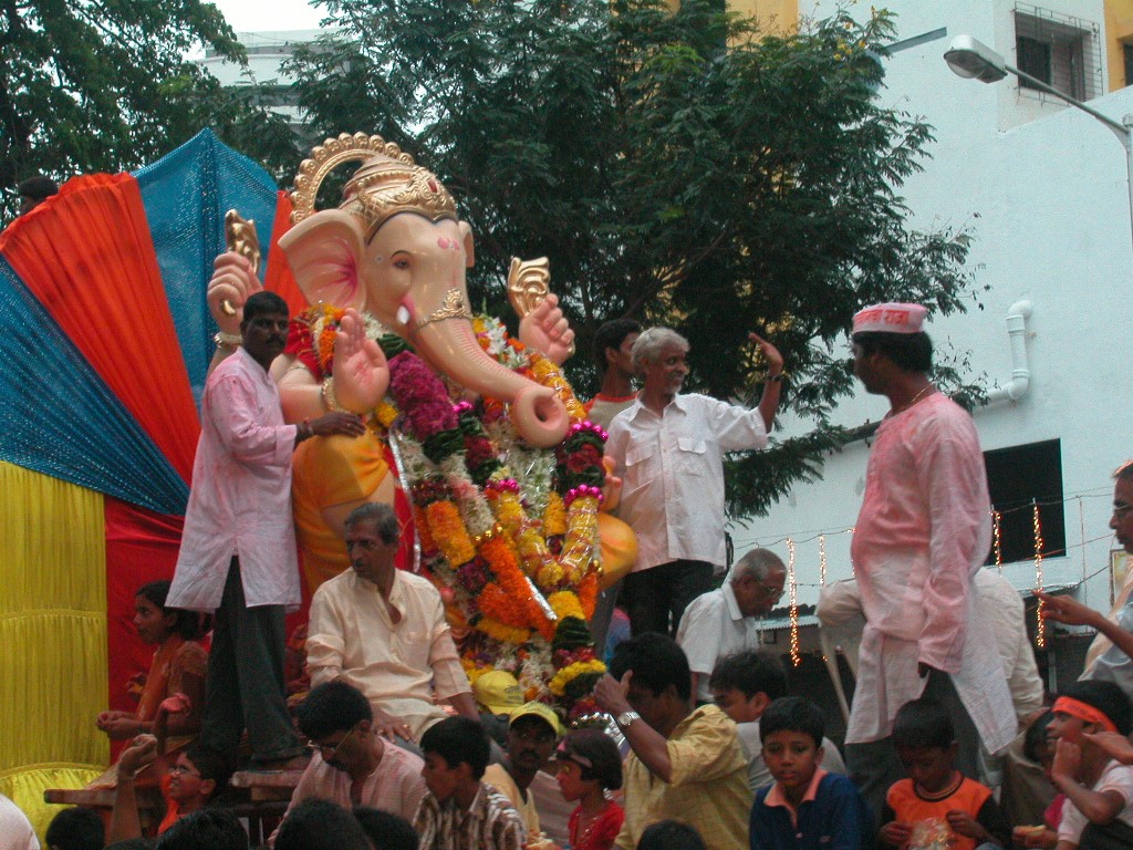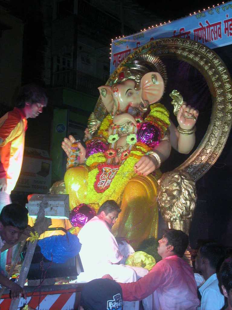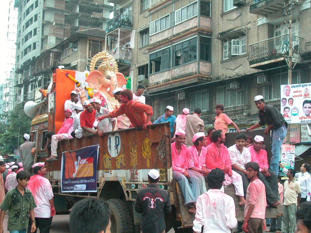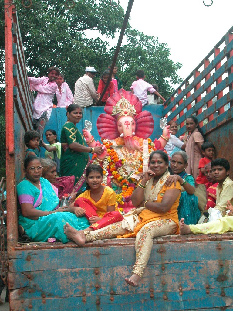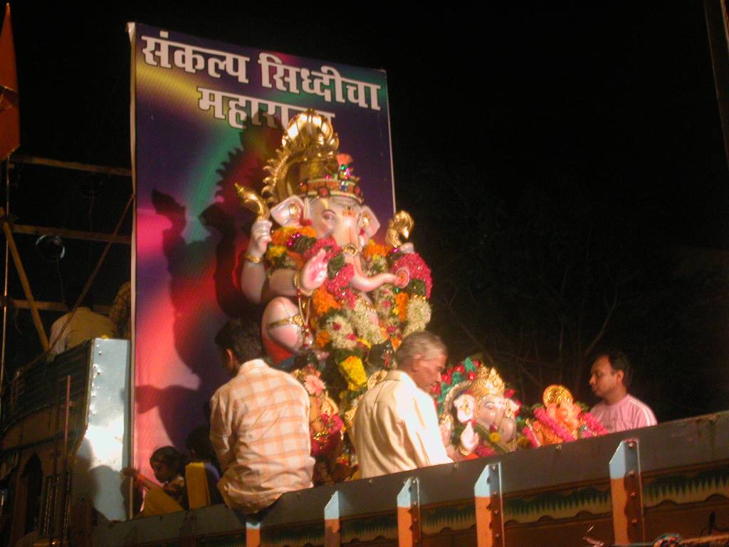 Am Donnerstag spielte es sich noch mehr als üblich auf den Strassen ab, alle möglichen und unmöglichen Fahrzeuge waren mit weit mehr Menschen besetzt unterwegs, um die mittelgroßen Ganeshas zum Meer zu bringen und dort beim sogenannten Ganesh visarjan, (immersion,Versenkung) und zu versenken.