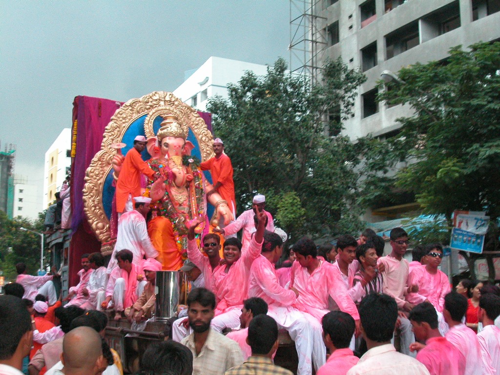 Am Donnerstag spielte es sich noch mehr als üblich auf den Strassen ab, alle möglichen und unmöglichen Fahrzeuge waren mit weit mehr Menschen besetzt unterwegs, um die mittelgroßen Ganeshas zum Meer zu bringen und dort beim sogenannten Ganesh visarjan, (immersion,Versenkung) und zu versenken.