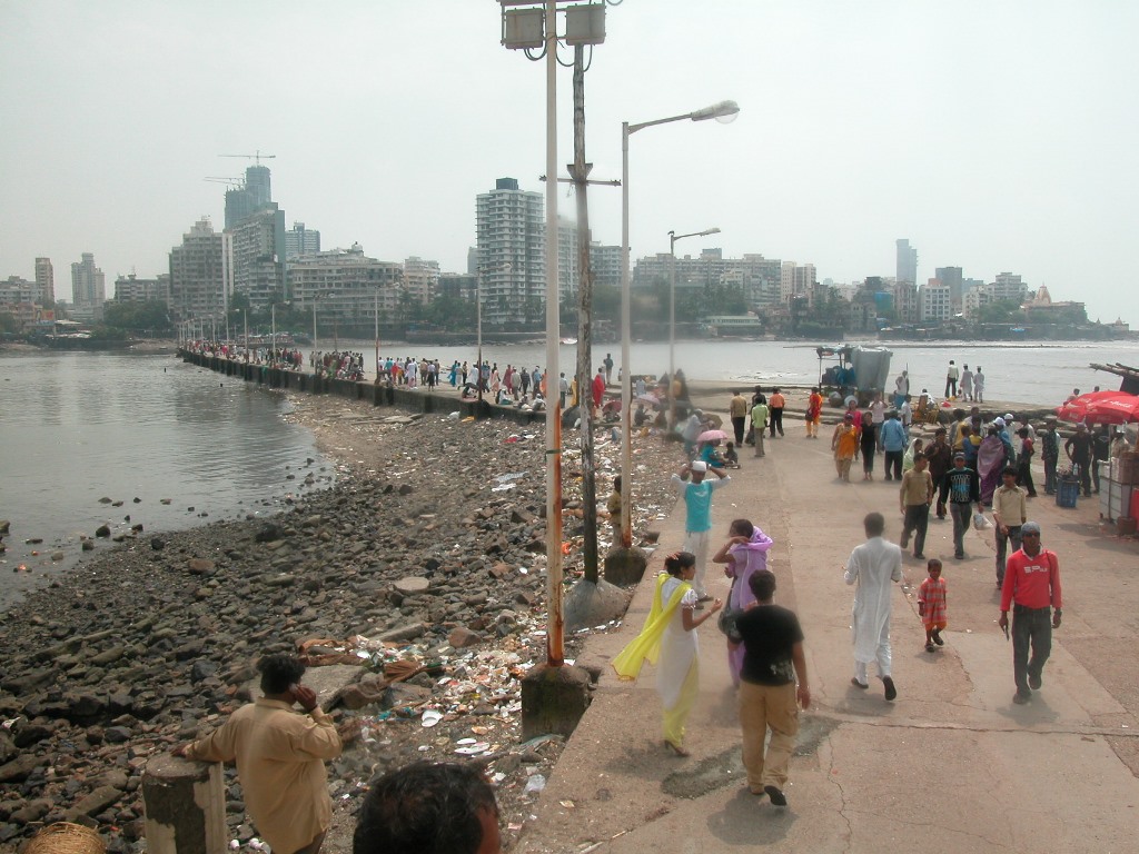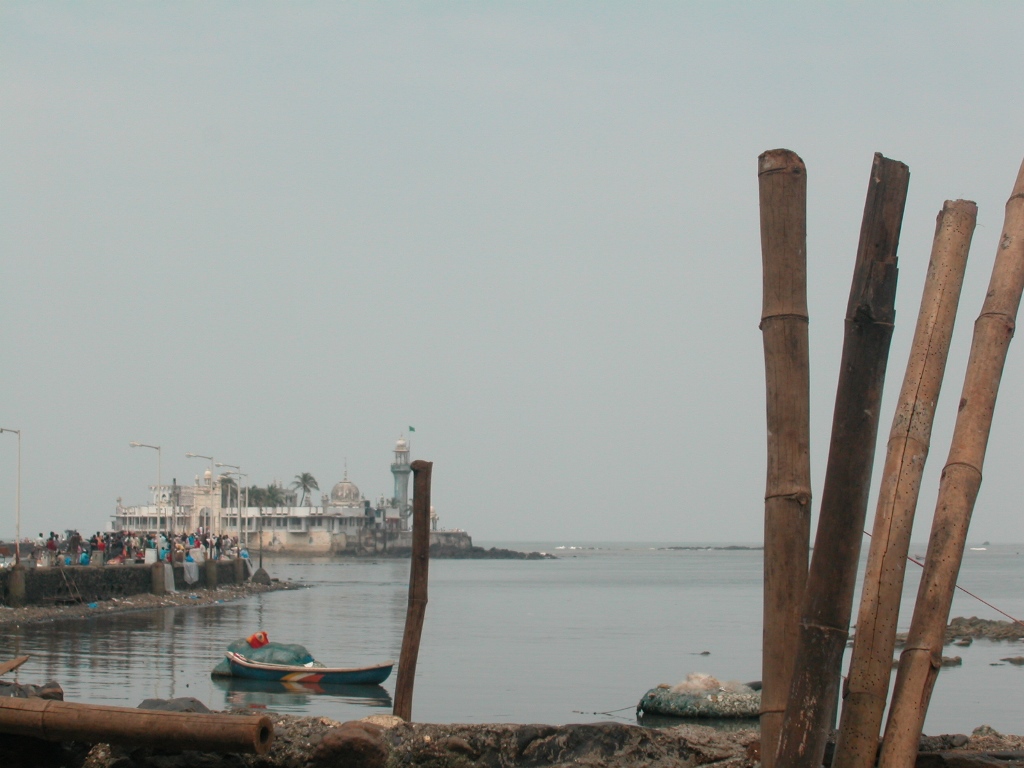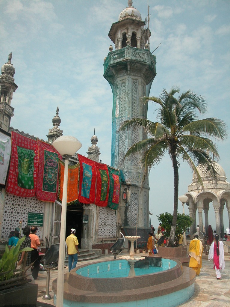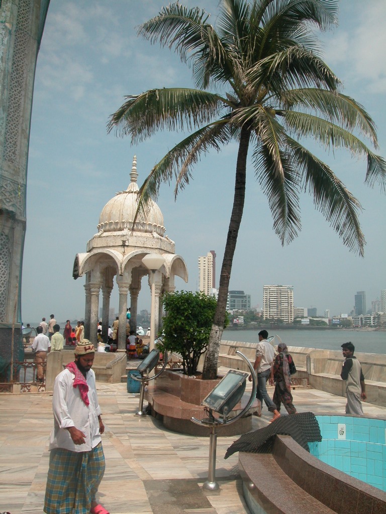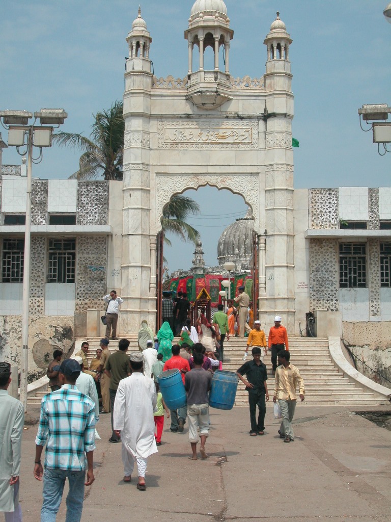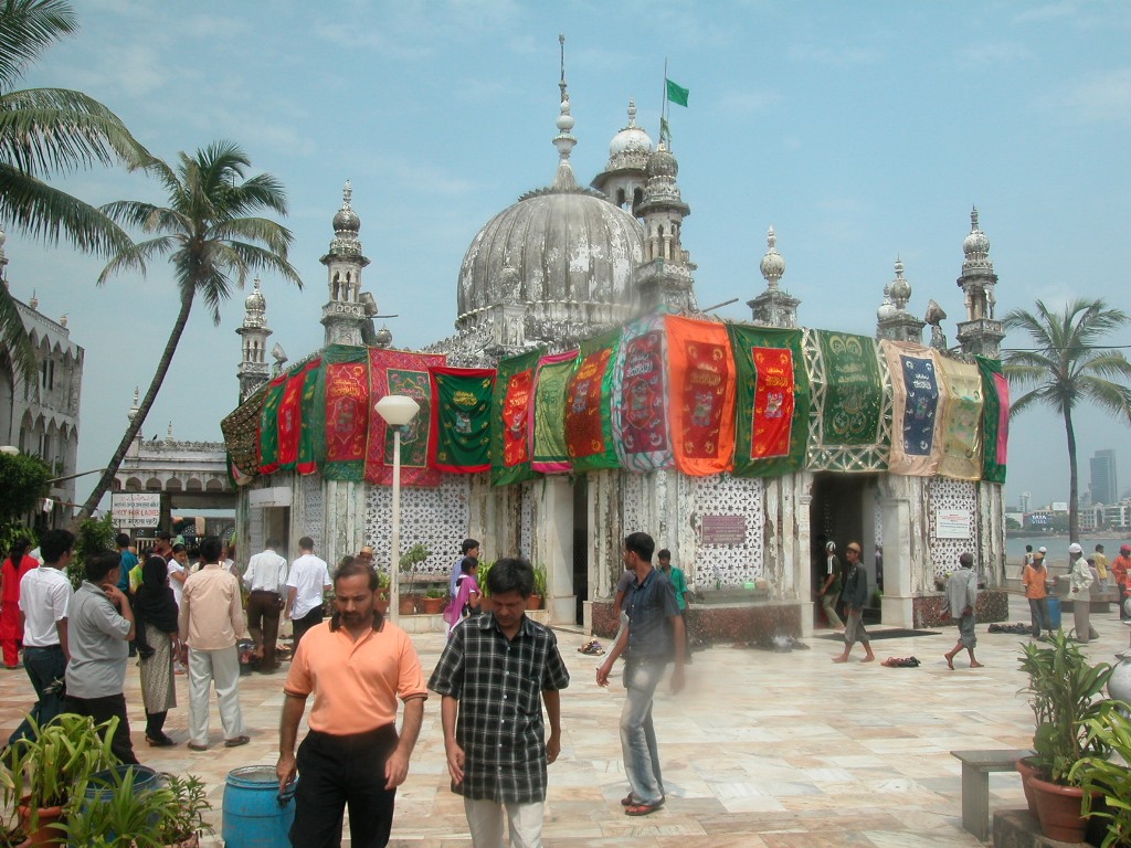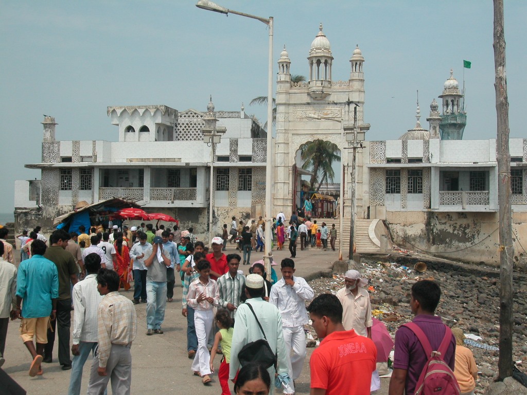 Die Moschee, die im 19. Jahrhundert erbaut wurde, liegt auf einer kleinen Insel vor Mumbai und ist nur über eine Art Damm zu erreichen und steht jeder Religion offen.