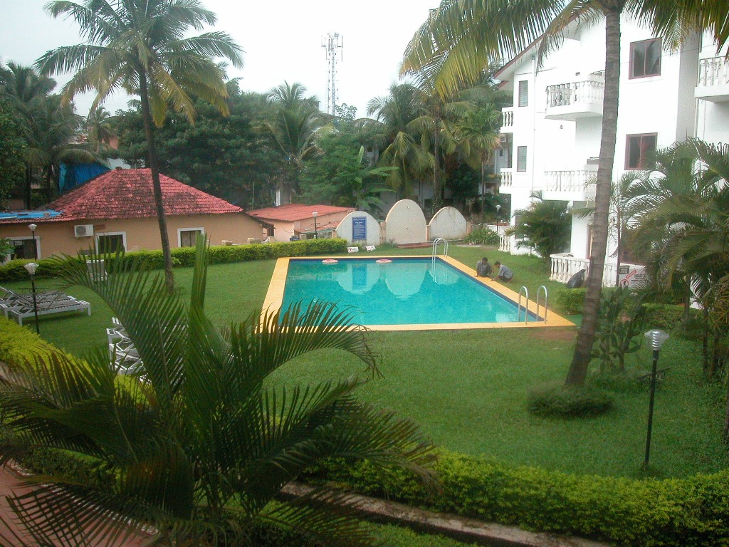 Er bringt mich wie gewünscht nach Calangute, dem Ort, der mir empfohlen wurde. Der Weg führt durch interessante Landschaften, über einen riesigen Fluss, vorbei an einer Werft, aber auch an Beinahe-Slums. Er zeigt mir 3 verschiedene Hotels, am Ende fahren wir zum zweiten zurück, das sagt mir vom Zimmer her und auch von der Anlage am meisten zu und kostet 2500 Rupies pro Nacht.