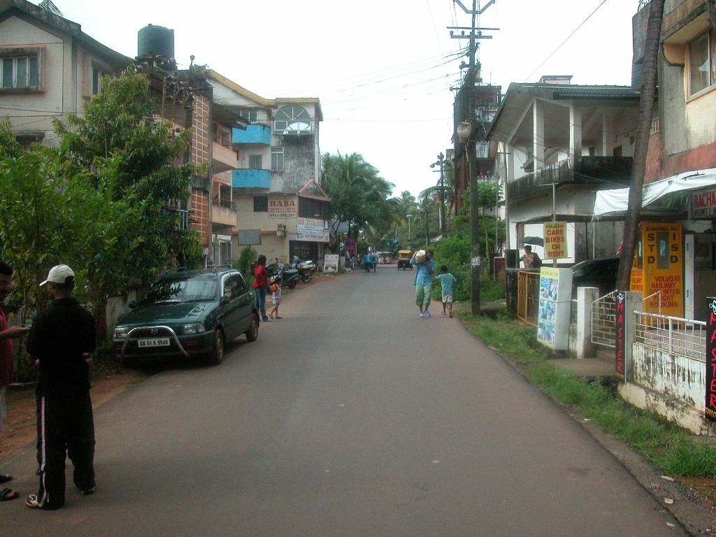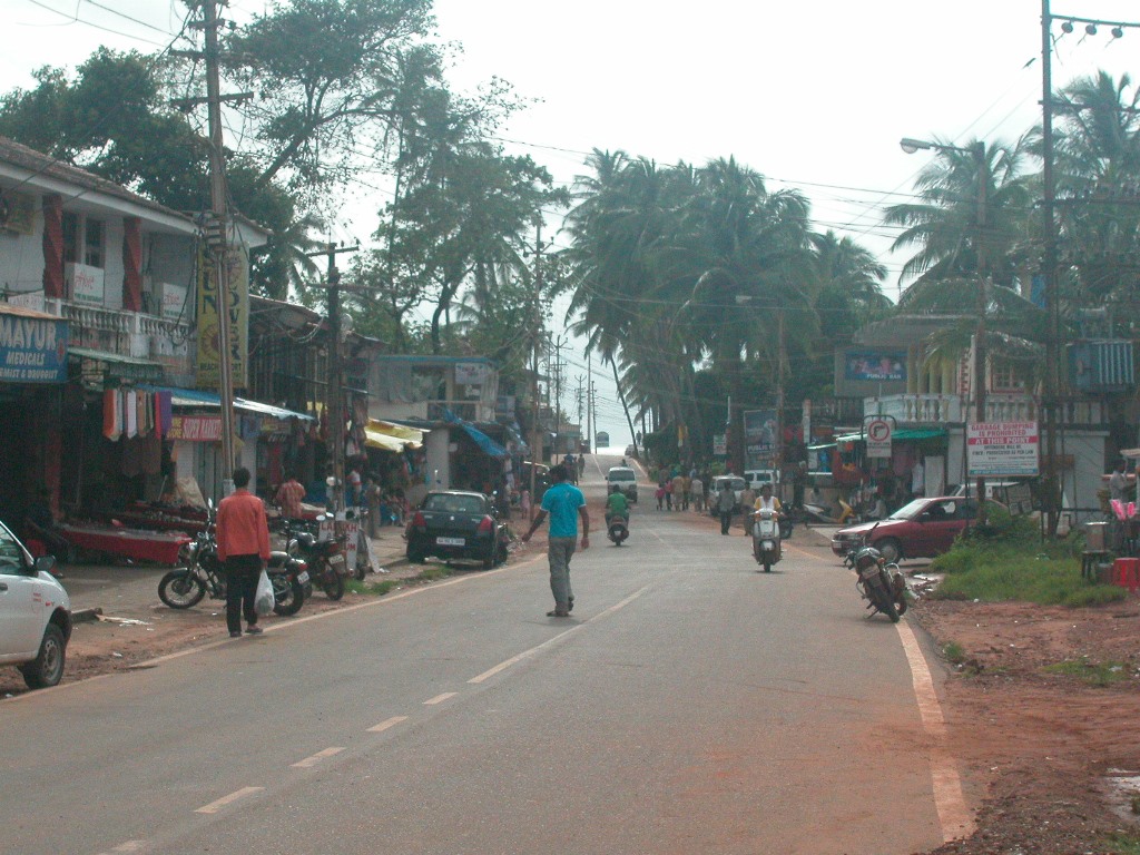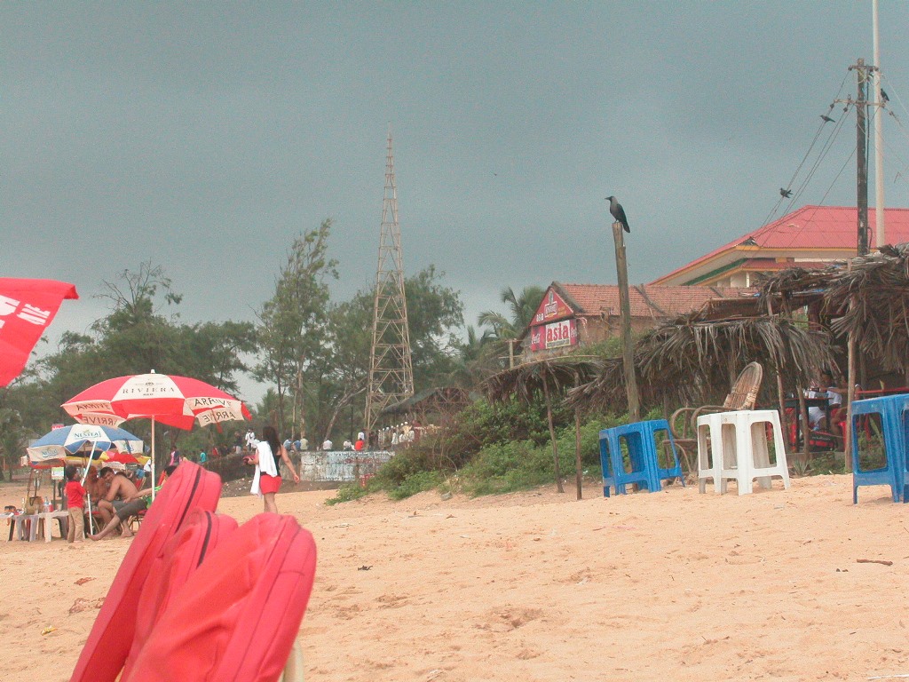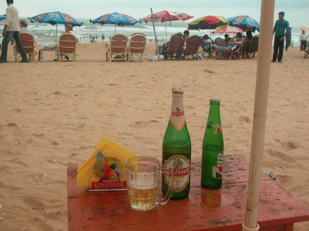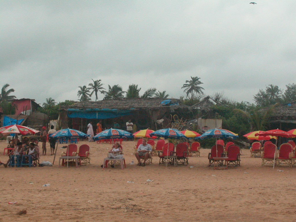 Dann geht’s weiter zur nächsten Strandbar, kurz vor Aufgang in den Ort. Eine Inderin, sehr hübsch, mit kleinem Jungen, stellt vom Nebentisch die üblichen Fragen, und sie empfiehlt mir, die Kirchen von Goa anzusehen. Da kommt auch schon ihr Mann, der sich ein Henna-Tatoo machen hat lassen und unser Gespräch ist zu Ende. Kaum ist das Bier gekommen, fängt es an zu regnen. Alle laufen so rasch wie möglich unters Dach, ziemlich urig hier. Ich habe gleich wieder einen Tisch vor mir, aber nachdem es so schüttet, bleibt das Dach nicht dicht und ich muss noch weiter hinein wandern. Dort komme ich mit einem indischen Paar ins Gespräch, die hier einen Kurzurlaub verbringen. Sie kommen aus Dehli, er hat dort eine Papiererzeugung mit mehr als hundert Mitarbeitern. Ihn fasziniert sofort mein Name, lautmalerisch „Reynold“, weil das eine indische Kugelschreibermarke sei, wie auf sein Nachfragen gleich alle Kellner bestätigen.