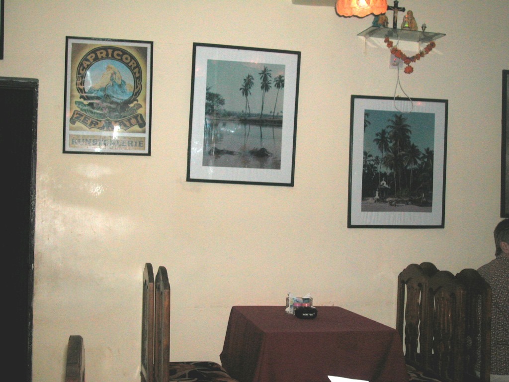 Dann gehe ich Richtung Hotel und versuche noch ein Restaurant zu finden. Da sehe ich ein eher besser wirkendes, die Tische mit roten Tüchern gedeckt und auch sonst sehr gepflegt und sauber. Die Kellner sehen nicht indisch aus, eher koreanisch oder chinesisch. Nachdem mich einer der Kellner fragt, von wo ich komme, frag ich auch und erfahre, dass sie Inder seien, aus Darjeeling, das ist irgendwo im Nordosten von Indien, jedenfalls rund 7 Tage mit dem Zug entfernt. Es scheint, in Goa gibt’s viele Gastarbeiter. Das bestellte Hühnerbrust-Pfeffersteak ist auch lecker. Da entdecke ich etwas Skurriles: an der Wand hängen gerahmt 2 alte Poster mit dem Matterhorn und Zermatt – das ist ein Foto wert.