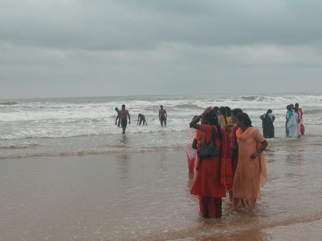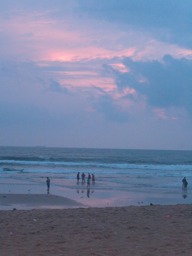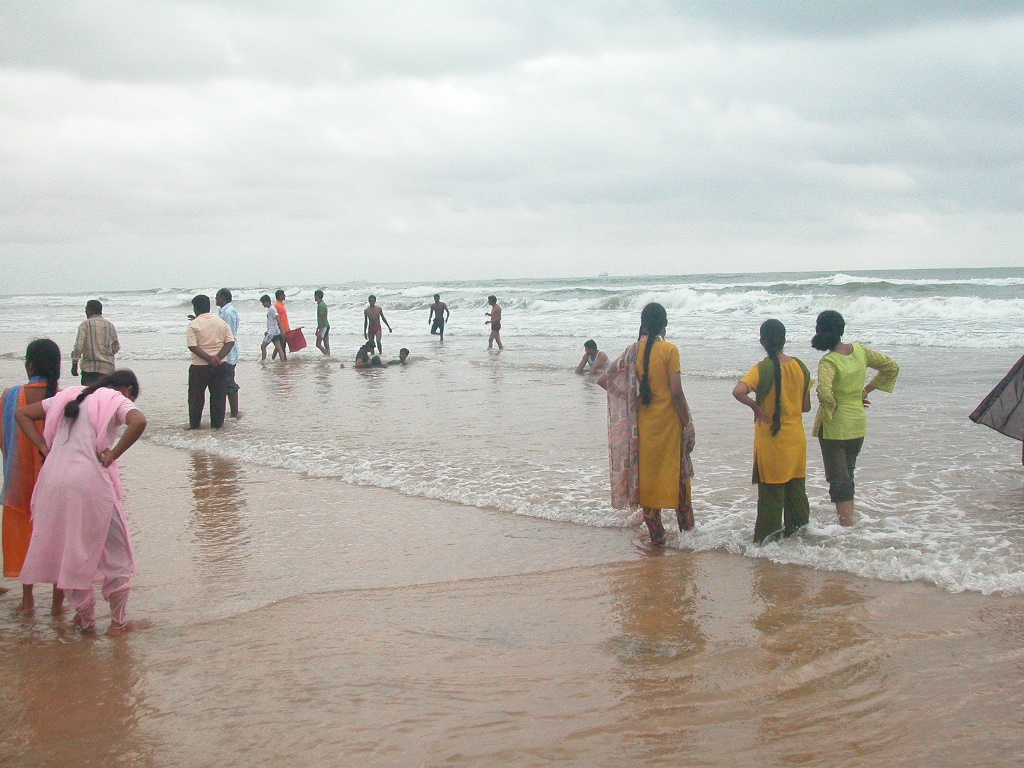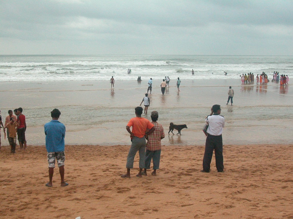 Also rasch hinein in die Short und dann auf zum Strand, es ist zwar nicht gar so schön, es könnte jederzeit regnen, aber das stört bei 30 Grad nicht so. Anders als bei uns liegt hier niemand richtig am Strand, die Leute stehen angezogen herum, marschieren hin und her und gehen voll bekleidet bis zu den Knien ins Wasser. Nur vereinzelt sieht man Männer nur in einer Short. Badehosen und Badeanzüge für die Damen überhaupt sind anscheinend bei den Indern – egal welcher Religion – verboten oder unbekannt.