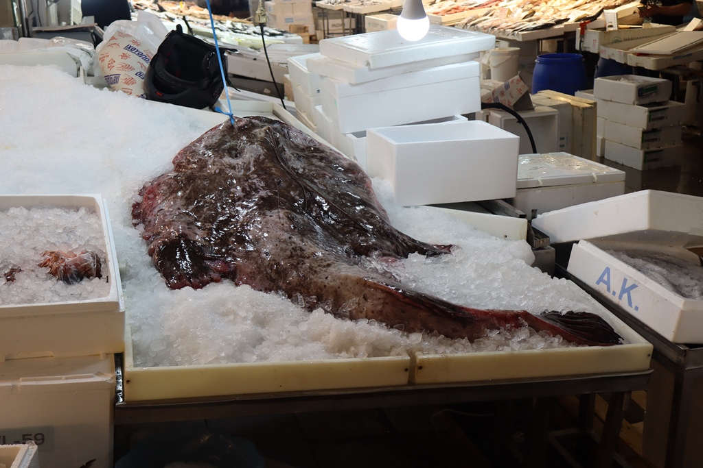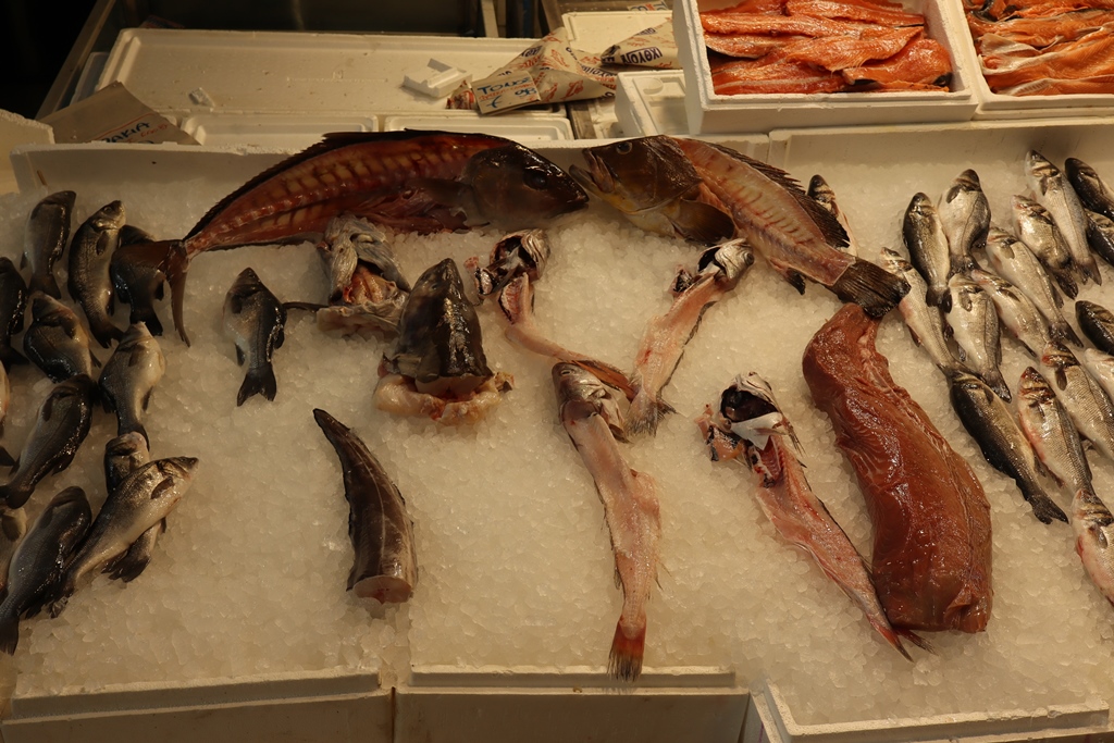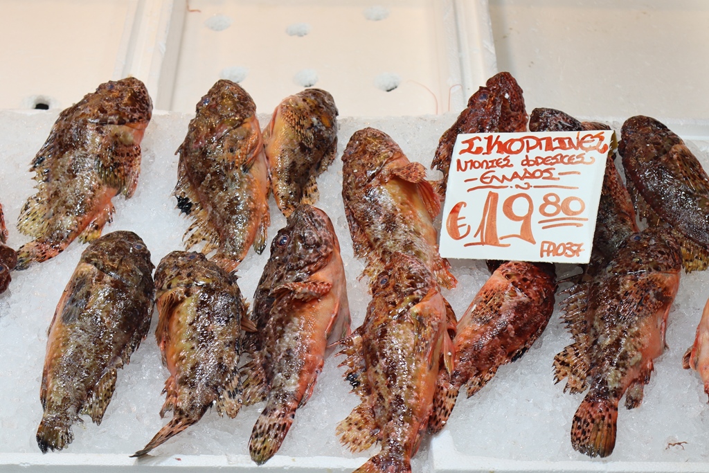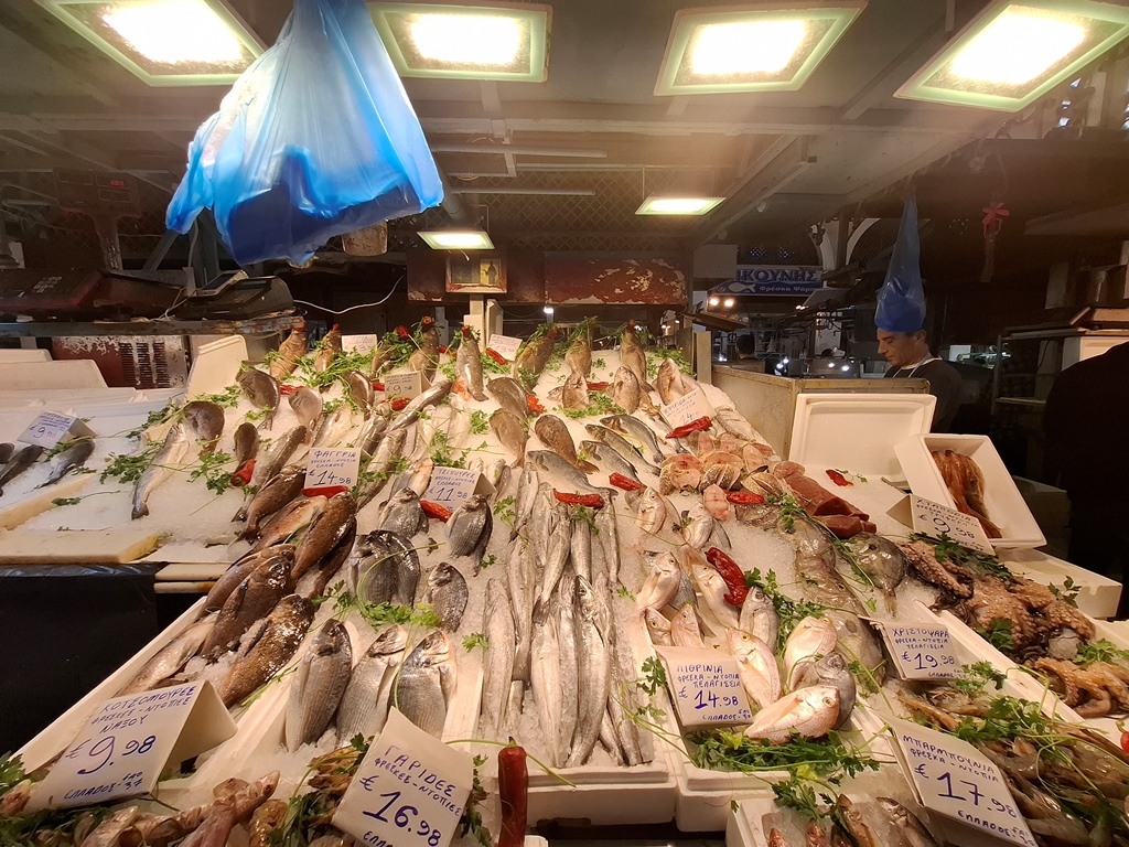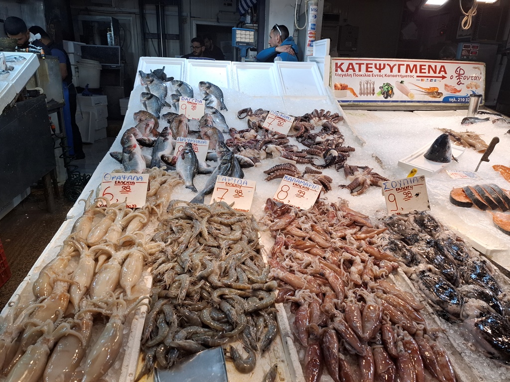 Der Fischmarkt im Zentrum des Gebäudes ist nicht zu übersehen und stinkt zumindest bei den Temperaturen während unseres Besuches im Mai bei weitem nicht so stark, wie es in manchen Internet-Foren bemängelt wird. Die Fische und Meeresfrüchte kommen frisch von den Inseln Naxos, Paros, Skyros, Kalymnos oder Symi.