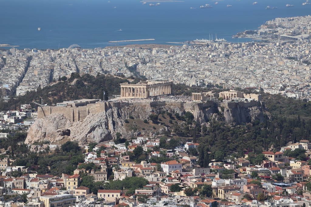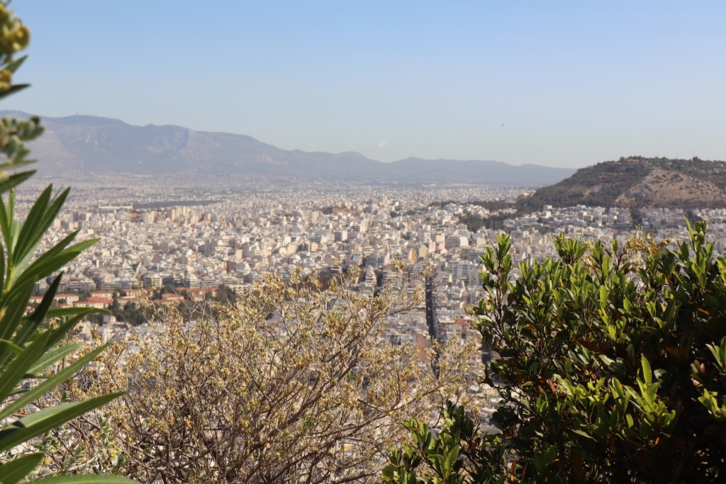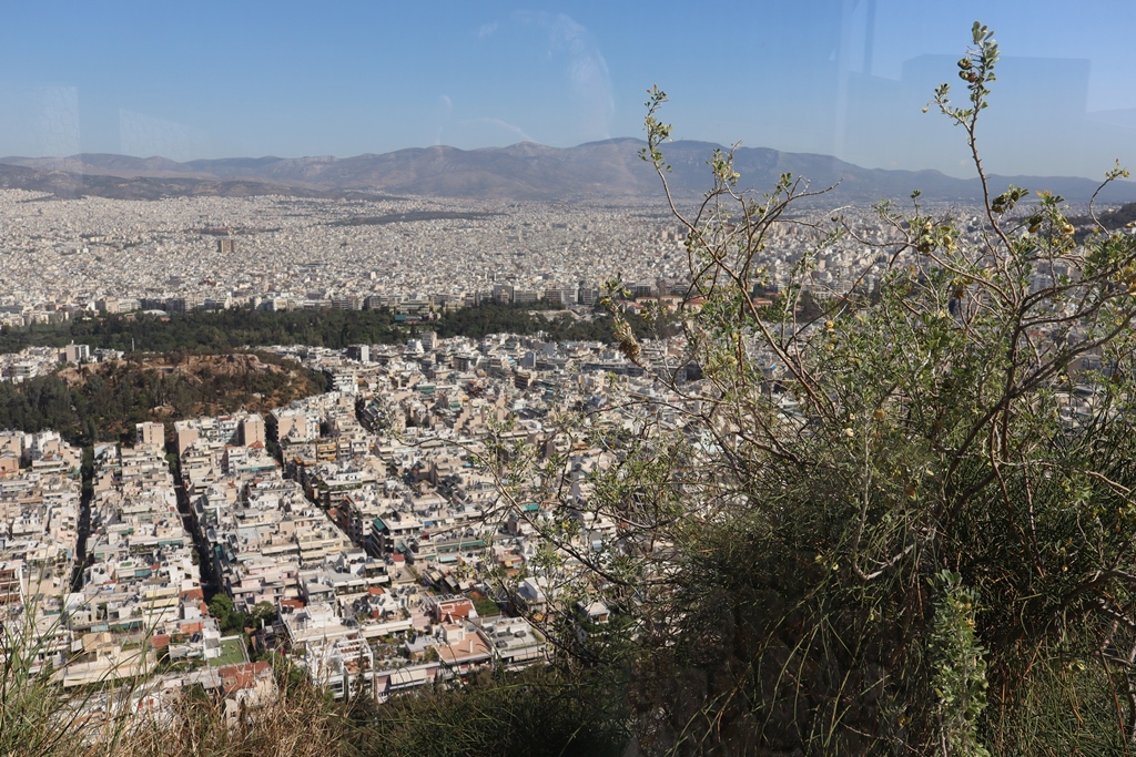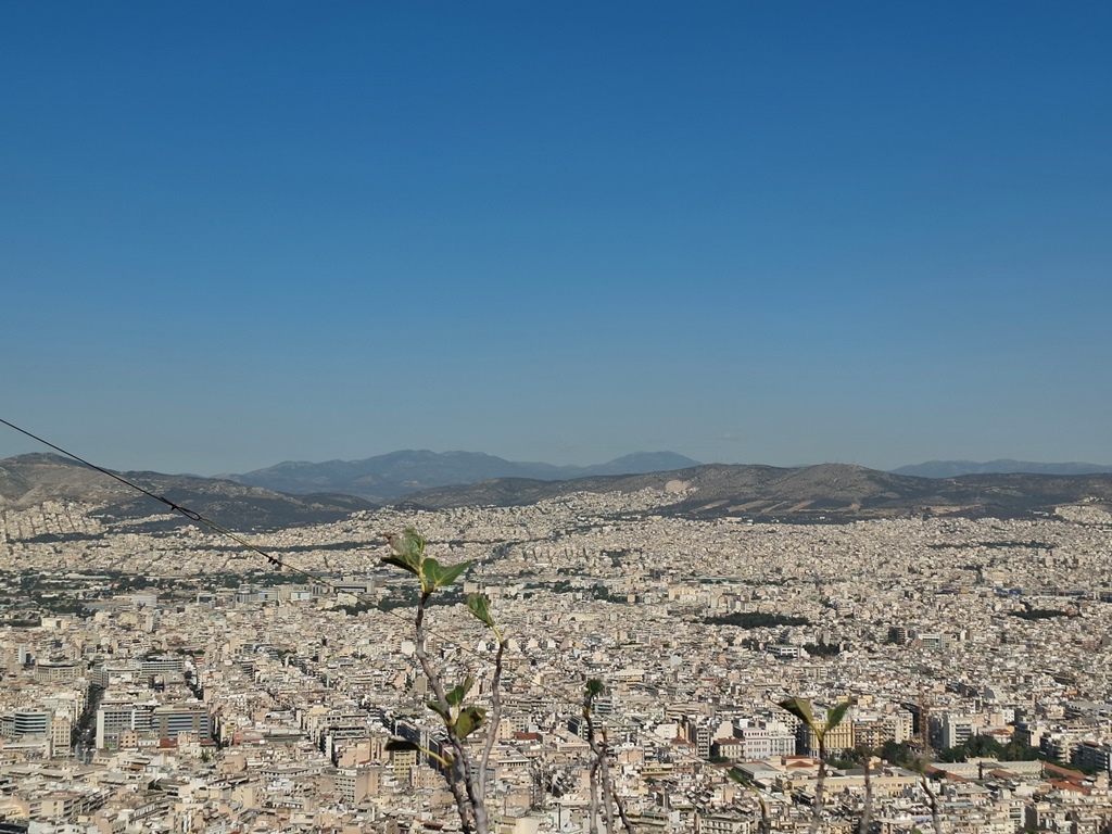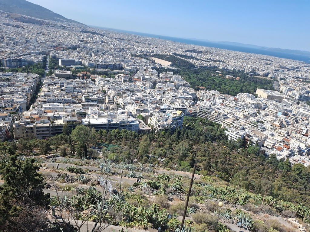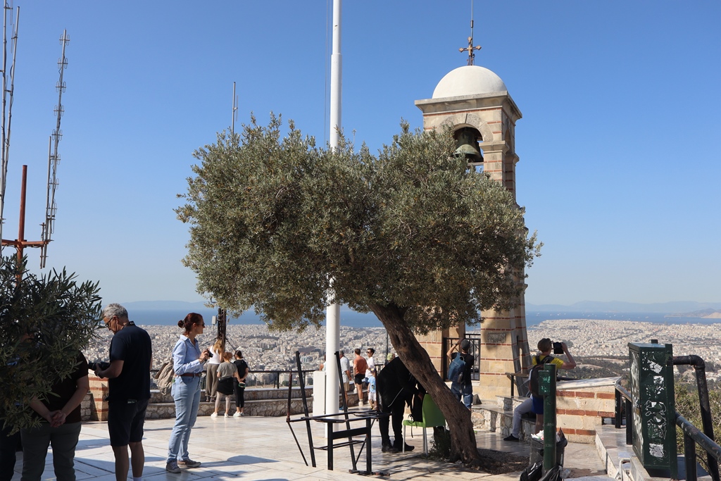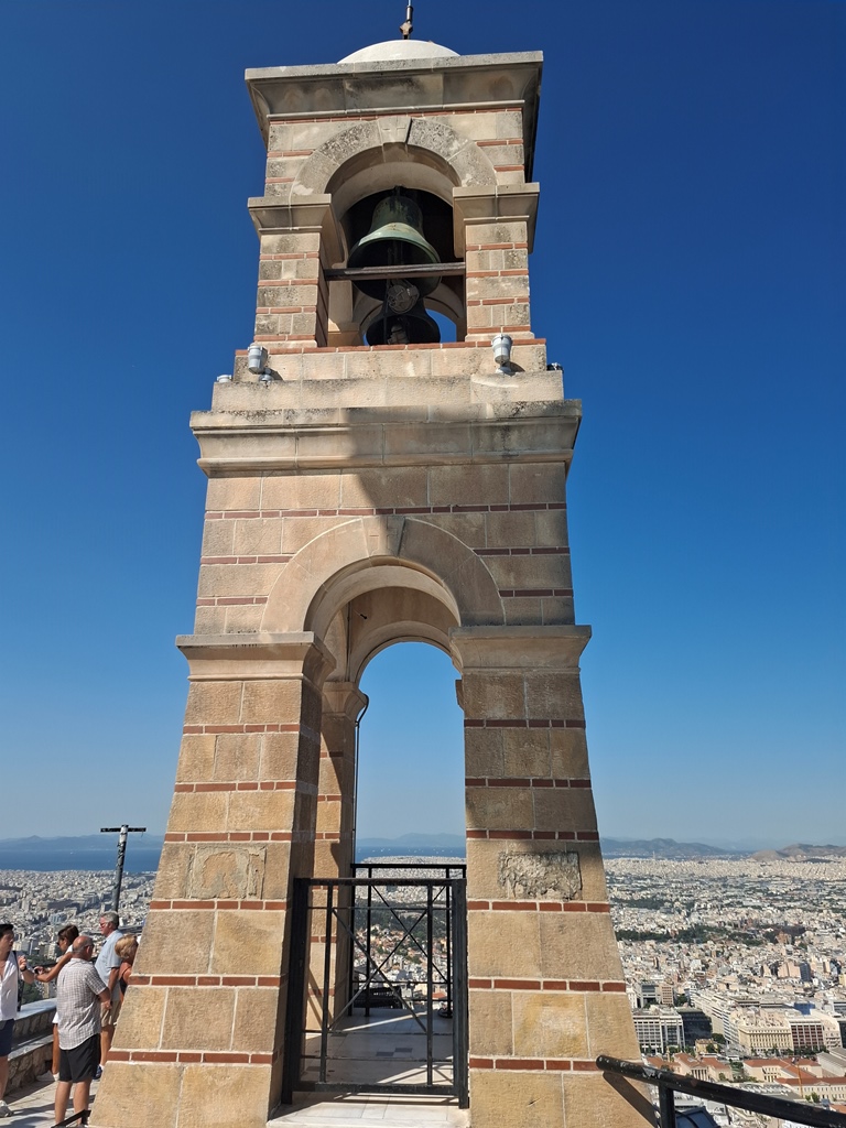 Die Standseilbahn brachte uns in 3 Minuten unterirdisch ca. 210m den Berg hinauf und von der Bergstation sind es dann nur wenige Stufen zur Aussichtsterrasse um die kleine Sankt-Georgs-Kapelle (Ágios Geórgios) mit ihrem Glockenturm. Der Rundum-Blick auf das gesamte Stadtgebiet Athens ist atemberaubend, viele Sehenswürdigkeiten sind zu finden, auf der einen Seite sind hohe Berge erkennbar und auf der anderen Seite fällt der Blick auf den dunkelblauen Saronischen Golf.