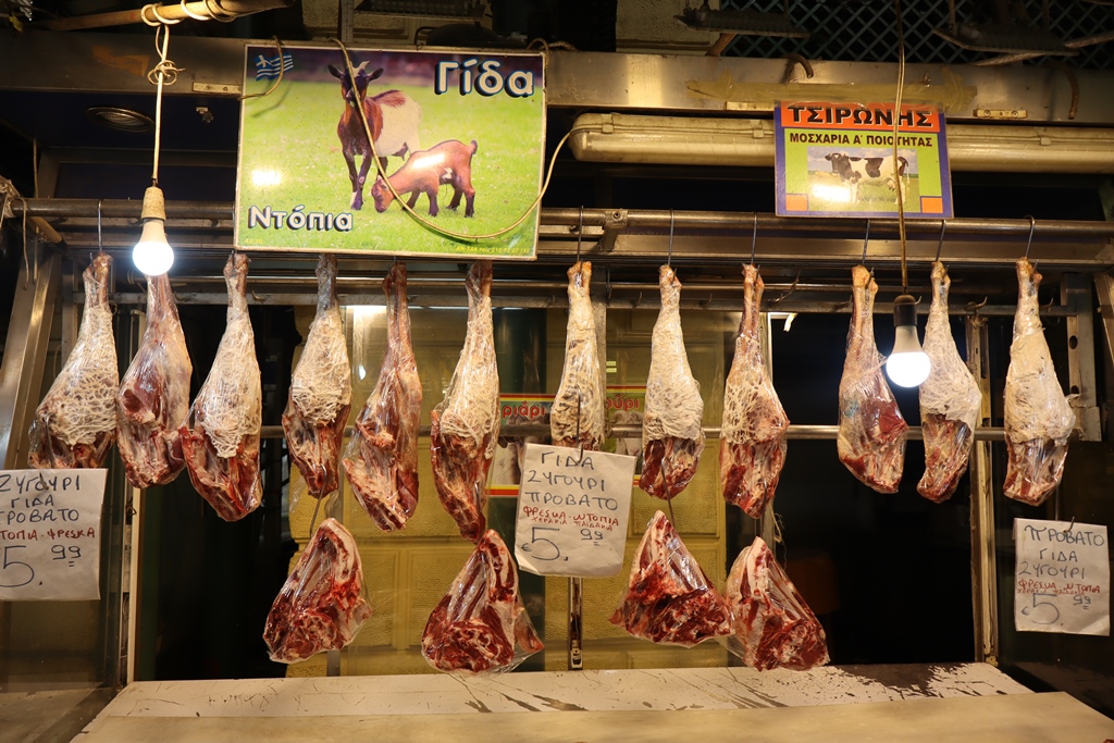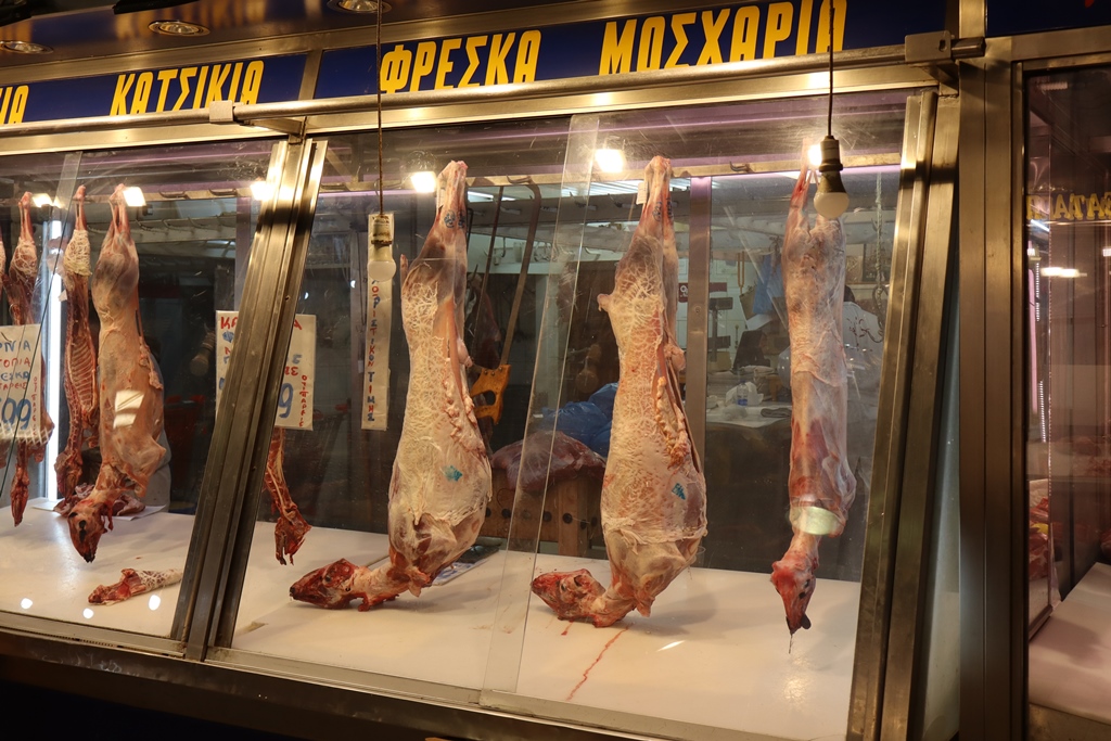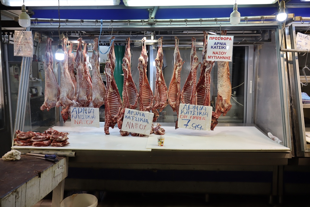 In den gedeckten Gassen Armodiou, Aristogitonos und Filopimenos wird Fleisch angeboten, wobei hier an vielen Ständen die aufgehängten Lämmer-, Schweins- und Rinderhälften vor den Augen der Kunden und Besucher fachgerecht aufgeteilt werden.