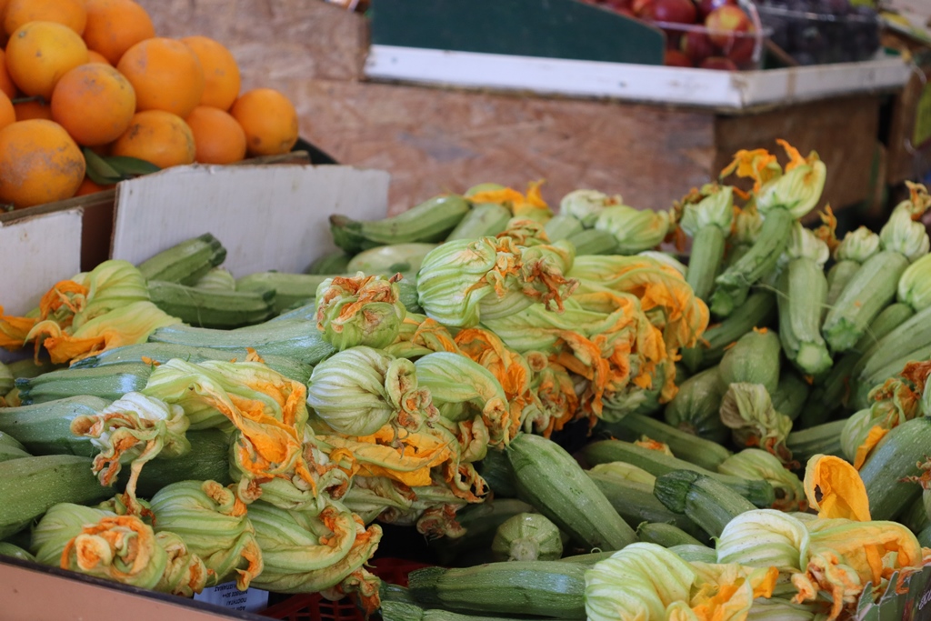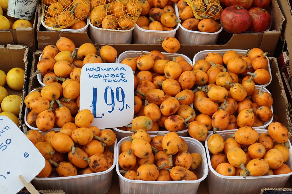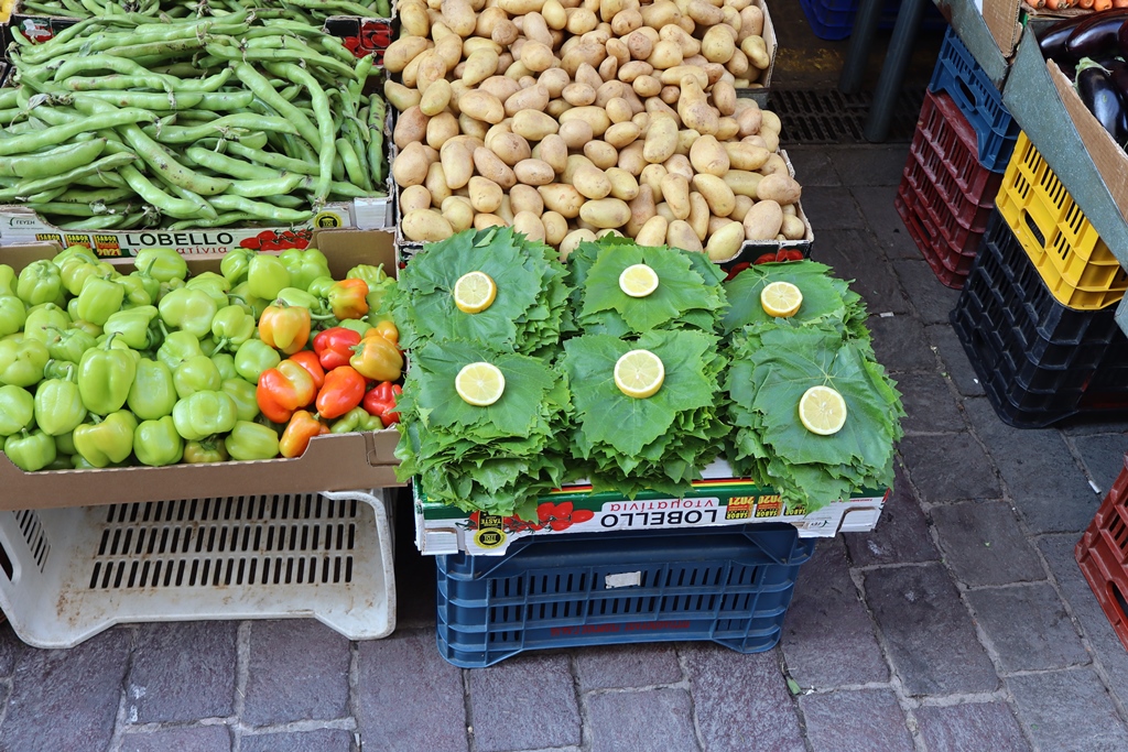 In den Läden ausserhalb dominieren Nüsse, Trockenfrüchte und Gewürze. Gegenüber liegt der Obst- und Gemüsemarkt, wo man alle mediterranen Arten von frischen Tomaten, Melanzani, Granatäpfel, Paprika, und Hülsenfrüchte bekommt. Aber auch Wurstwaren, Käse und regionale Spezialitäten wie z.B. Honig werden hier angeboten.