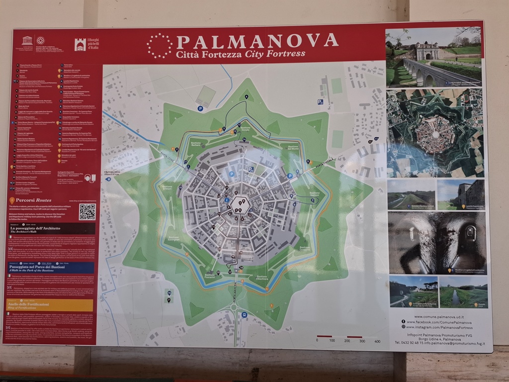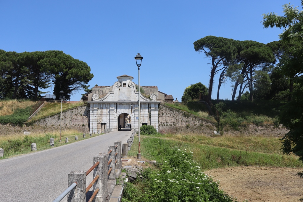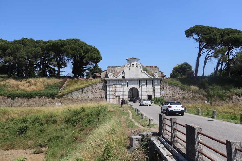 Hier gibt es nicht so viel zu erzählen, außer dass wir bei Merlana unabsichtlich die Originalroute verlassen haben. Einen weiteren kleinen Umweg haben wir dann noch in Clauiano gemacht, was dazu geführt hat, dass wir über Sottoselva und die Viale Speroni von Osten durch die gerade in Renovierung befindliche Porta Cividale in die Stadt Palmanova gekommen sind, statt auf dem CAAR über die Borgo Udine das westliche Stadttor, die Porta Udine zu nehmen.