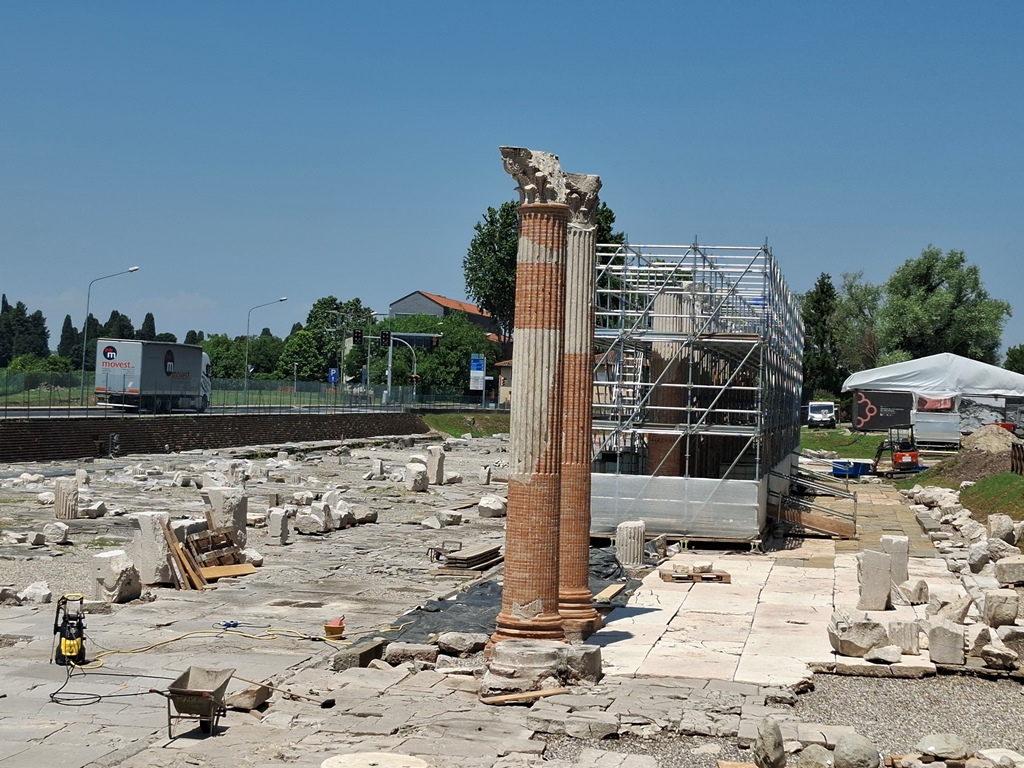 Die Strecke war schnurgerade, nur bei Aquileia wich die Bahn und damit heute auch der Radweg dem Ort aus. Die ersten Ausgrabungen liegen direkt vor dem Ortseingang, das teilweise rekonstruierte Forum Romanum kann hier gratis besichtigt werden. Aquileia war bald nach seiner Gründung 181 v.Chr. der größte Hafen des Mittelmeers und eine der größten und reichsten Städte des gesamten Römischen Reichs, so dass man es das „zweite Rom“ nannte.