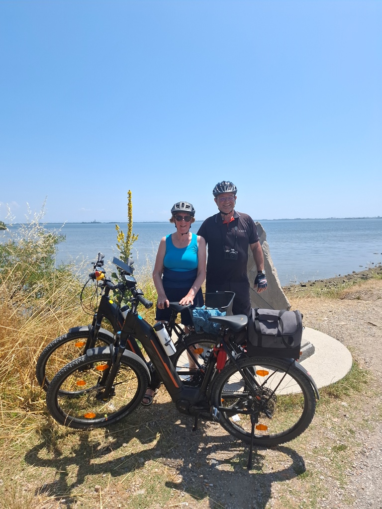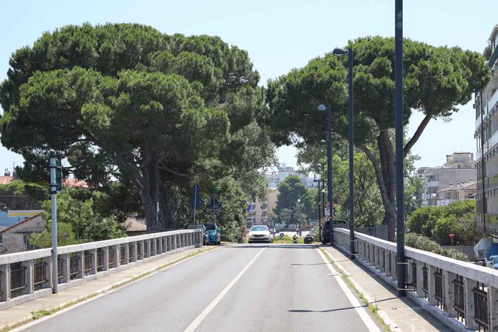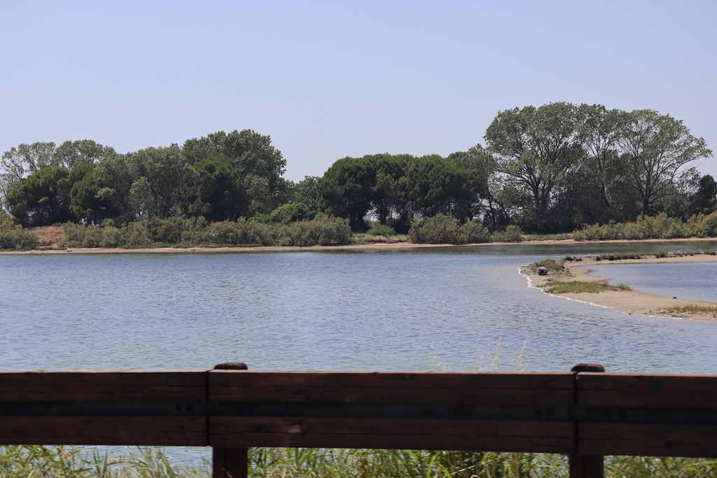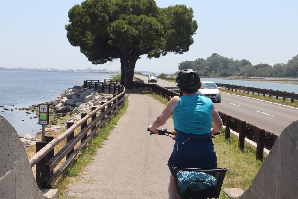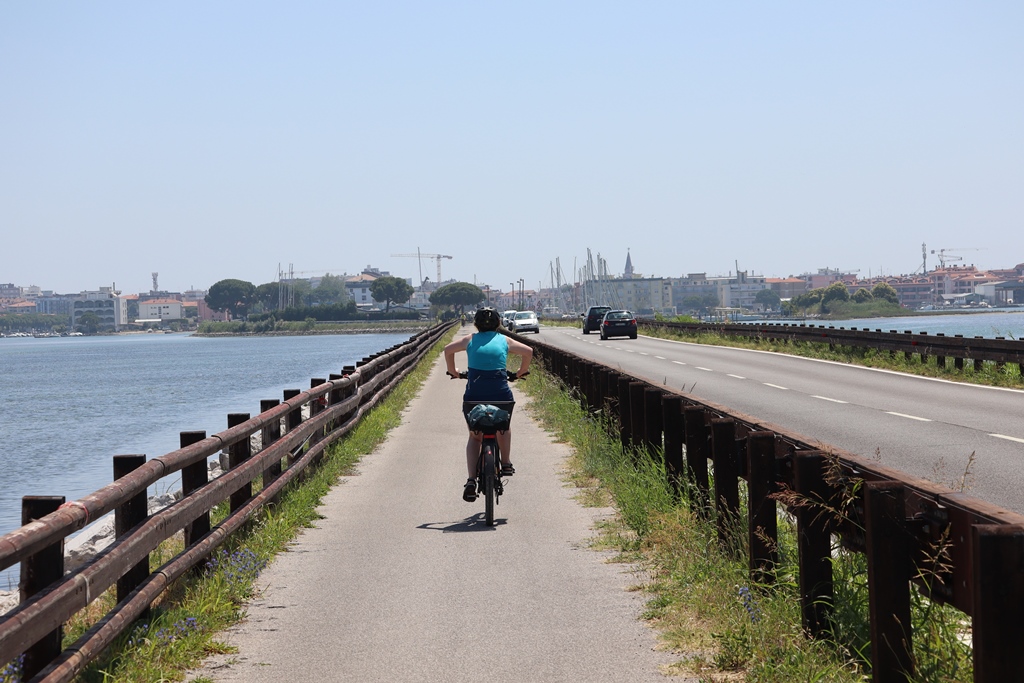 Uns zog es aber bald auf dem neu asphaltierten Radweg weiter Richtung Süden und so erreichten nach wenigen Kilometern den Damm durch die Lagune von Grado. Der Radweg verläuft neben der Straße vorbei an der kleinen Aussichtsplattform mit dem „Welcome to Grado – Baum“ bis zur Brücke vor Grado, wo leider noch ein Stück auf der recht stark befahrenen Straße zu bewältigen ist.