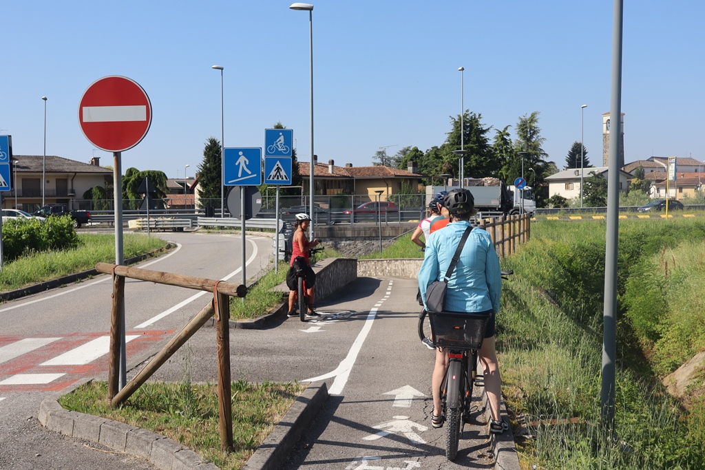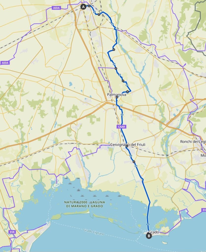 Das Navi leitete uns vom Hotel San Giogio fast im Stadtzentrum zur vorgegebenen Route, meist auf dem getrennten Fahrradstreifen über die Viale Europa Unita, bis zum Verkehrsknoten bei der Porta Aquileia von Udine und beim ersten Schild für den FVG1 Richtung Grado rechts Richtung Süden. Bald wich die Route auf ruhigere Straßen ab und verlief am Rand der Stadt dann über wenn auch nur geschotterte Feldwege.