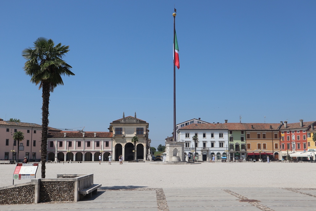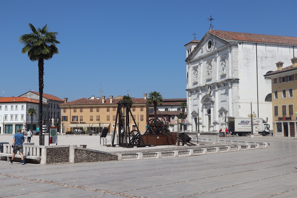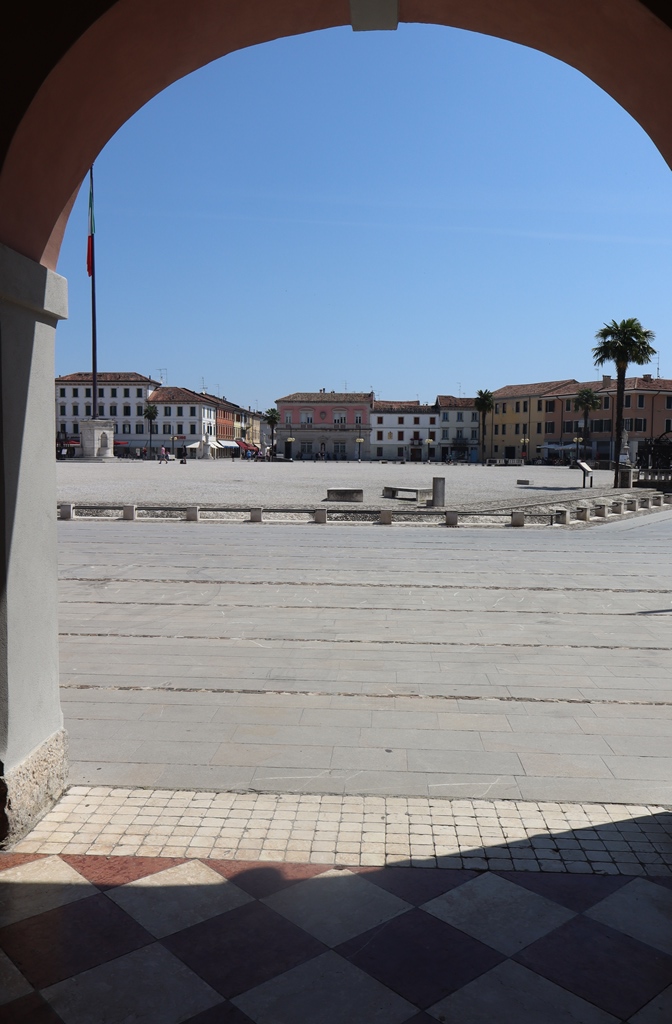 Dazu muss man erklären, wie Palmanova aussieht. Die Stadt wurde Ende des 16. Jahrhunderts als Planstadt mit dem ihr typischen sternförmigen Grundriss mit nur drei Toren angelegt. Als Festungsstadt der Republik Venedig gedacht, war die riesengrosse Piazza Grande als Exerzierplatz geplant, von dem die Soldaten über für damalige Verhältnisse breiten Straßen die Stadt verlassen konnten. Der weiße Duomo del Santissimo Redentore liegt unübersehbar ziemlich genau an der Nordseite des Piazza Grande.