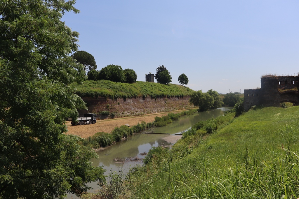 Man könnte hier viele Stunden verbringen, die geschichtsträchtigen Gebäude zu erkunden, aber es ist heiß und so machten wir nur einen Rundgang um diesen riesigen Platz. Nach einem Eiskaffee haben wir dann die Stadt wie geplant durch das dritte Tor, die Porta Aquileia im Süden verlassen. Der Radweg geht nach dem Stadttor unmittelbar in einen Singletrail über, dessen Sinn eigentlich nur darin liegen kann, nochmals einen schönen Blick auf das Tor mit dem Wall und den Graben um die Stadt zu bekommen.