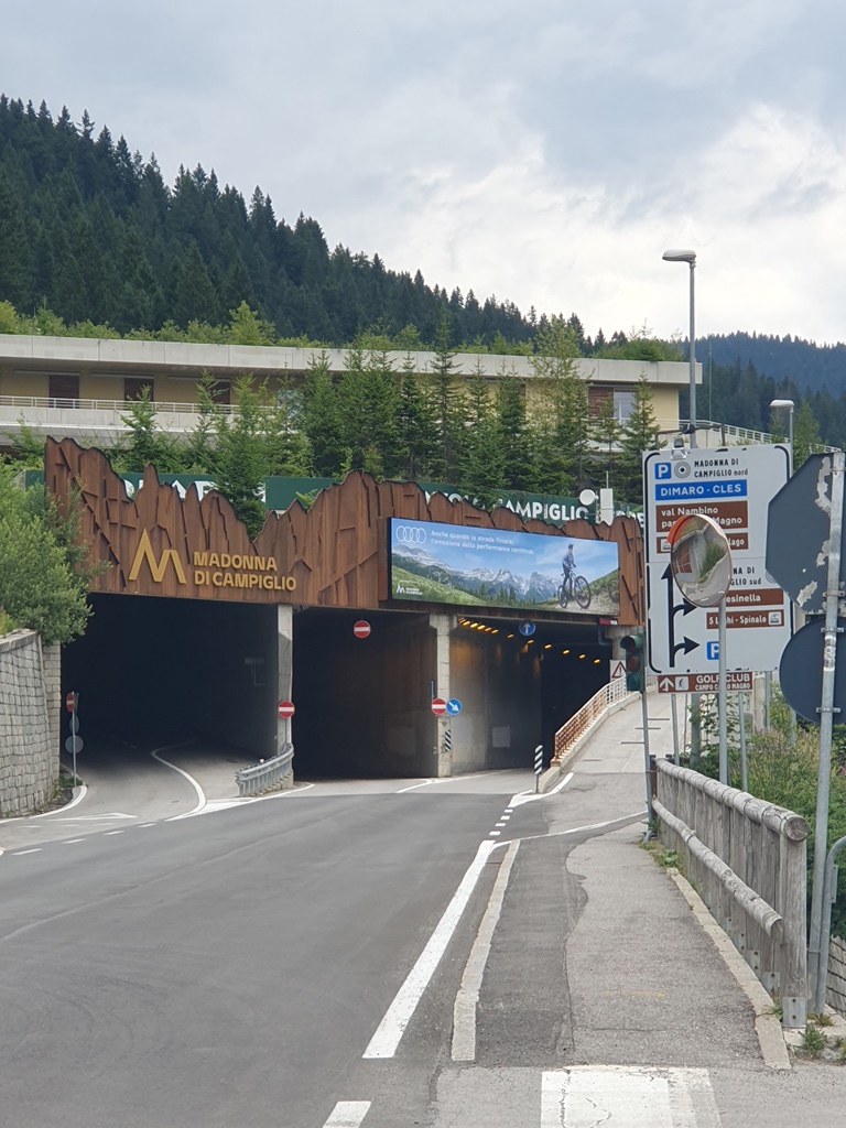 In Ponte Arche erinnerte mich ein Blick auf die Armaturen, dass ich bald tanken sollte, schön dass gleich eine Tankstelle an der Kreuzung lag. Und weiter ging es, jetzt bald wieder Richtung Norden, hinauf nach Madonna di Campiglio und seinen Umfahrungstunnel.