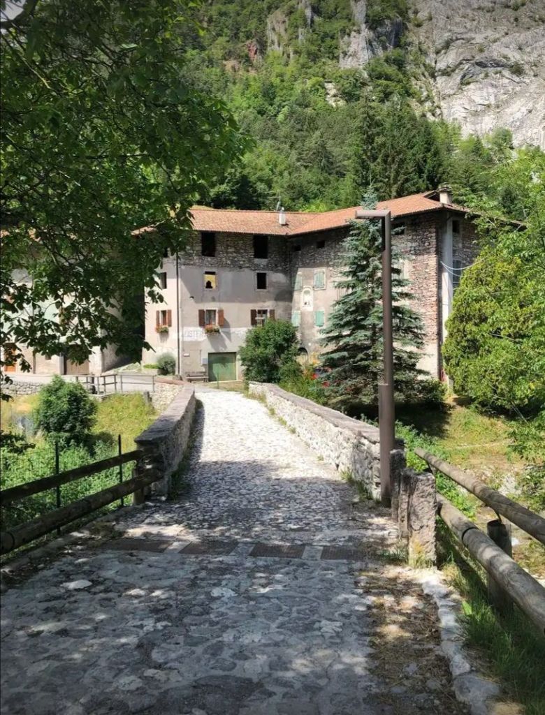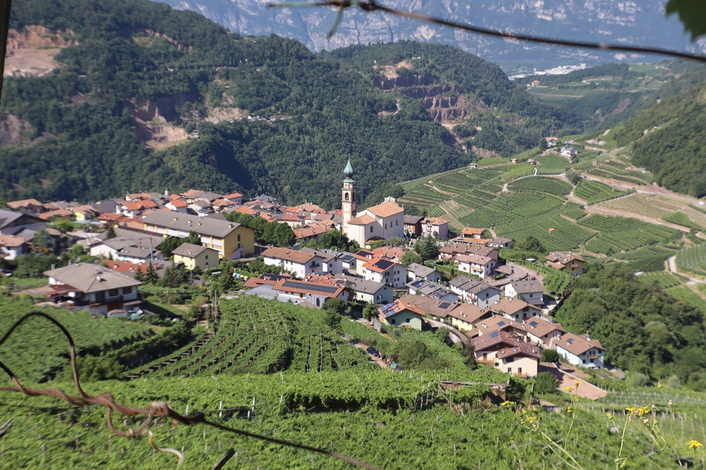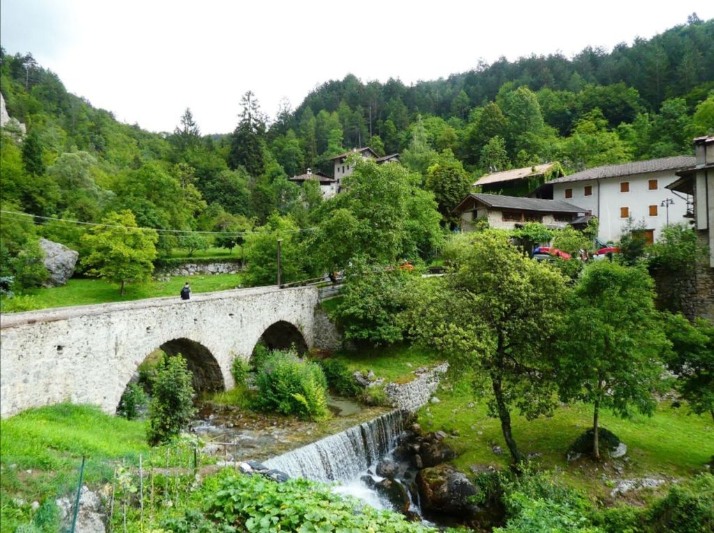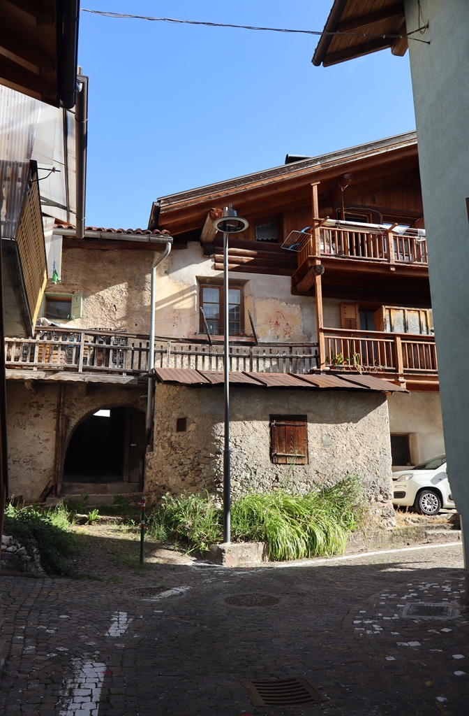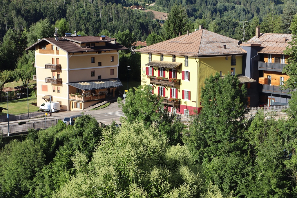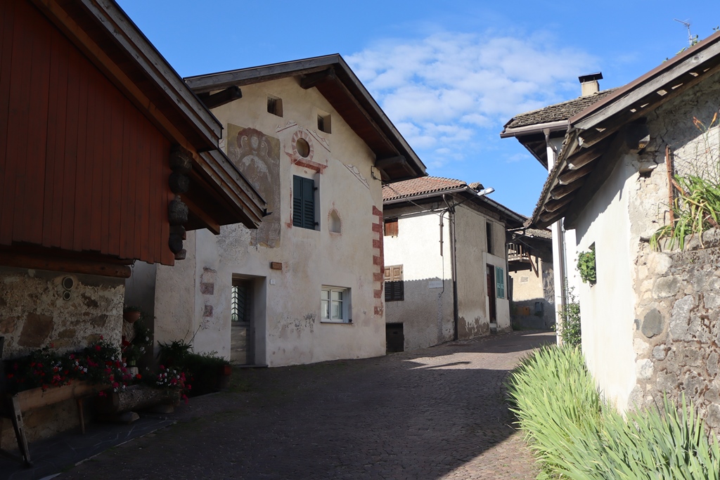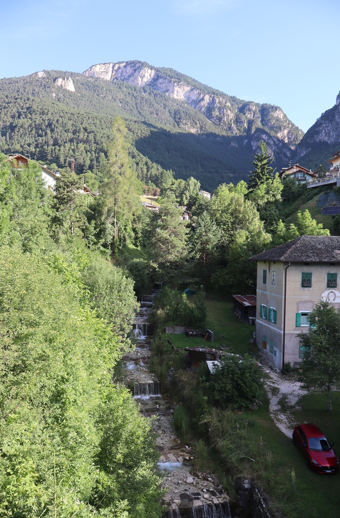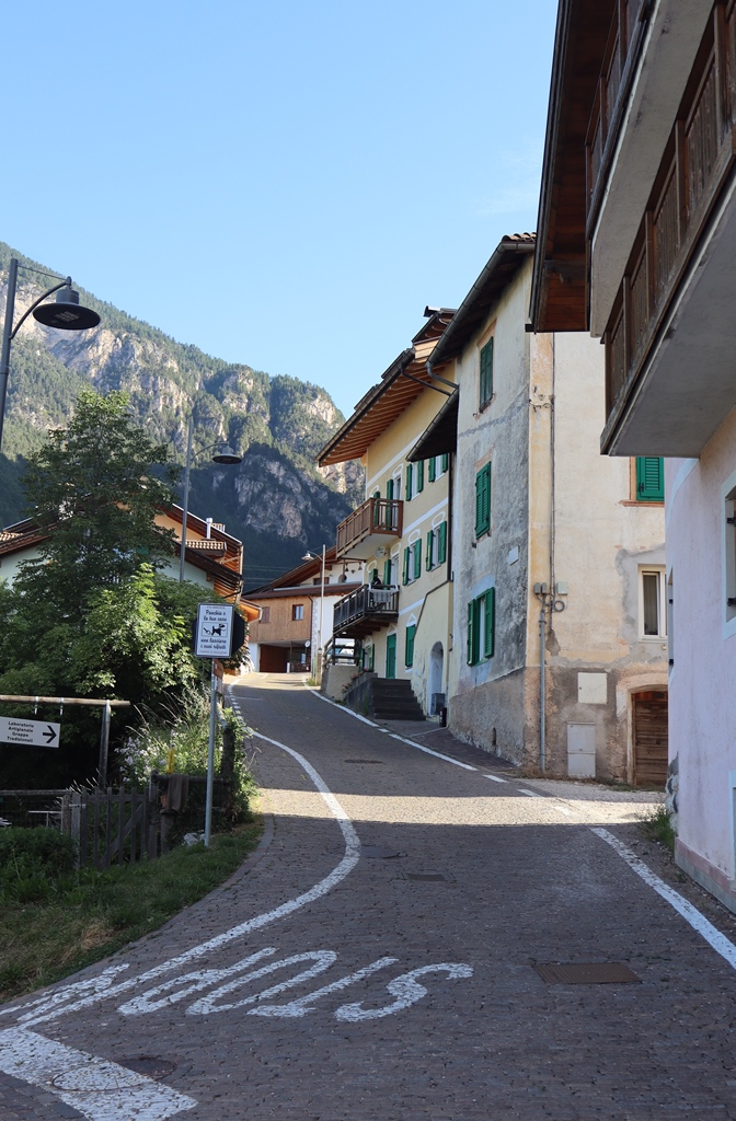 Nach dem Frühstück erkundete ich mit einem Spaziergang noch den kleinen Ort Panchia, da ich ja dann wieder einige Stunden am Motorrad sitzen würde. Die Häuser im Zentrum oberhalb der Kirche sind noch sehr ursprünglich erhalten, wie man sich als Tourist es sich im oberen Trient vorstellt. Der deutsche Name des Dorfes lautet Weißbach, was wieder an den den Berg herunter fliessenden Fluss Rio Bianco erinnert. Auch mein Hotel ist danach benannt.