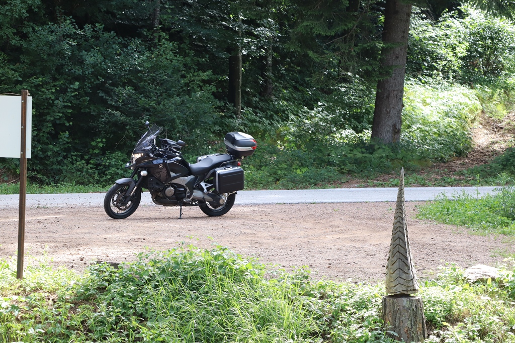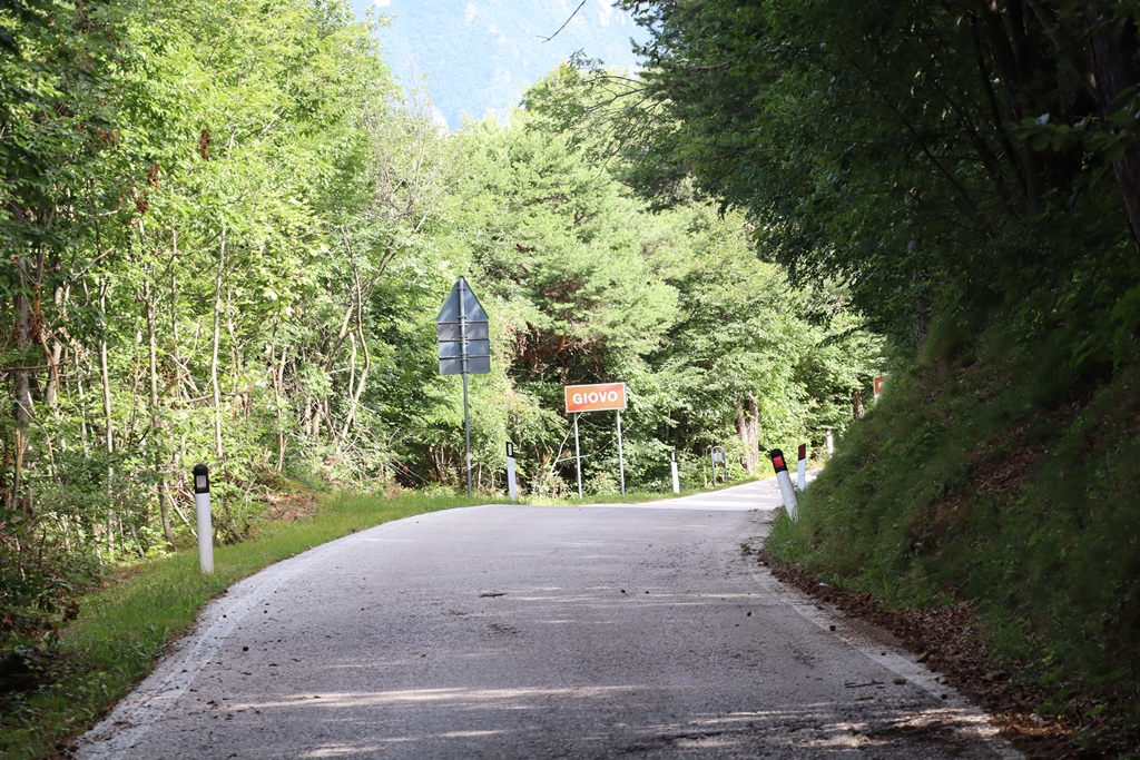 Frisch gestärkt konnte ich nun meine Tour entlang des Sees fortsetzen. Meine Euphorie und mein Motorrad wurden jäh durch eine Straßensperre am Ende des Sees gebremst, der italienische Hinweis auf eine Umleitung lenkte mich nach links auf eine schmale Forststraße, die anfänglich asphaltiert und dazwischen ein paar Mal sandig und lehmig war. Aber weil mir immer wieder ein Auto oder Motorrad entgegenkam, war für mich alles in Ordnung. Die Straße war aber zeitweise so eng und am Hang, dass es unmöglich gewesen wäre, dass ein Auto und ich mit den Seitenkoffern am Motorrad aneinander vorbeifahren hätten können.